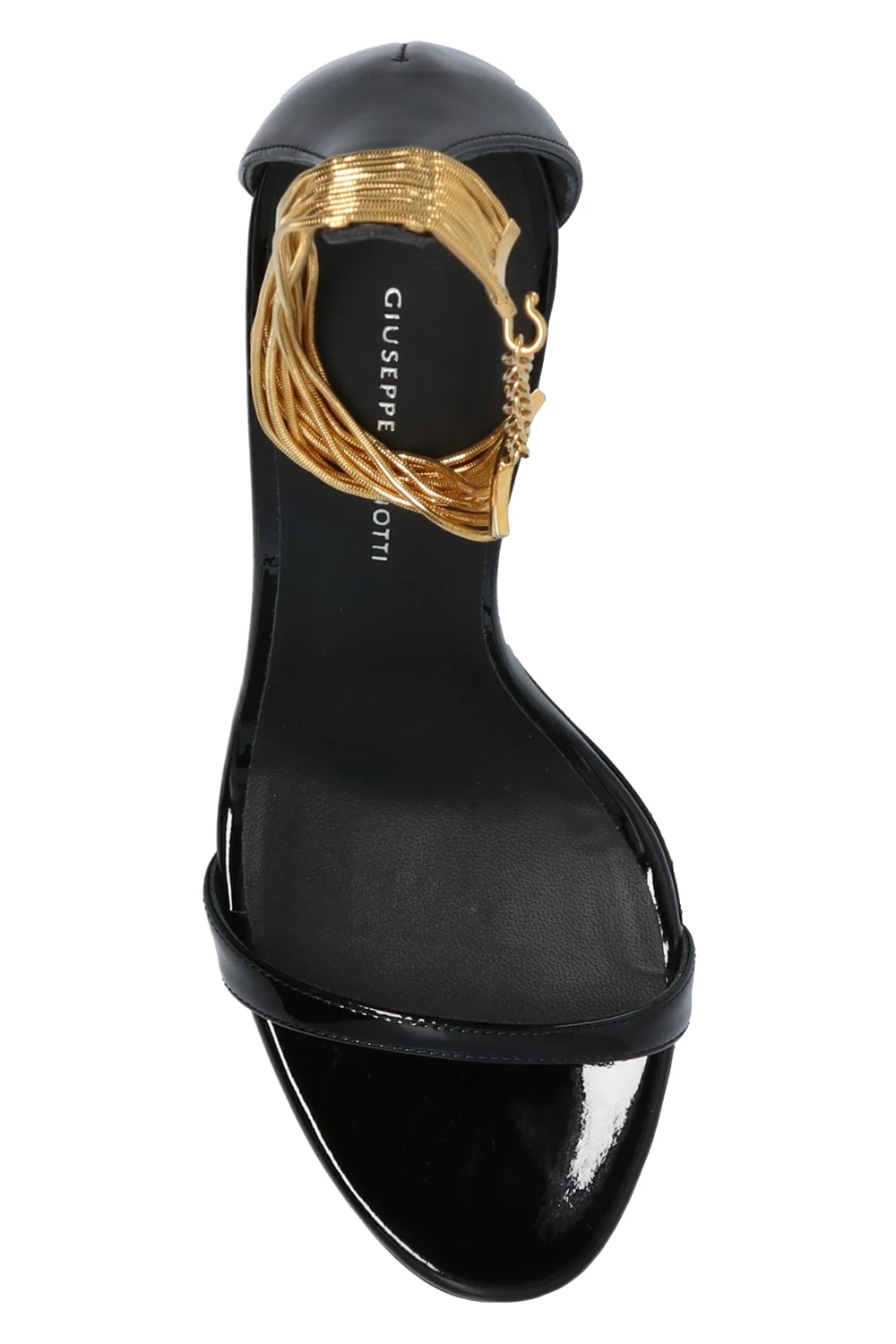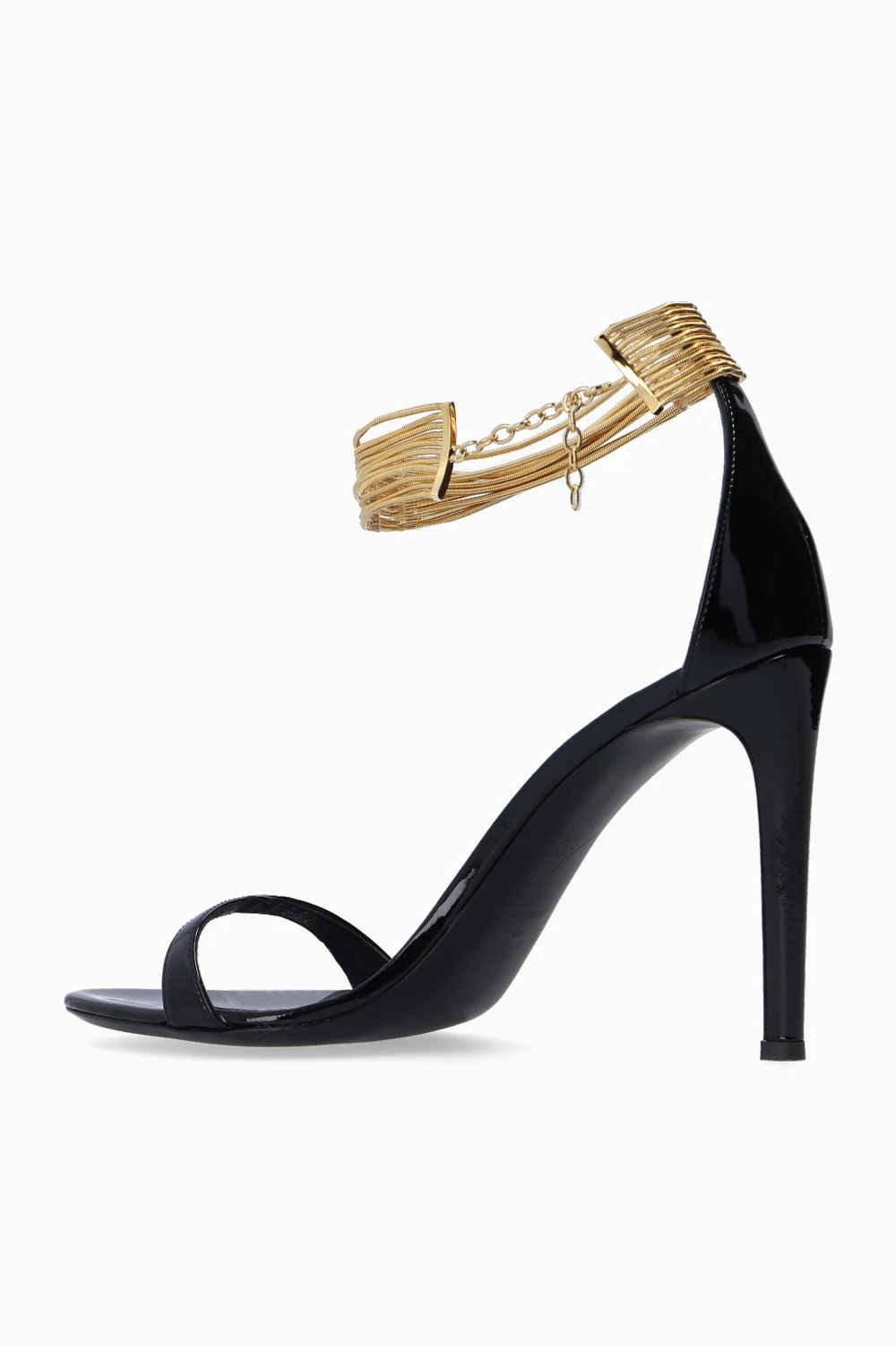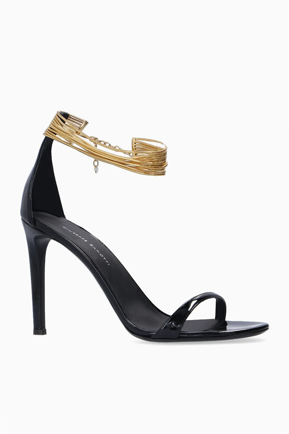 Black 'Kay’ heeled sandals from Giuseppe Zanotti. Made of patent leather, this pair features a distinctive gold-tone fastener at the ankle and black leather sole at the base.