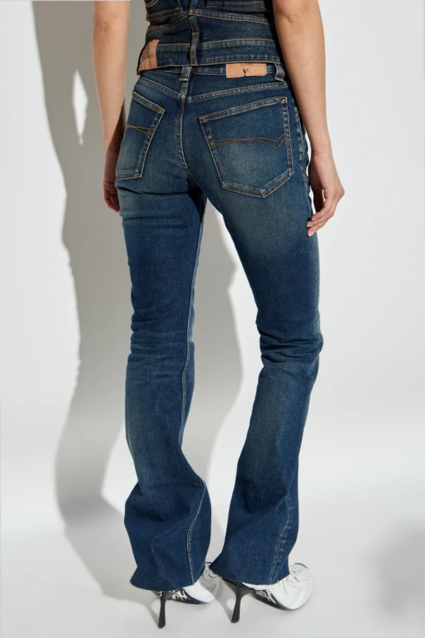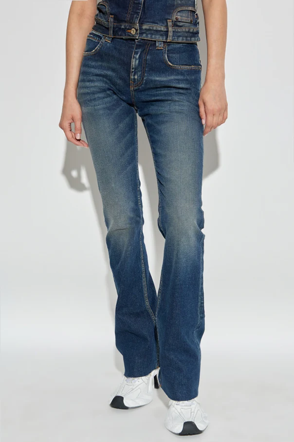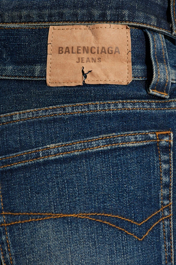 Elevate your wardrobe with these navy bootcut jeans from the exclusive Balenciaga collection. Expertly crafted from pure, premium cotton denim, the jeans showcase a distinctive, rigid texture devoid of stretch, emphasizing their refined structure. The form-flattering silhouette is tailored with a low-rise waist and gracefully contoured hips and thighs, culminating in bold, flared legs enhanced by delicately frayed hems. Subtle fading on the thighs and knees imparts a modern, sophisticated vintage allure.