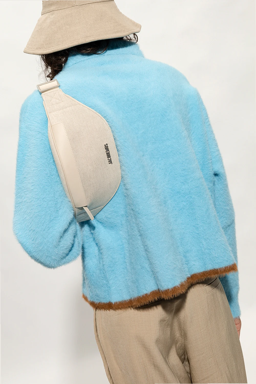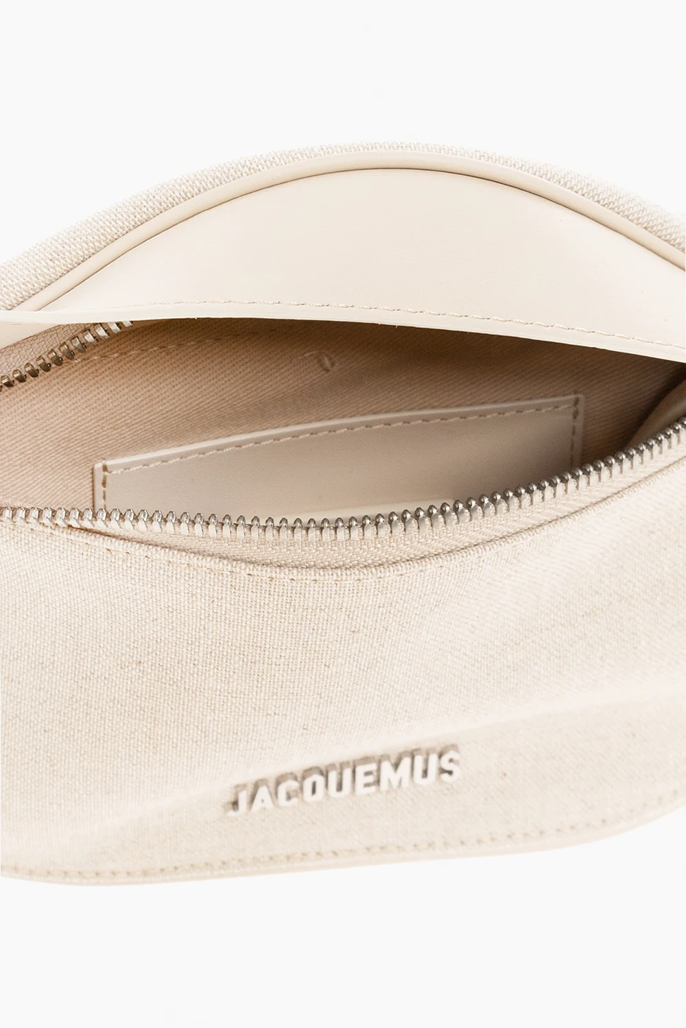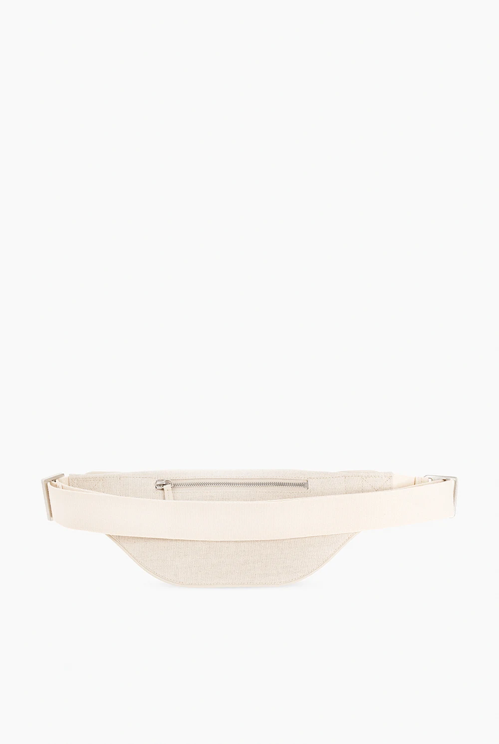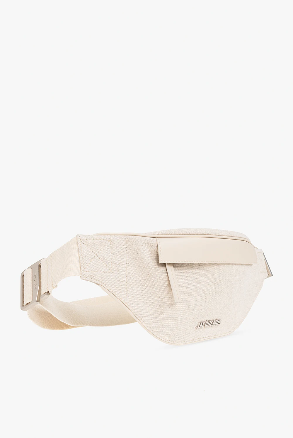 Cream ‘Le Banane Meunier’ belt bag from Jacquemus. Crafted from canvas and trimmed with leather, this design features a zip fastening, a silver-tone logo plaque, an adjustable strap, a back zip pocket and one internal compartment with a card slot.