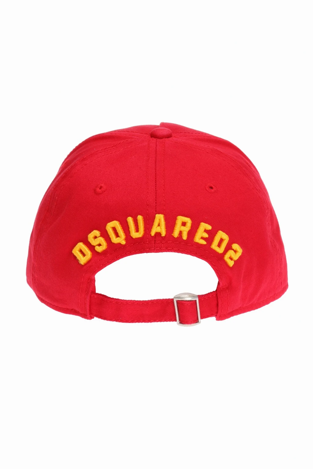 Red distressed cotton baseball cap from Dsquared2. Decorated with embroidered yellow lettering with logo. Adjustable strap with antiqued silver-tone buckle at back.