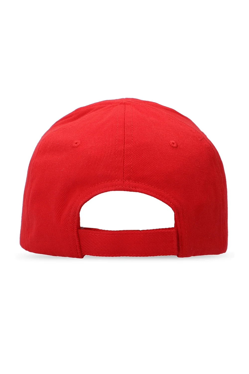 Red baseball cap from Balenciaga. Embroidered with Balenciaga logo in black, this cotton-crafted piece of headwear is complete with a velcro strap on the back.
