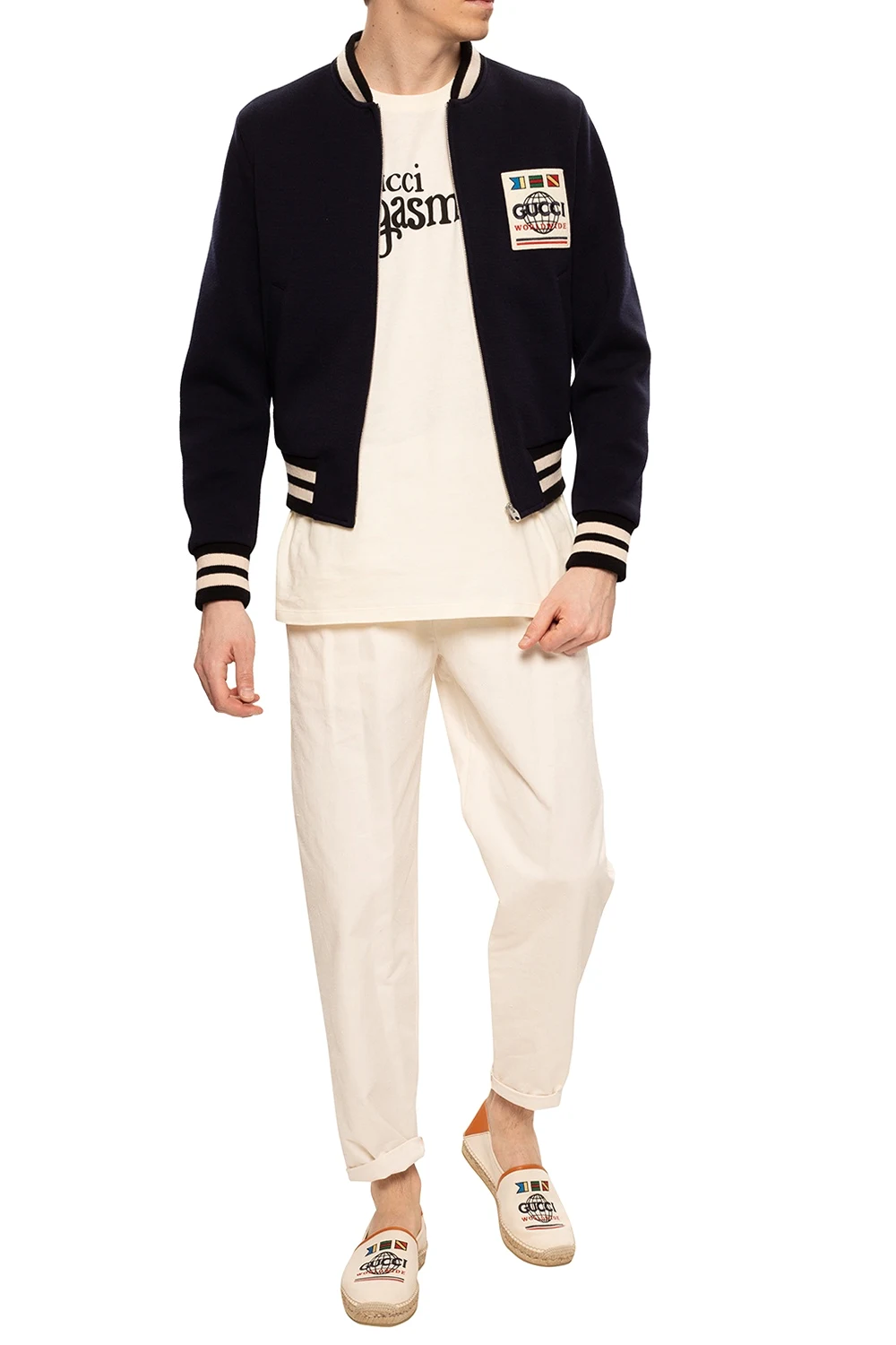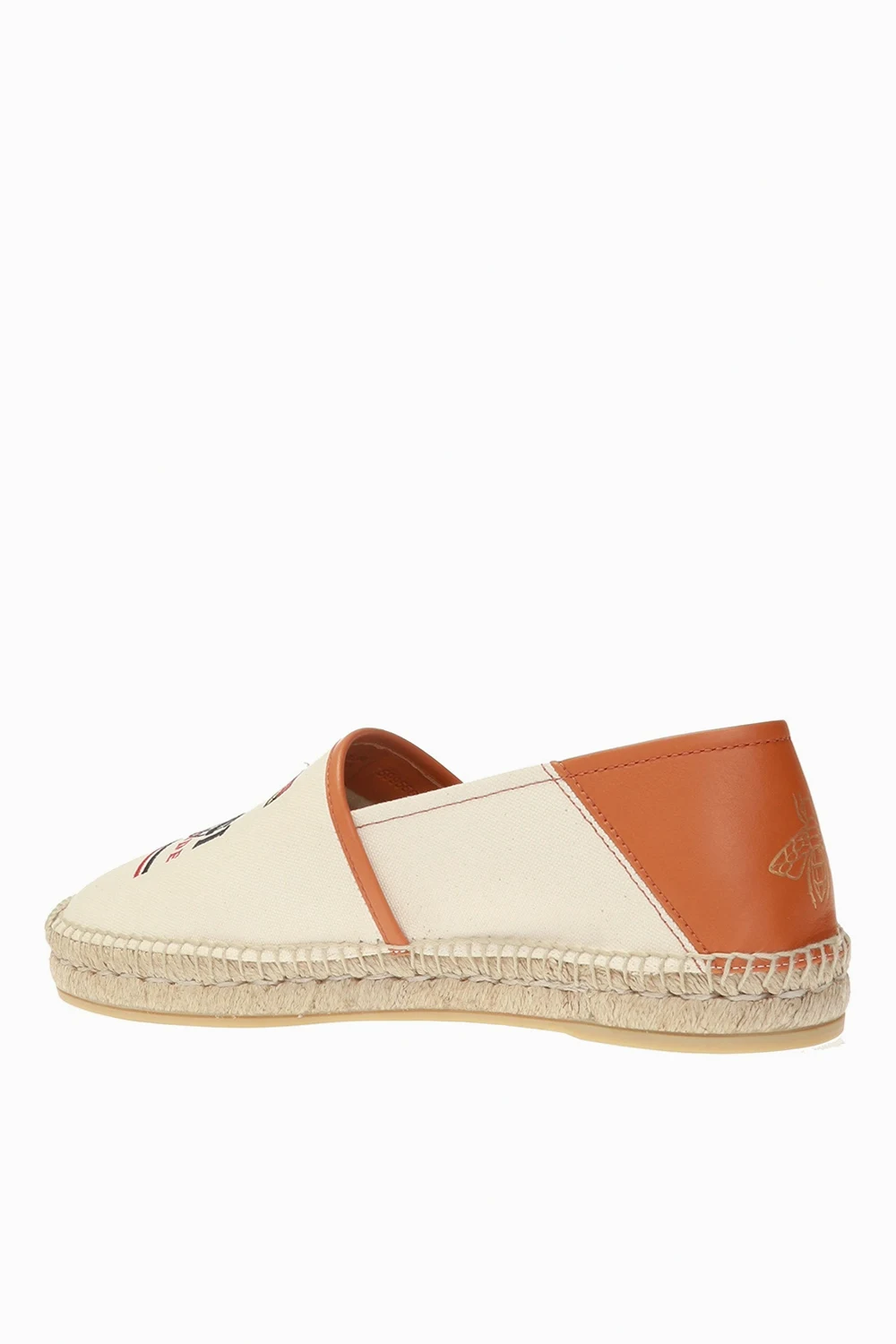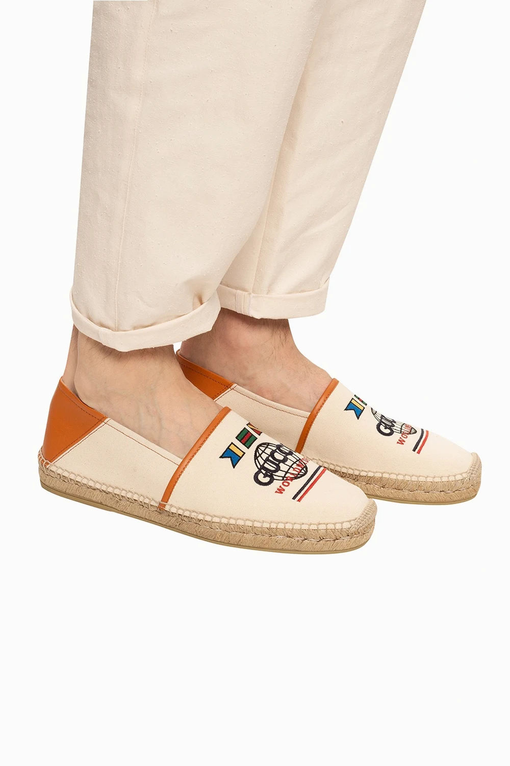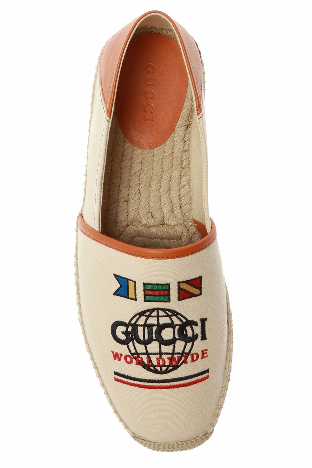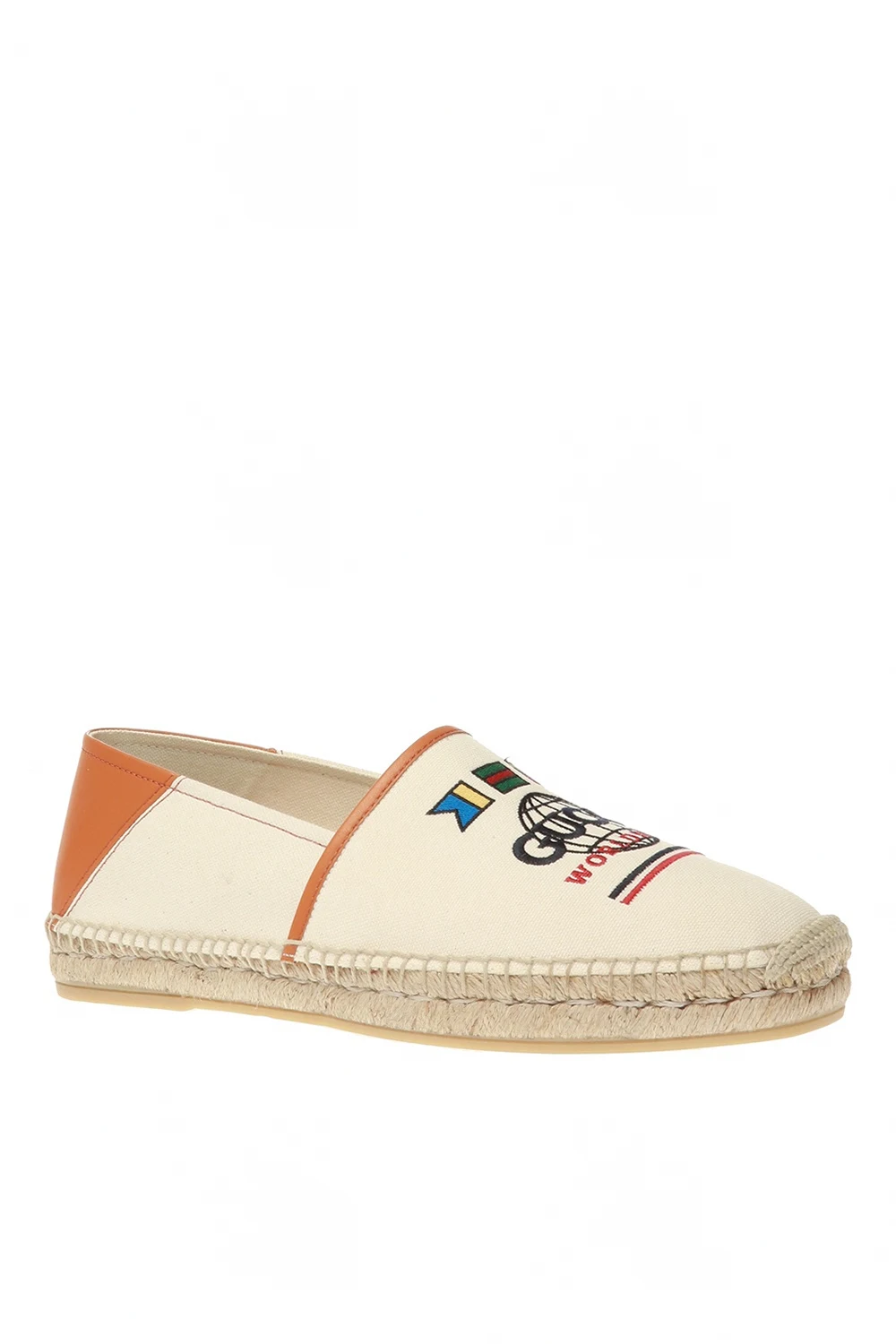 Beige and brown espadrilles from Gucci featuring leather trims, colourfully embroidered logo and cream rubber sole.