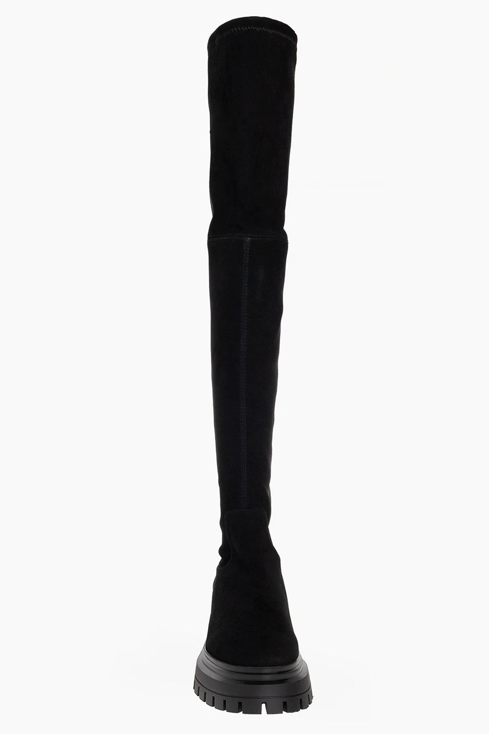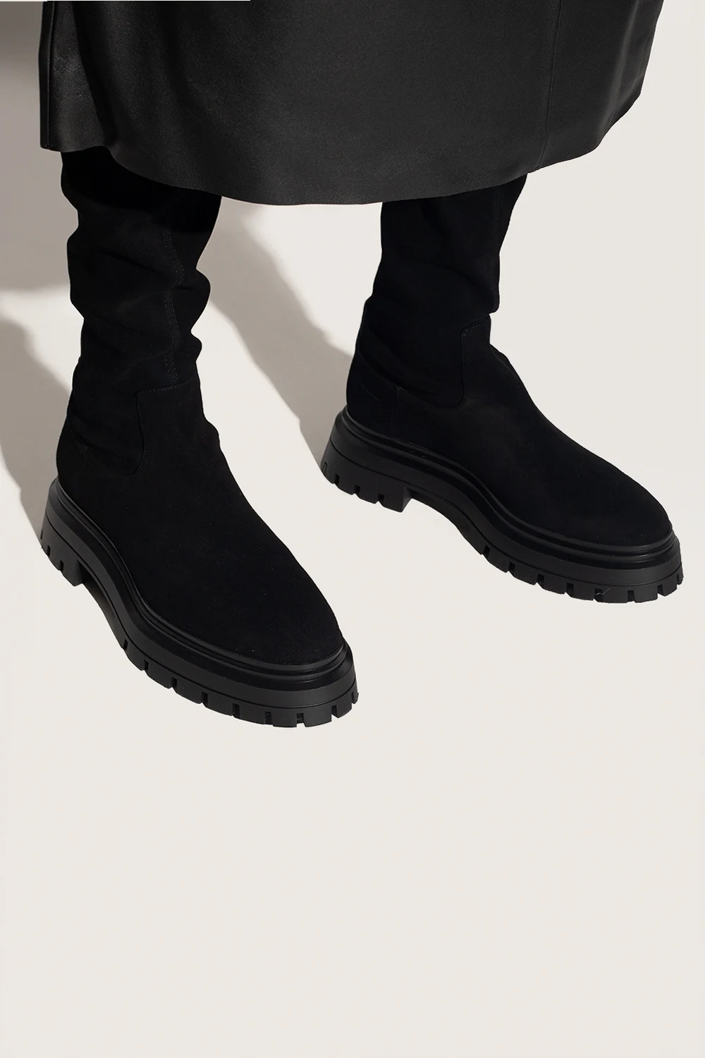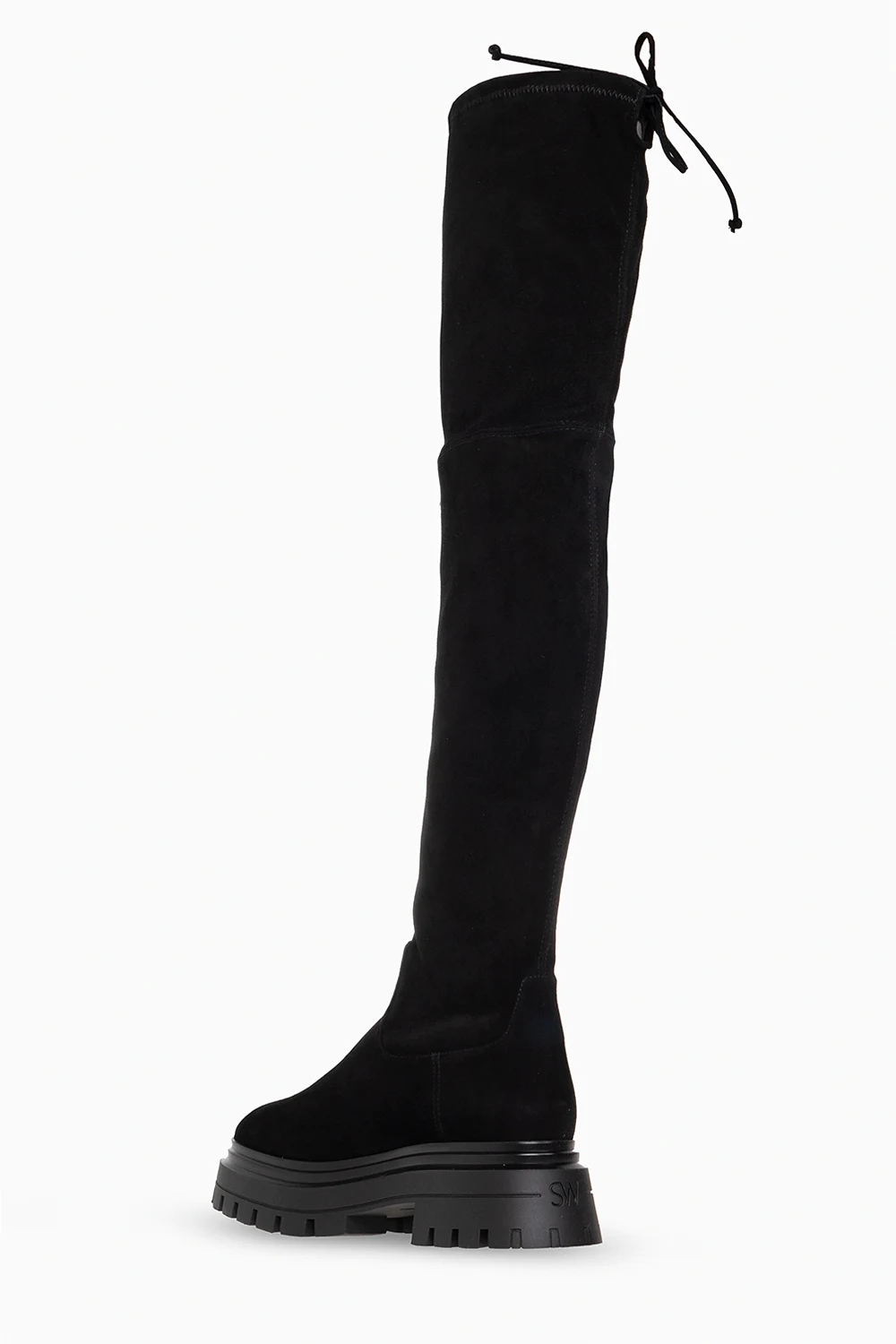 Black ‘Bedfordland’ suede boots from Stuart Weitzman. Crafted from suede, this model features a slip-on silhouette, a drawstring hem and a black rubber sole.