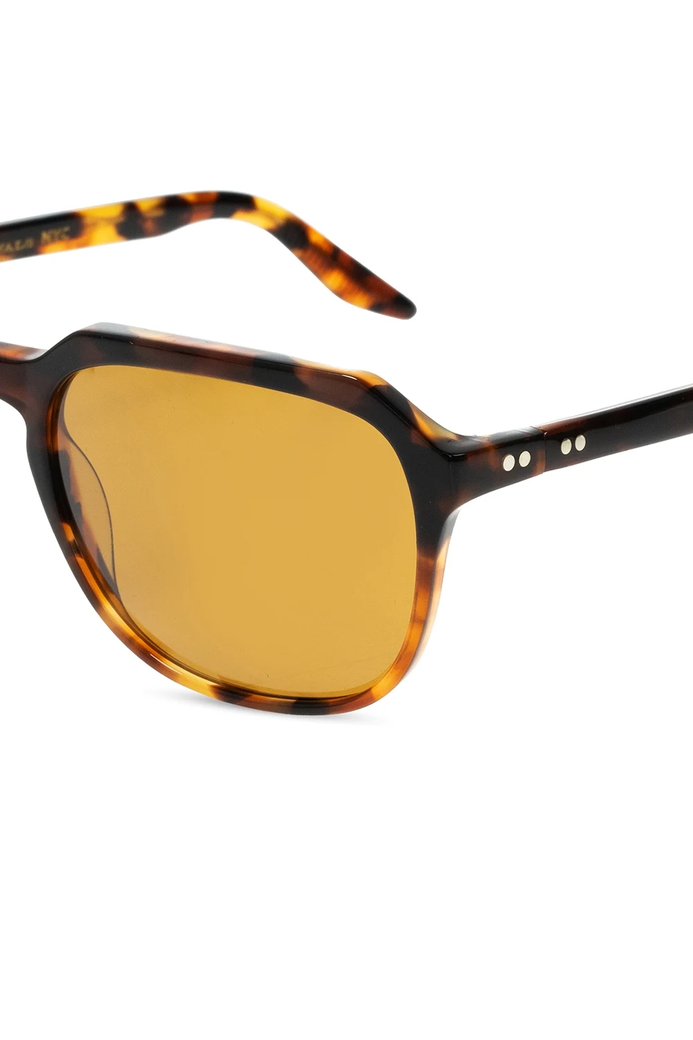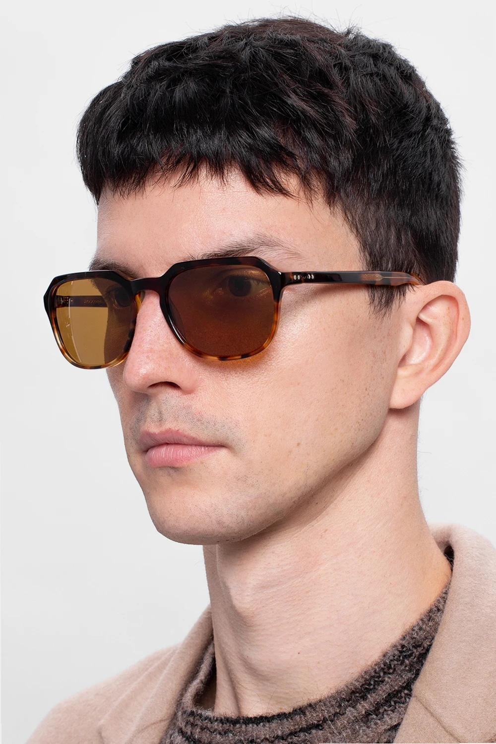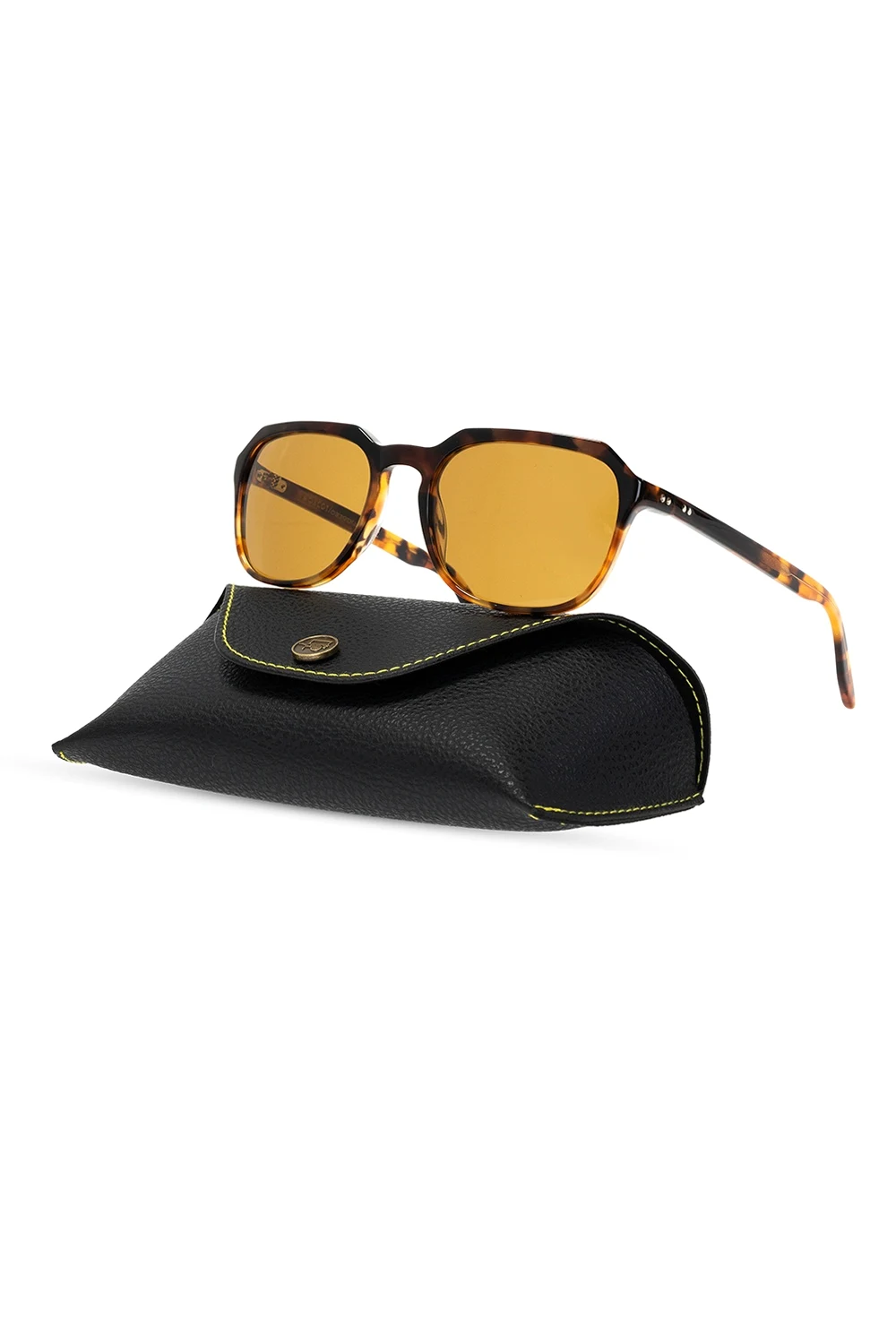 Black and brown ‘Haskel’ eyeglasses from Moscot. This handcrafted model features certificated, brown tinted lenses with 100% UVA and UVB protection and comes with a case and a canvas bag with a logo print in grey and yellow.