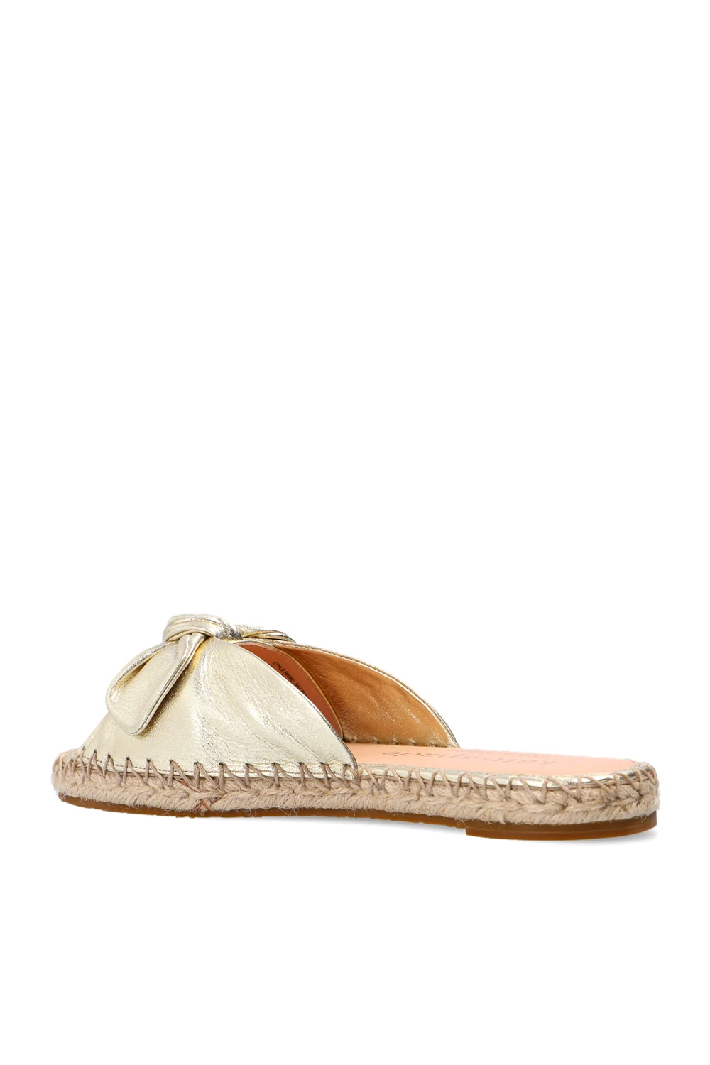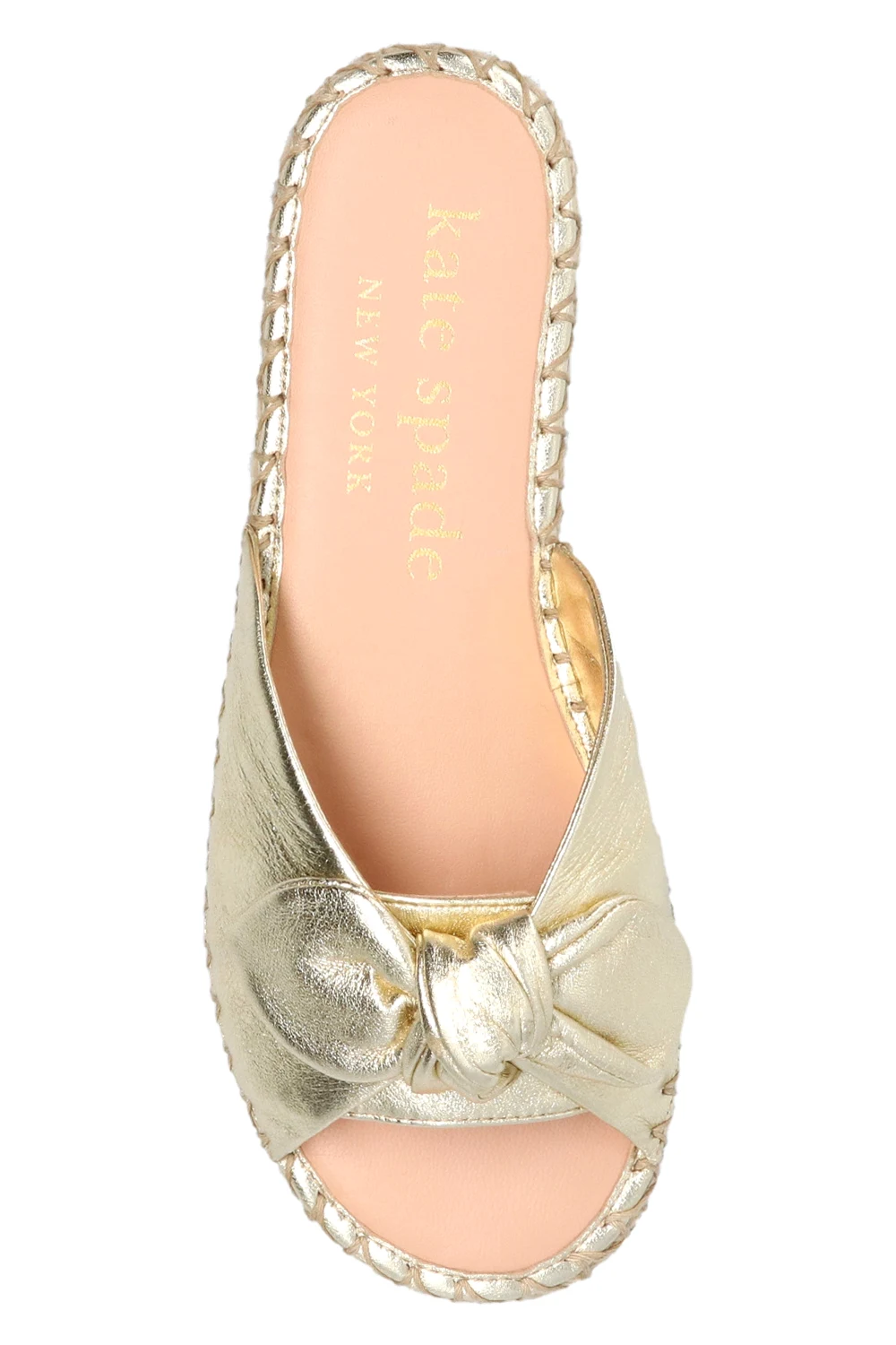 Gold-tone and beige 'Saltie Shore' slide sandals from Kate Spade. Crafted from textured leather, this pair sits on a brown rubber sole and features a logo print and a decorative bow.