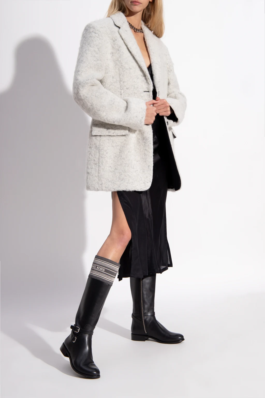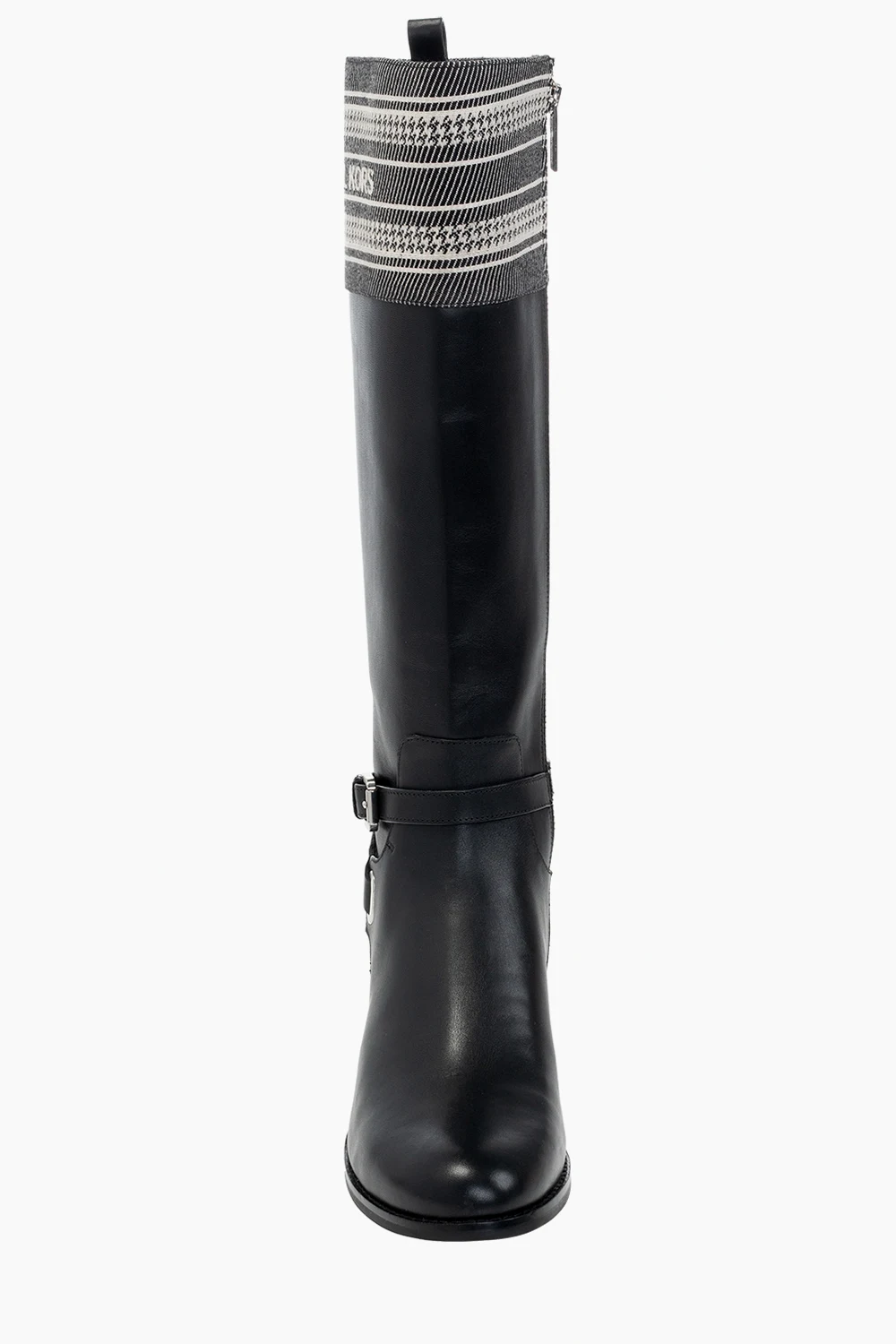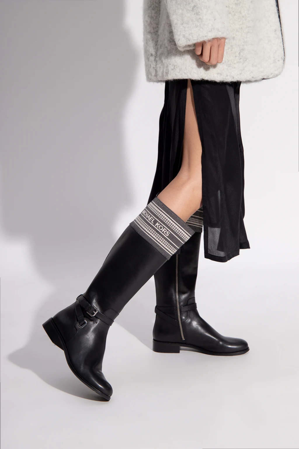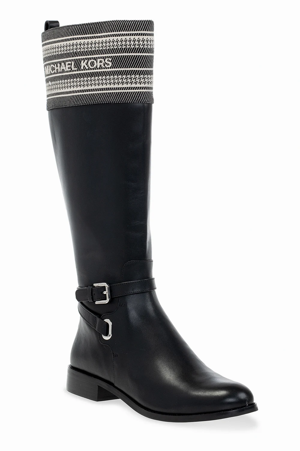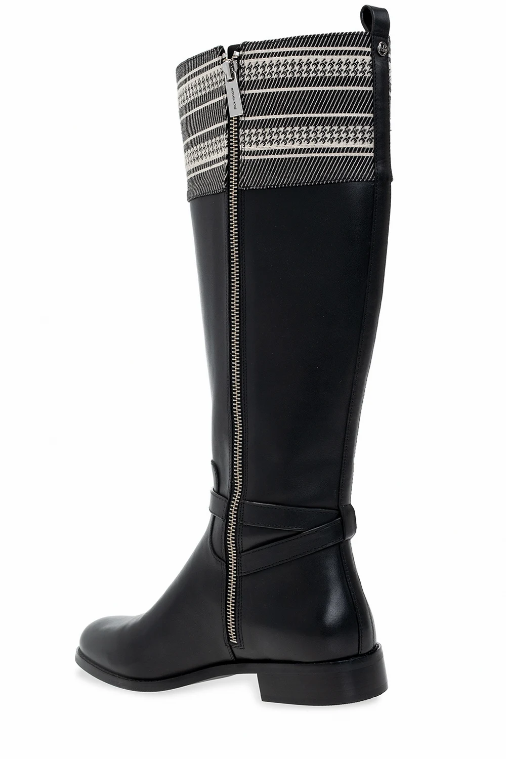 Black ‘Aldridge’ knee-high boots from Michael Michael Kors. Crafted from leather and fabric, this model sits on a black rubber sole and showcases a zip fastening, an almond-shaped toe and embroidered logo pattern in black and white.