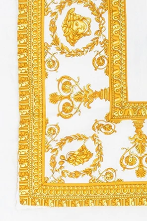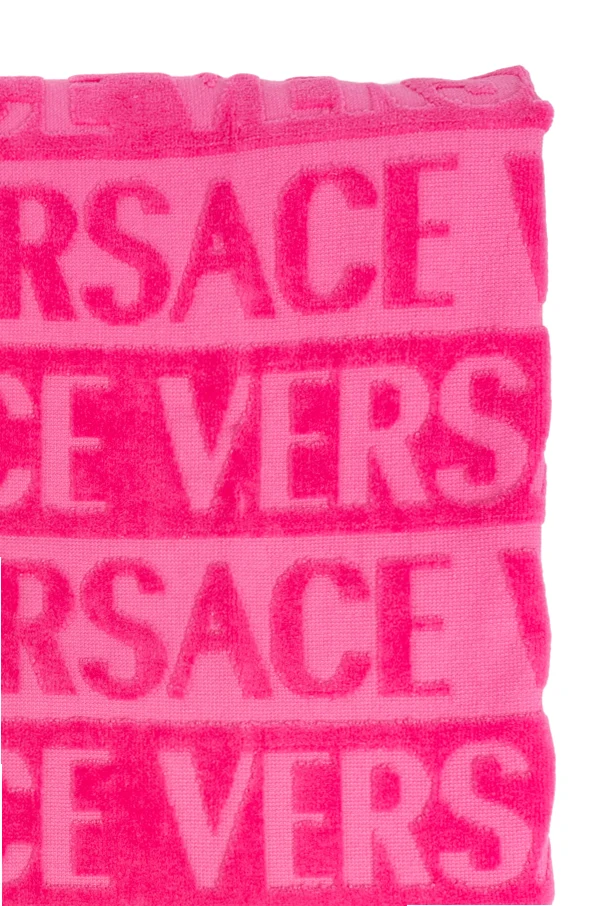 The towel's vibrant pink hue serves as a lively canvas for the contrasting designer name print, creating an eye-catching display of elegance. The lower segment of the towel is adorned with a wide band of rich, golden embellishments, featuring classic motifs such as laurel wreaths, medusas, vases, and other decorative elements. This intricate design injects a dose of exclusivity and grandeur, making it a standout addition to any bathroom.