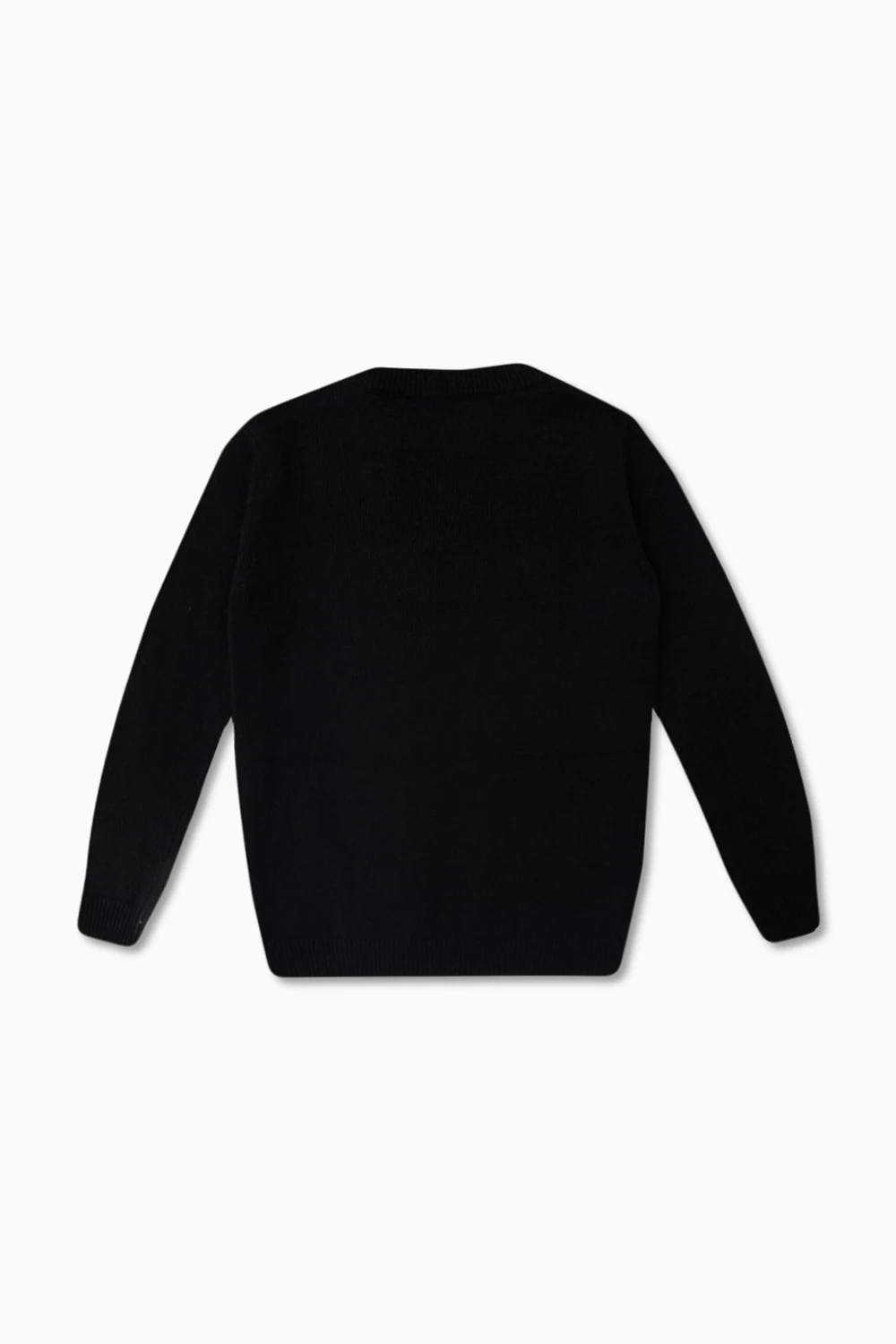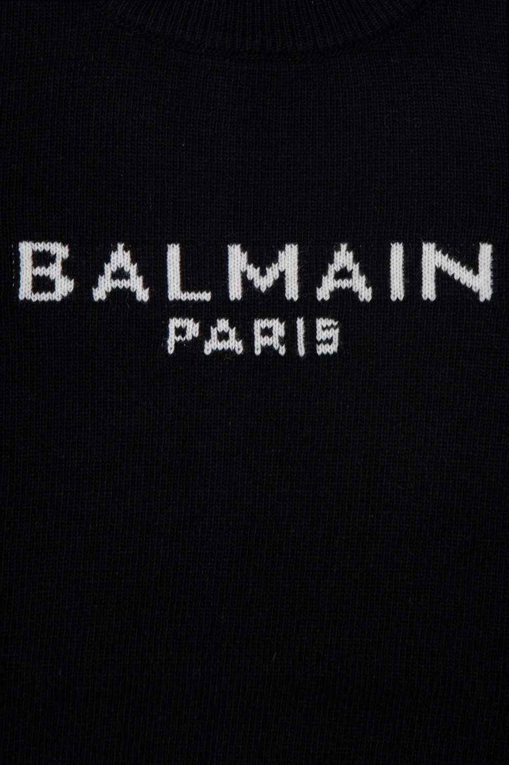 Black crewneck sweater from Balmain Kids. Accentuated with a white logo across the front, this style features decorative gold-tone snap closures on the neckline and ribbed trims on the collar, bottom hem and cuffs.
