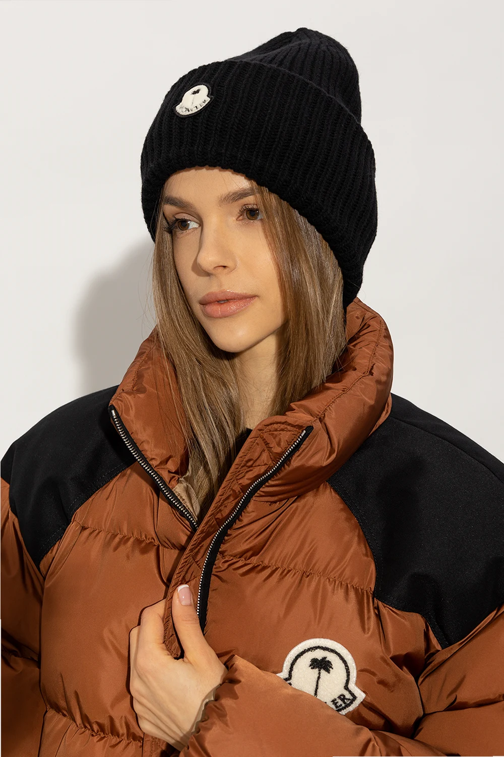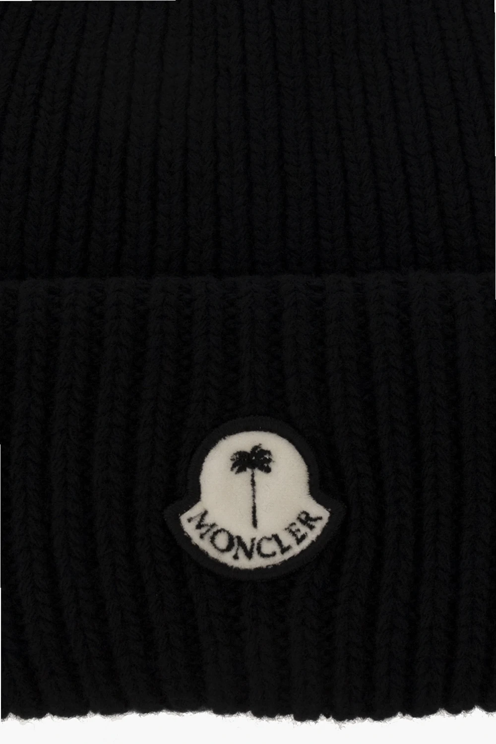 Black beanie from Moncler Genius, the ‘8 MONCLER PALM ANGELS’ collection. Crafted from wool with a ribbed knit, this item features a white and black logo patch.