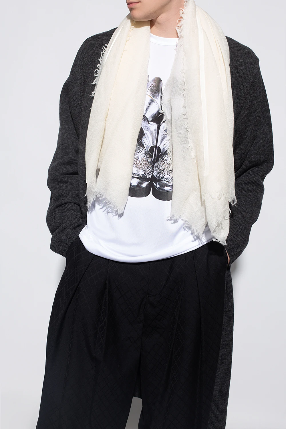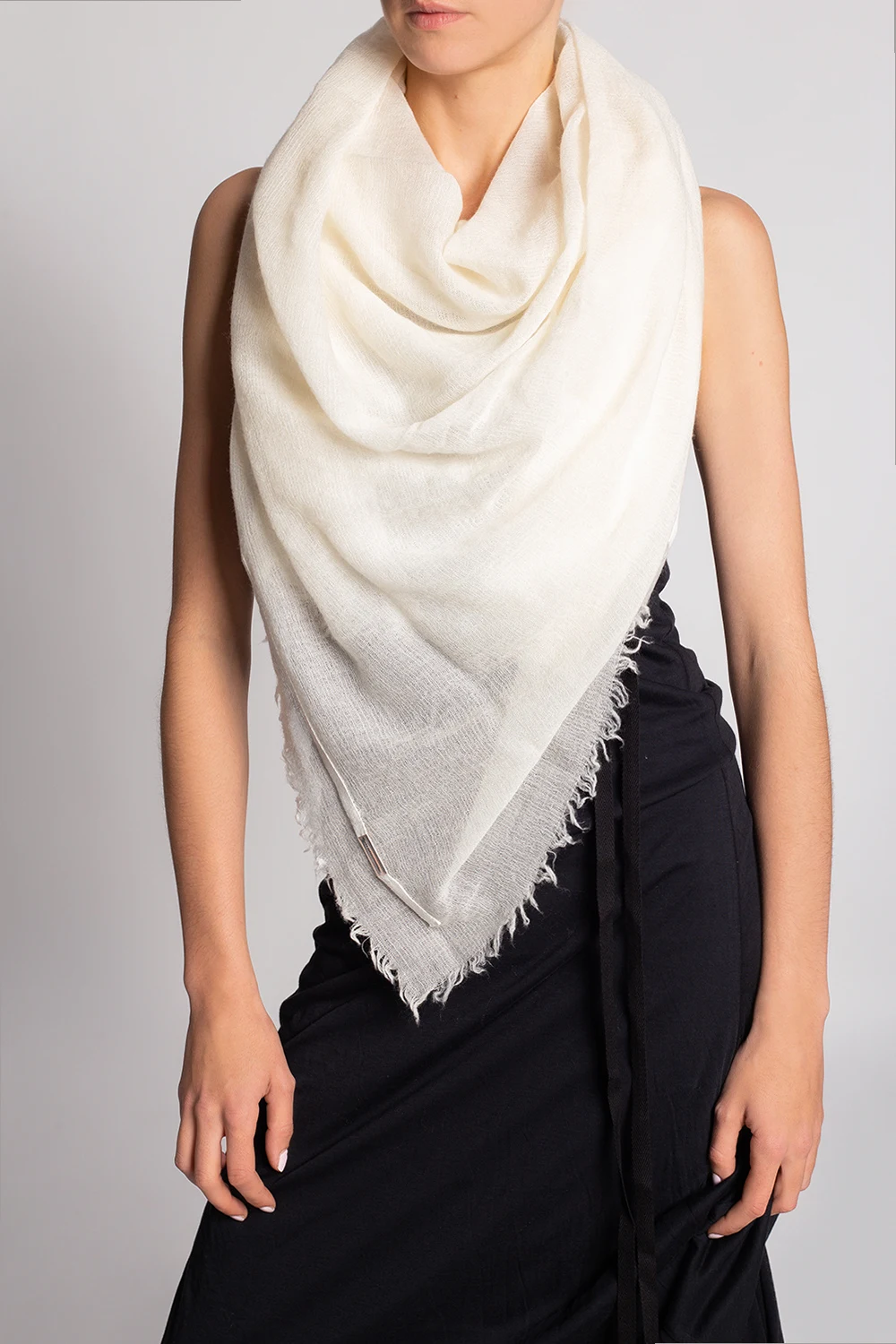 Cream ‘Sasha’ scarf from Ann Demeulemeester. Crafted from a wool, silk and cashmere blend, this design is embroidered with a stripe.