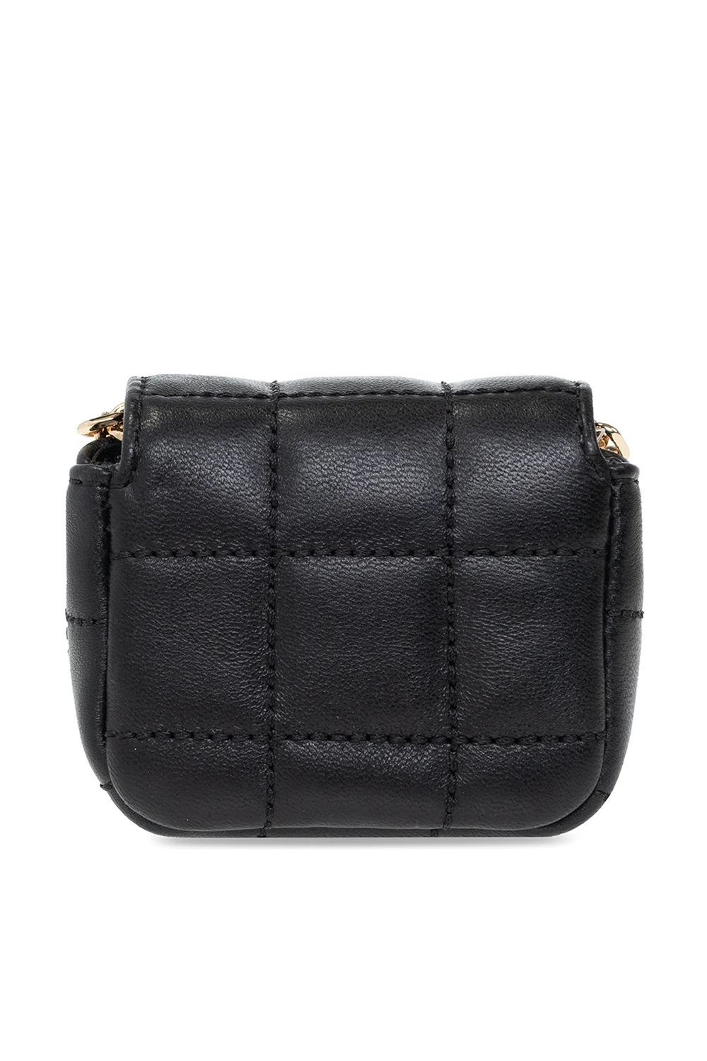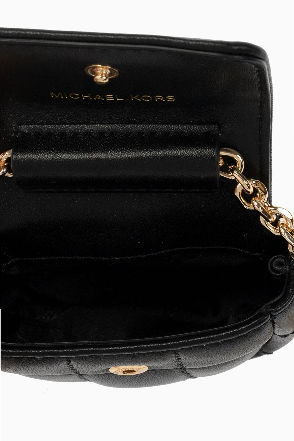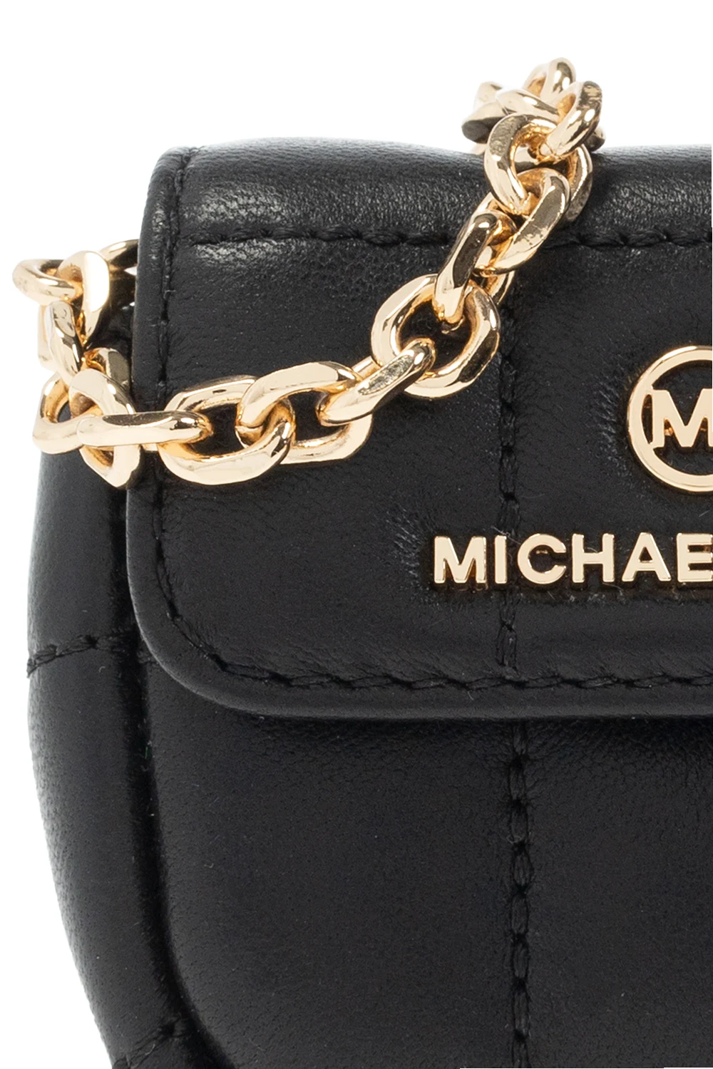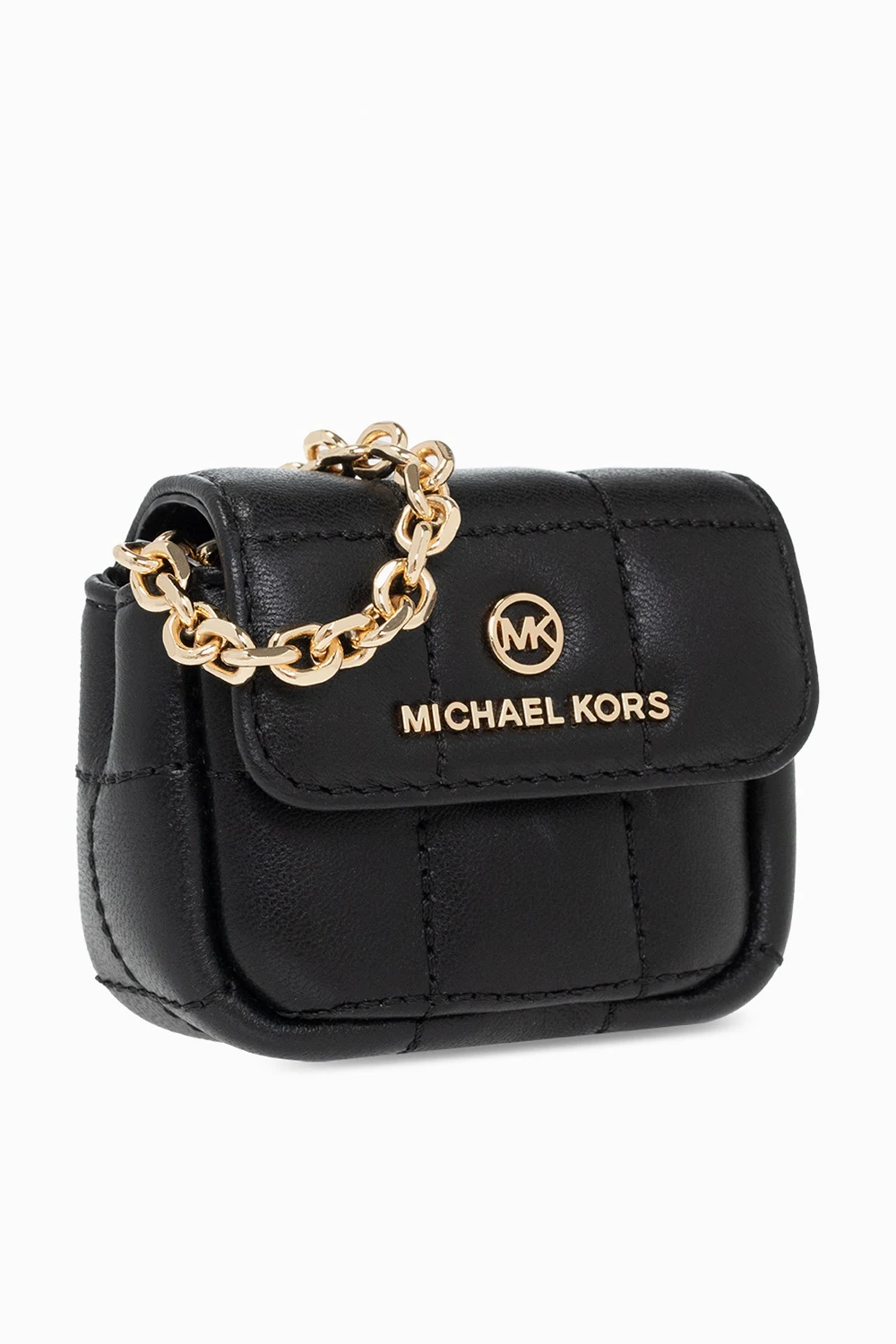 Black AirPods case from Michael Michael Kors. Made of lamb leather, this design secures with a snap and showcases a metal logo plaque on the front, a chain shoulder strap, gold-tone metal hardware and one internal compartment.