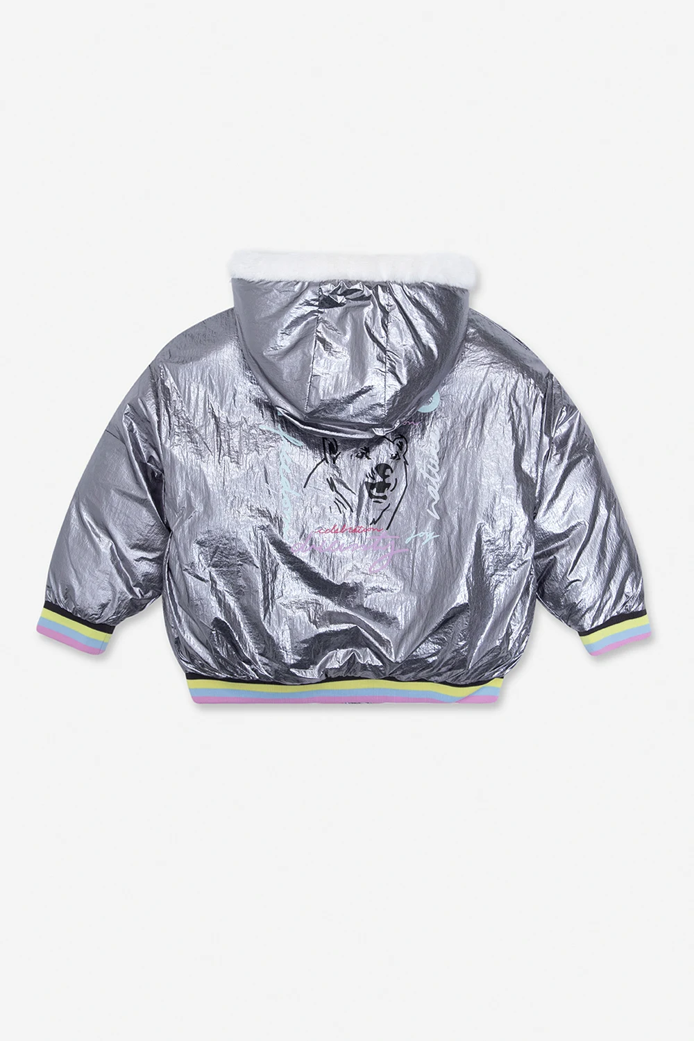 Grey hooded jacket with a metallic finish from Kenzo Kids. Fastened with a zip, this design features a multicolored logo print, animal motif, two front pockets, hood trimmed with white faux fur and ribbed trims with a multicolored stripe pattern at the hem and cuffs.