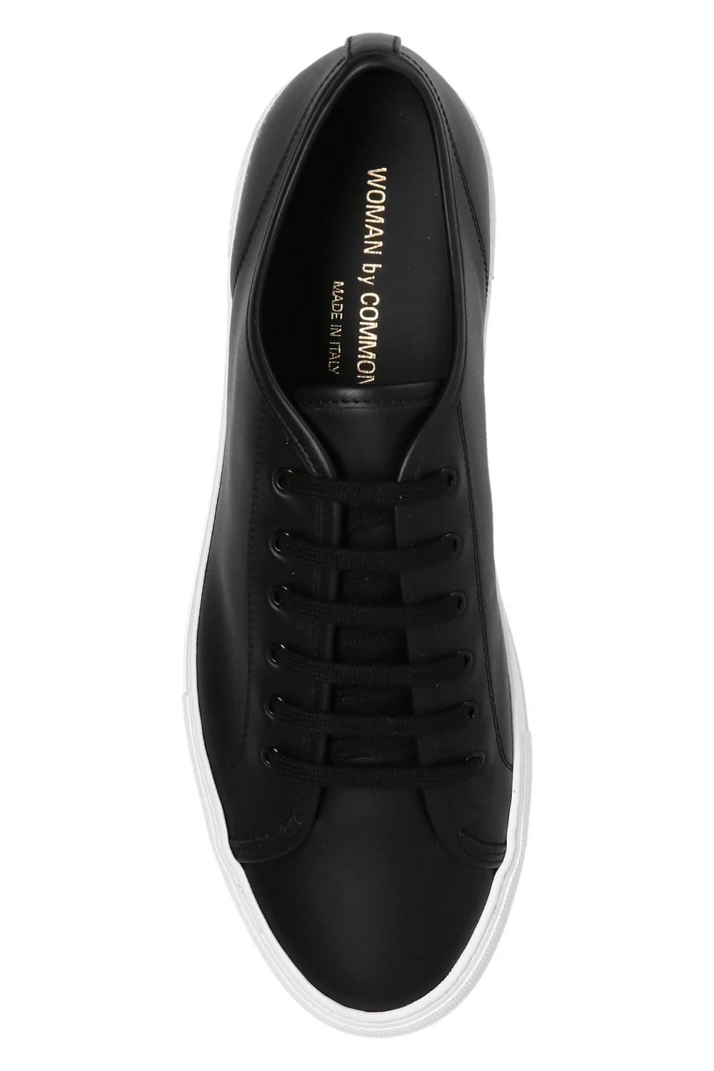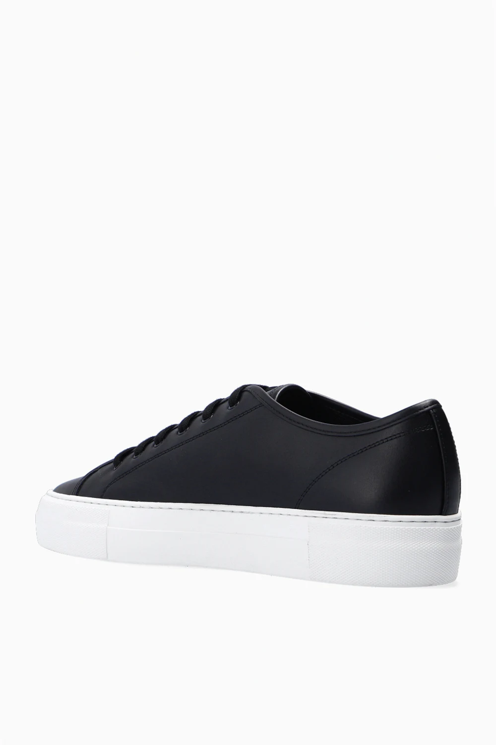 Black ‘Tournament Low Super’ sneakers from Common Projects. Crafted from leather, this design features a printed logo pattern in gold-tone and a white rubber sole.