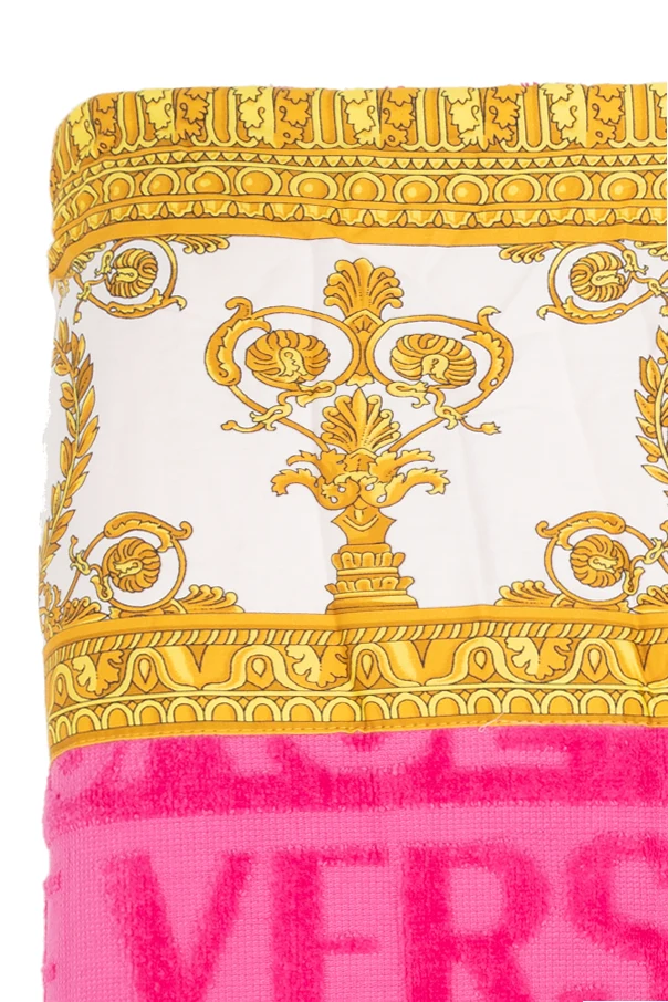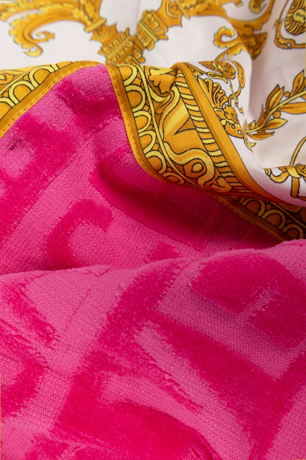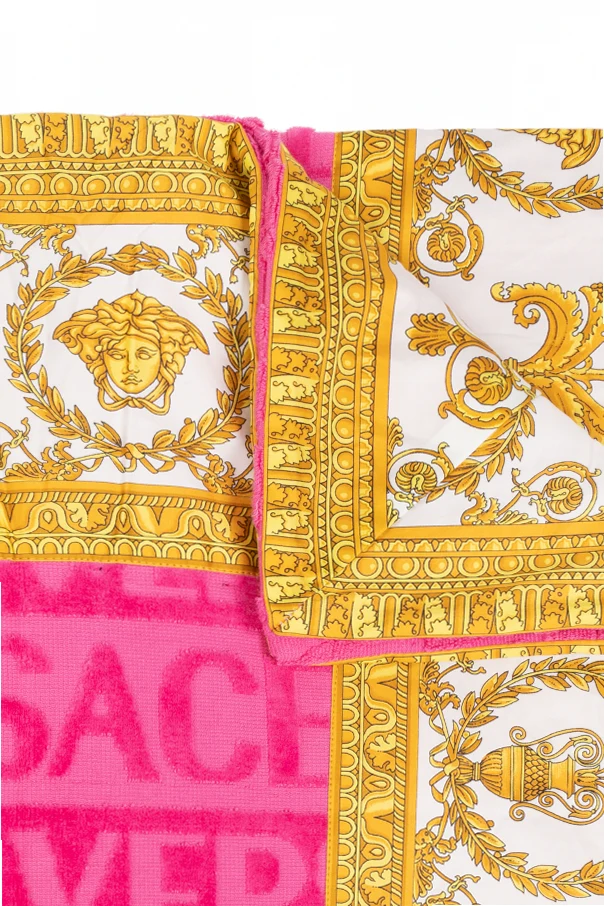 Introducing the pinnacle of opulent bathing elegance - the Versace Home 'I heart Baroque' Bath Towel . Crafted with meticulous care, this bath towel is a testament to the harmonious blend of luxury and utility. The dominant vibrant pink hue, embellished with golden motifs on a pristine white background, radiates a lavish aesthetic. Symbolizing the epitome of sophistication, the design intricately weaves together lush botanical patterns with classic Greek elements such as laurel wreaths and a noble profile. The lower section of the towel proudly showcases the Versace Home logo, rendered in bold, contrasting letters for instant recognition and allure. Framed by an exquisite golden border, the design elements collectively elevate the towel's elegance, making it a statement piece in any bathroom. Fabricated from 100% plush, absorbent cotton, this bath towel not only promises to envelop you in softness but also assures durability and high absorbency, characteristic of exclusive clothing brands. Why Purchase This Product? Luxurious design featuring the 'I heart Baroque' print, perfect for those who appreciate the finer things. Made from high-quality, absorbent cotton for ultimate comfort and efficiency. Adorned with a distinctive Versace Home logo, enhancing its exclusivity. Elegant gold trim adds a touch of sophistication and style. Exceptional craftsmanship, ensuring longevity and enduring beauty.