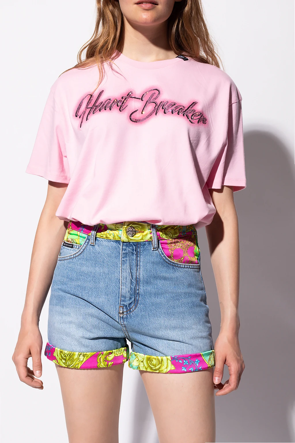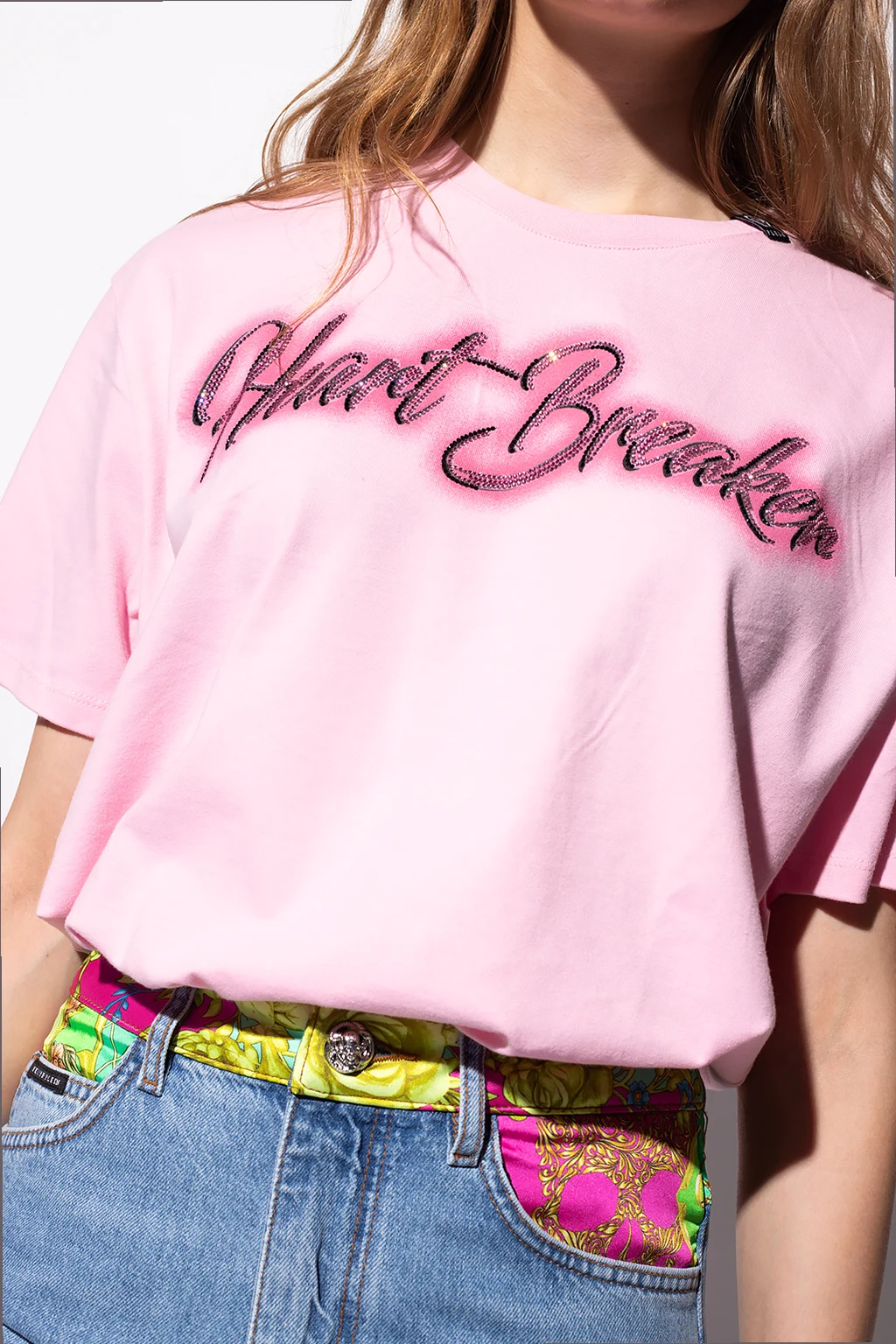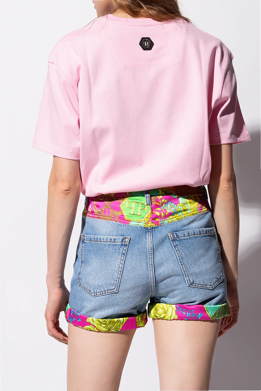 Pink crewneck T-shirt from Philipp Plein. Crafted from cotton, this style showcases an elasticated collar, a shimmering graphic pattern and a black and silver-tone logo emblem at the back.
