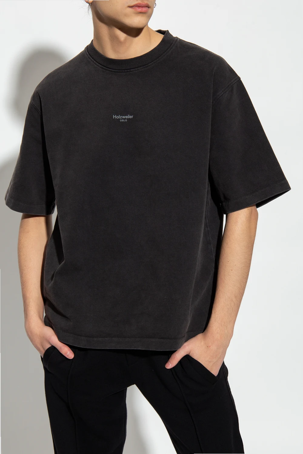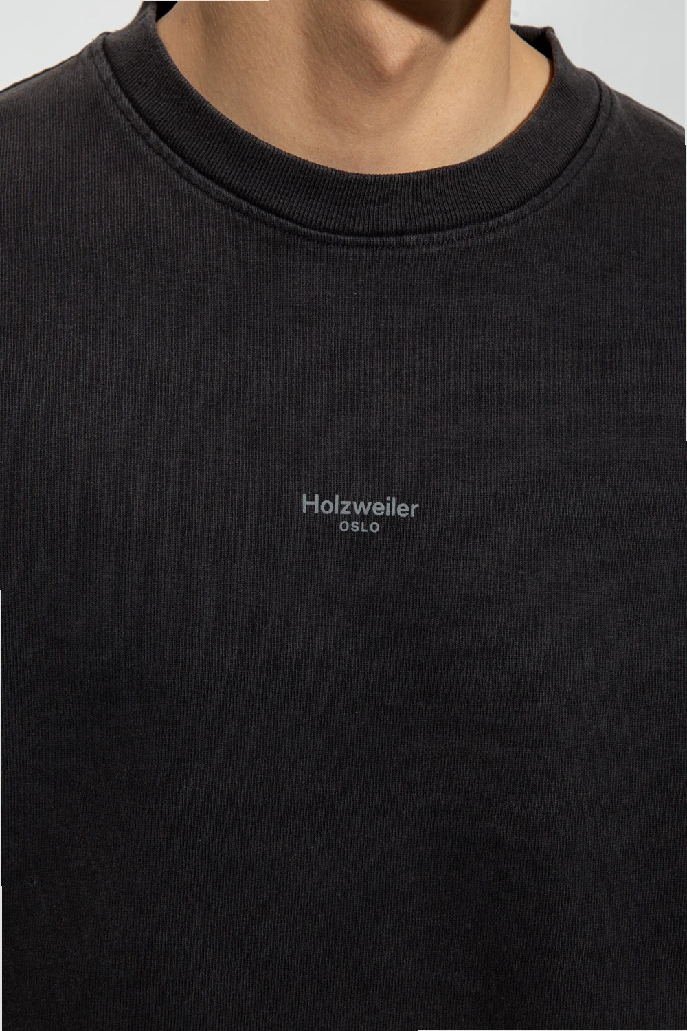 Dark grey ‘Ranger’ T-shirt from Holzweiler. Made of organic cotton, this short sleeve design features a grey logo detail and ribbed crew neck.