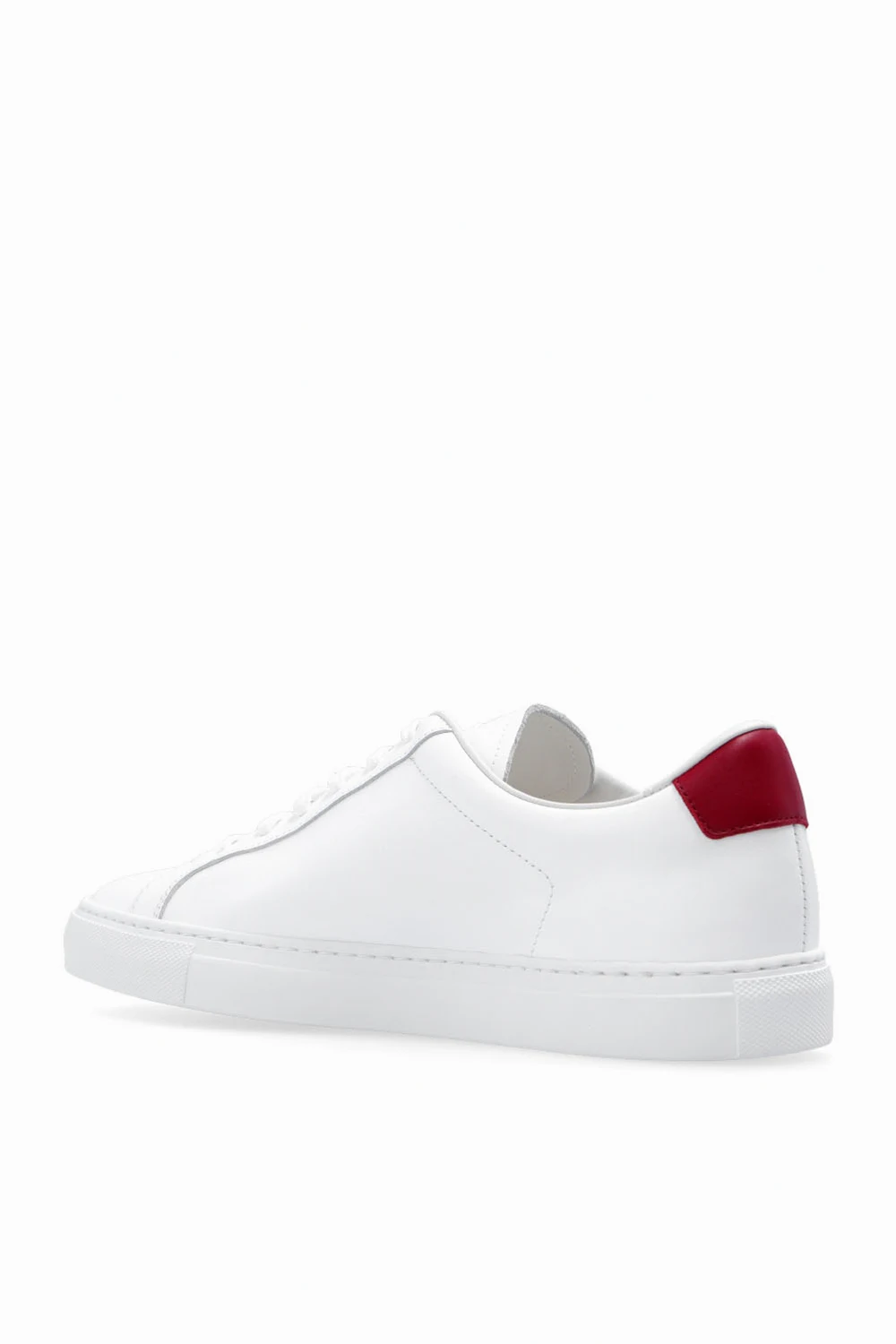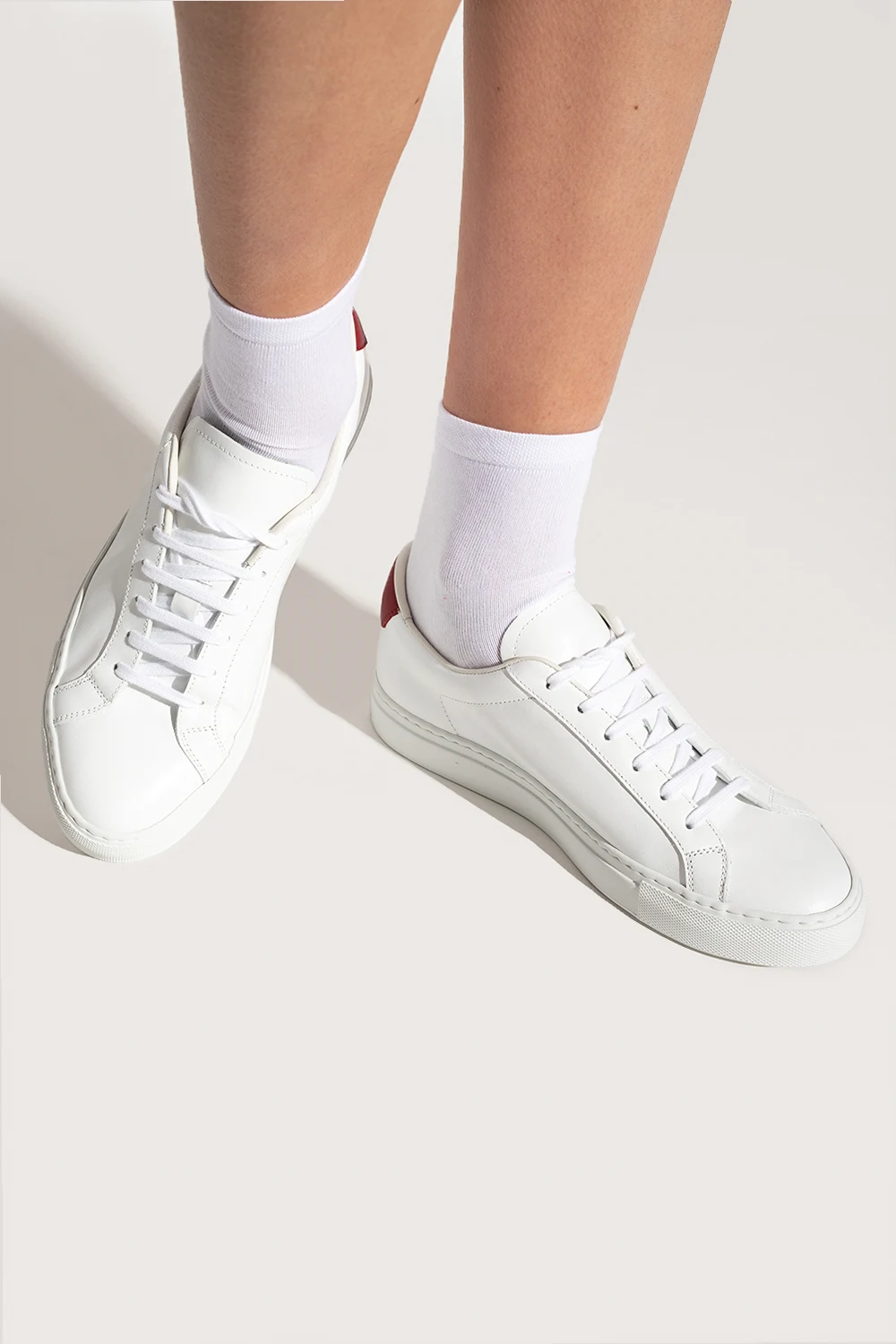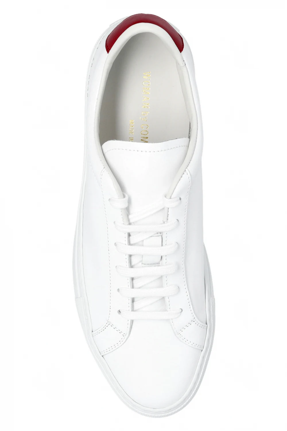 White ‘Retro Low’ sneakers from Common Projects. Crafted from leather, this lace-up model features a gold-tone print on the side, a dark red heel counter and a white rubber sole. Swappable shoelaces included.