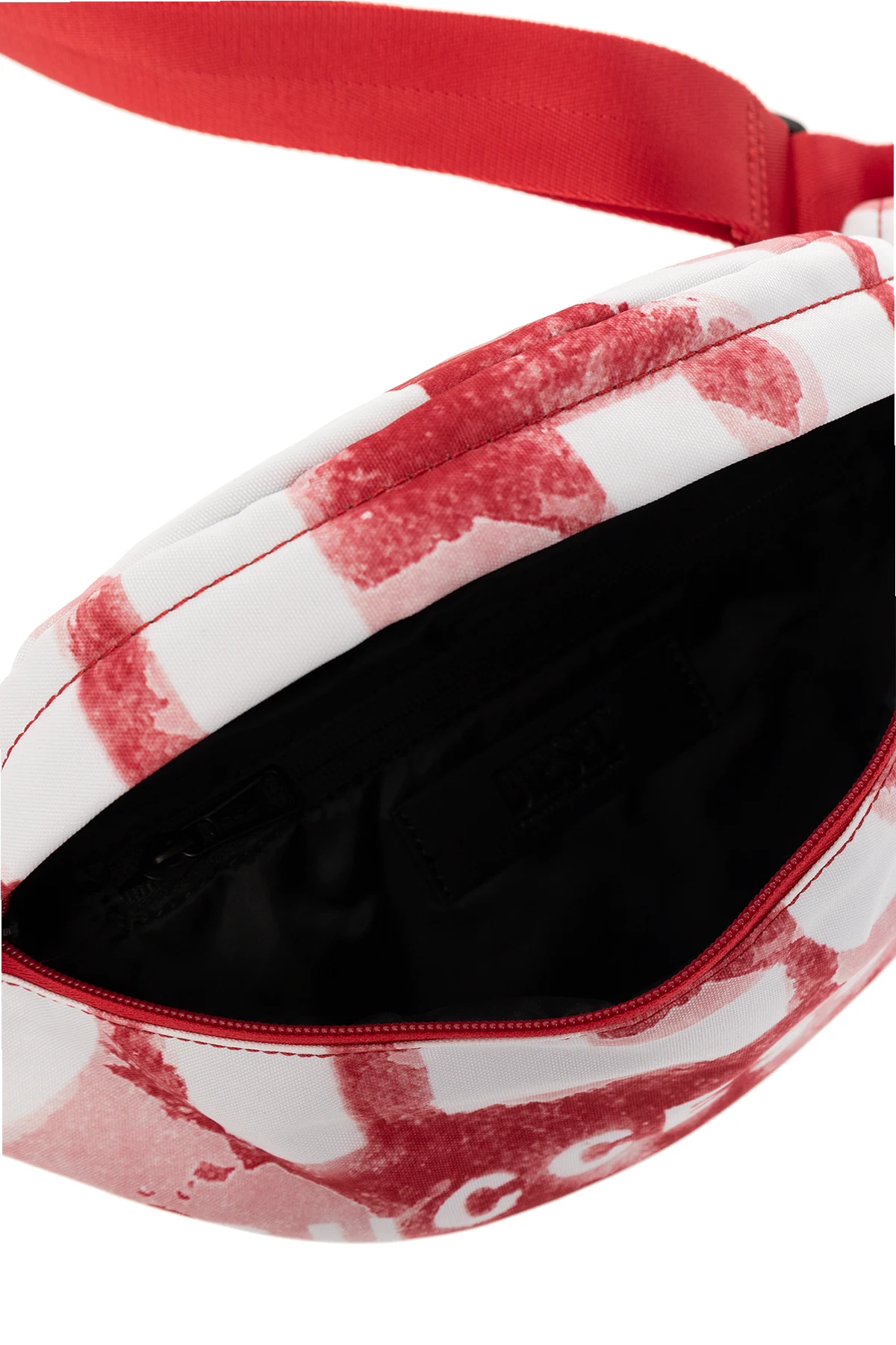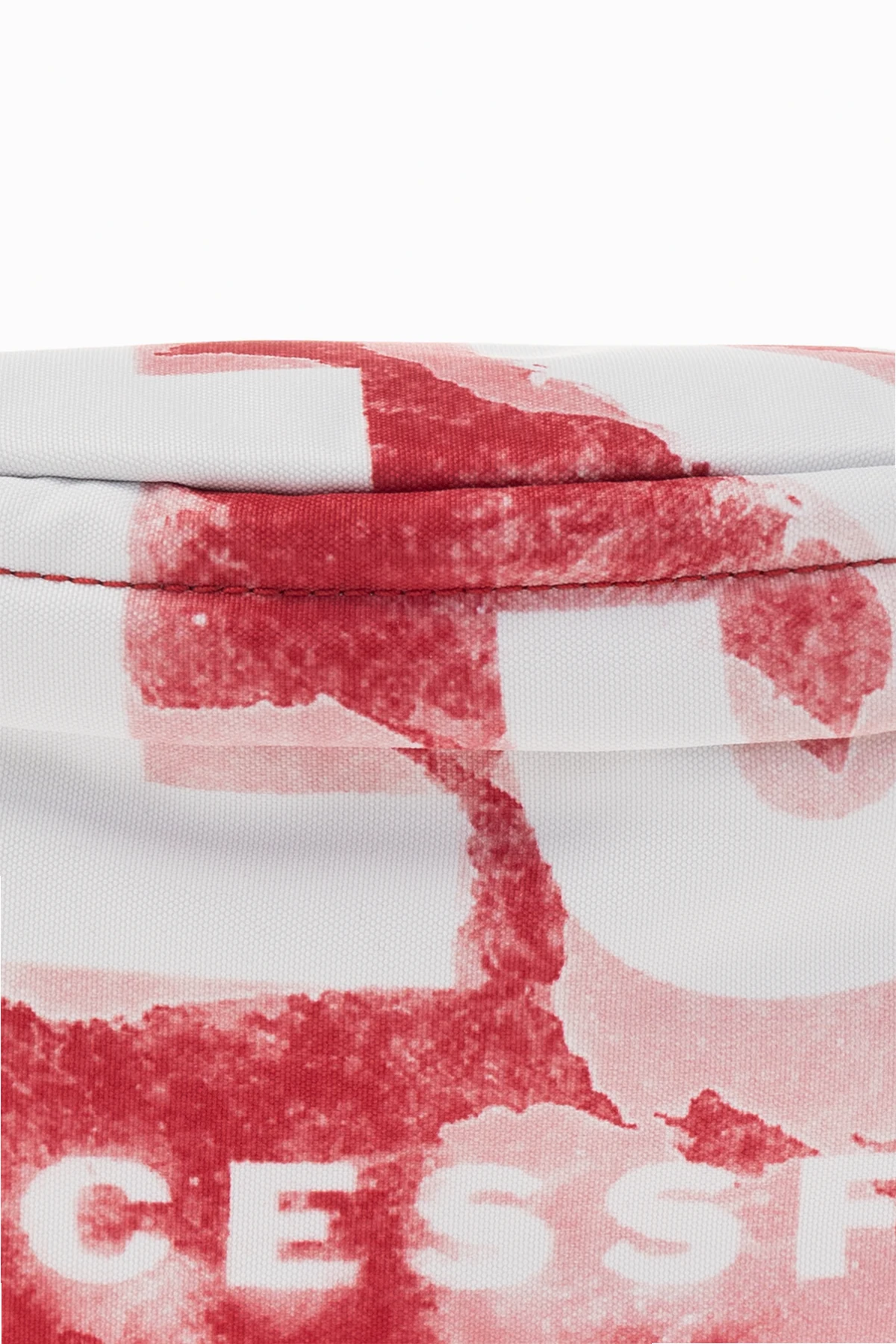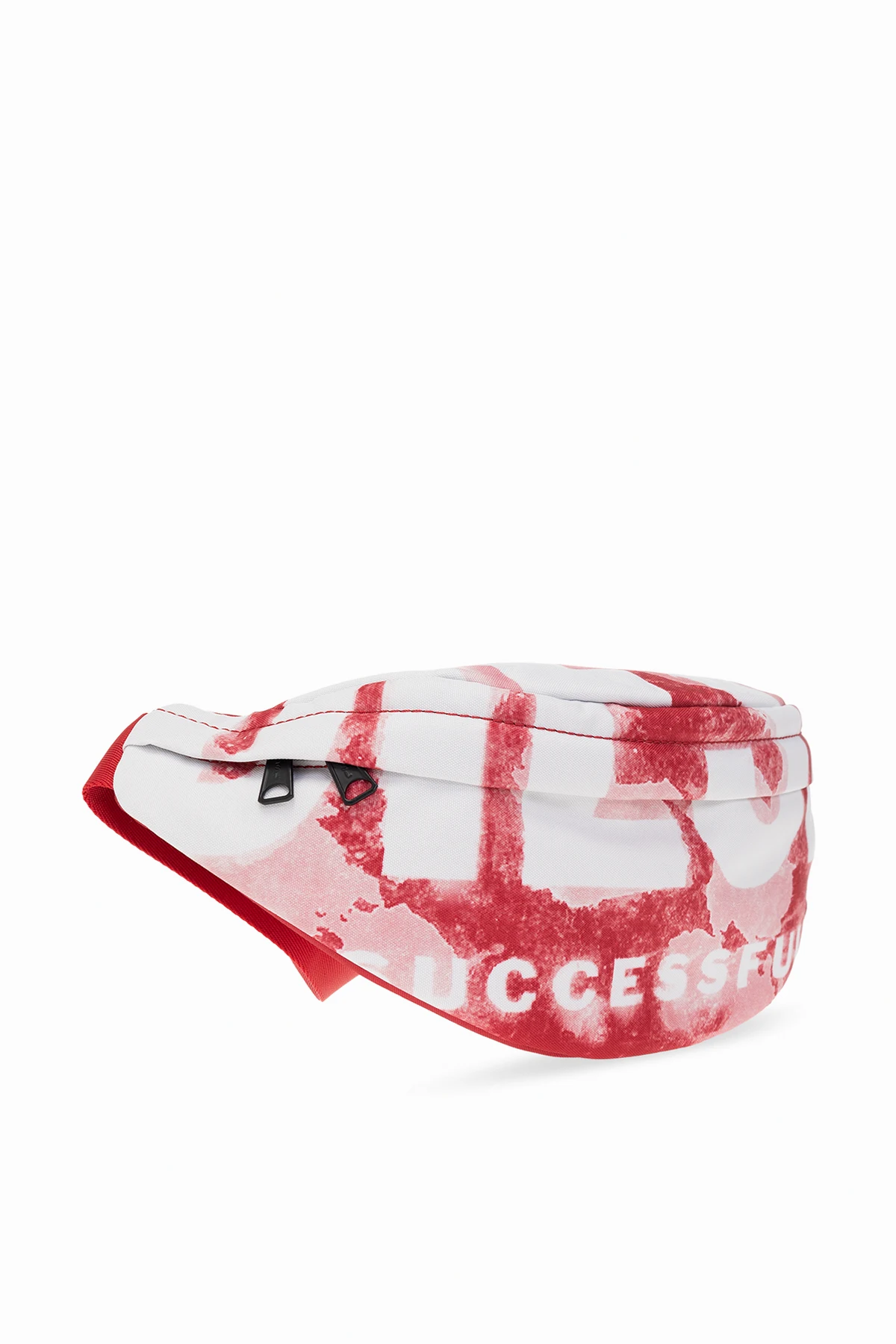 Red, pink and white ‘RAVE BELTBAG’ belt bag from Diesel. Fastened with a two-way zip, this model features logo pattern, zipped back pocket, adjustable belt, silver-tone metal hardware and one internal compartment with one zip pocket.