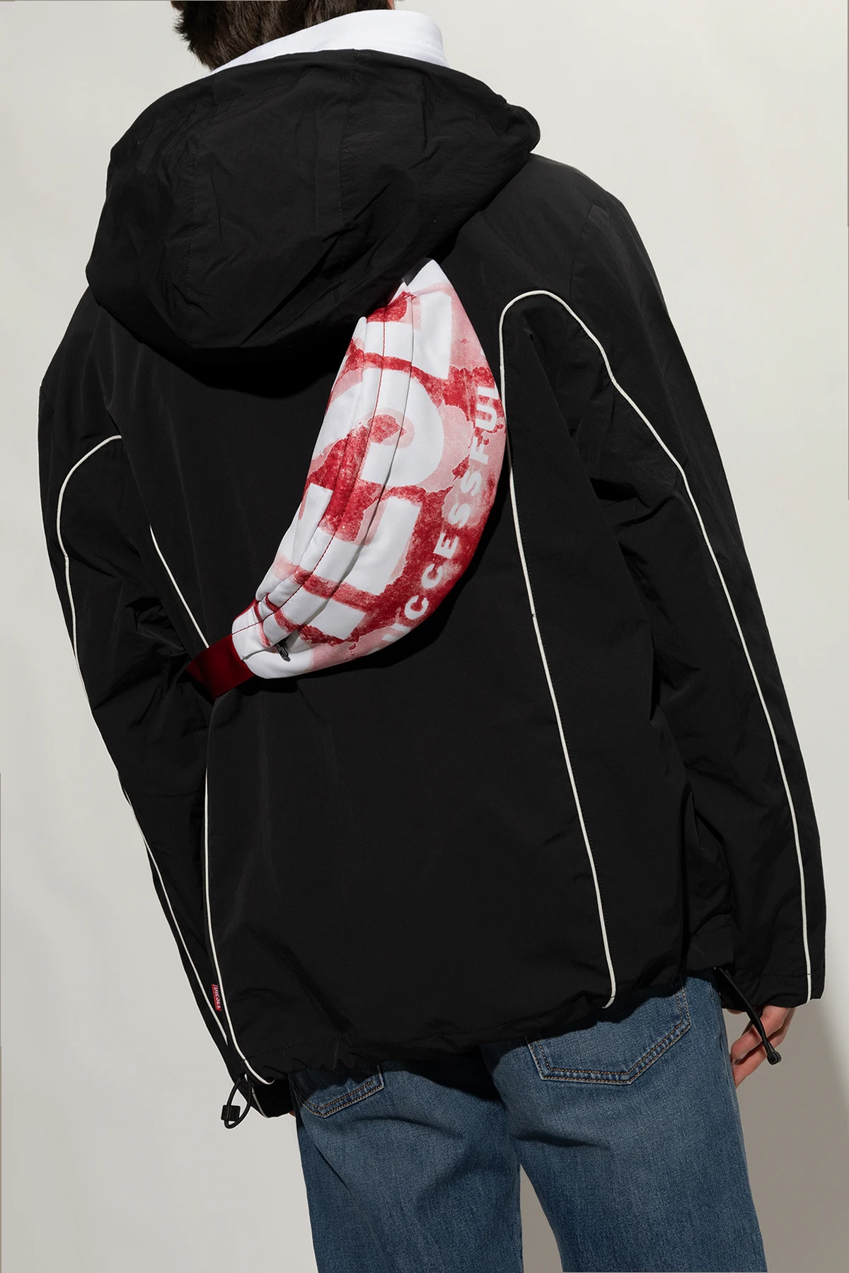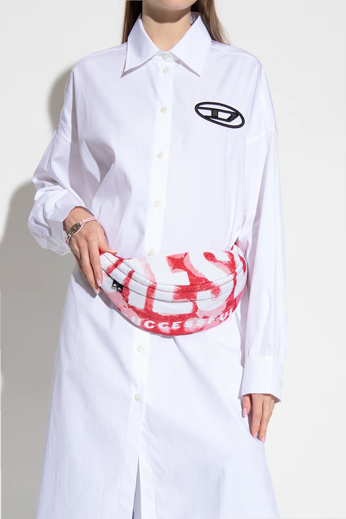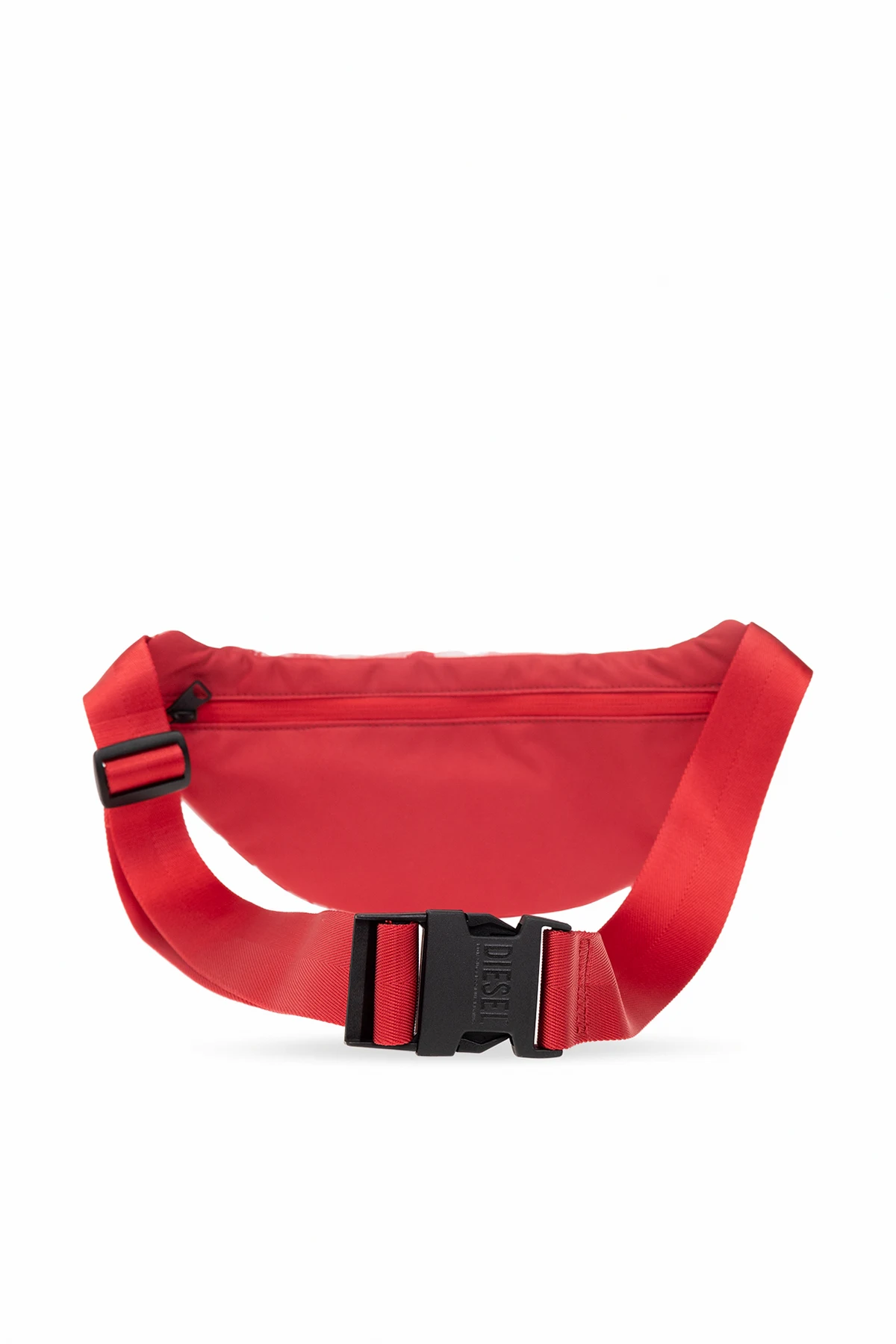 Red, pink and white ‘RAVE BELTBAG’ belt bag from Diesel. Fastened with a two-way zip, this model features logo pattern, zipped back pocket, adjustable belt, silver-tone metal hardware and one internal compartment with one zip pocket.