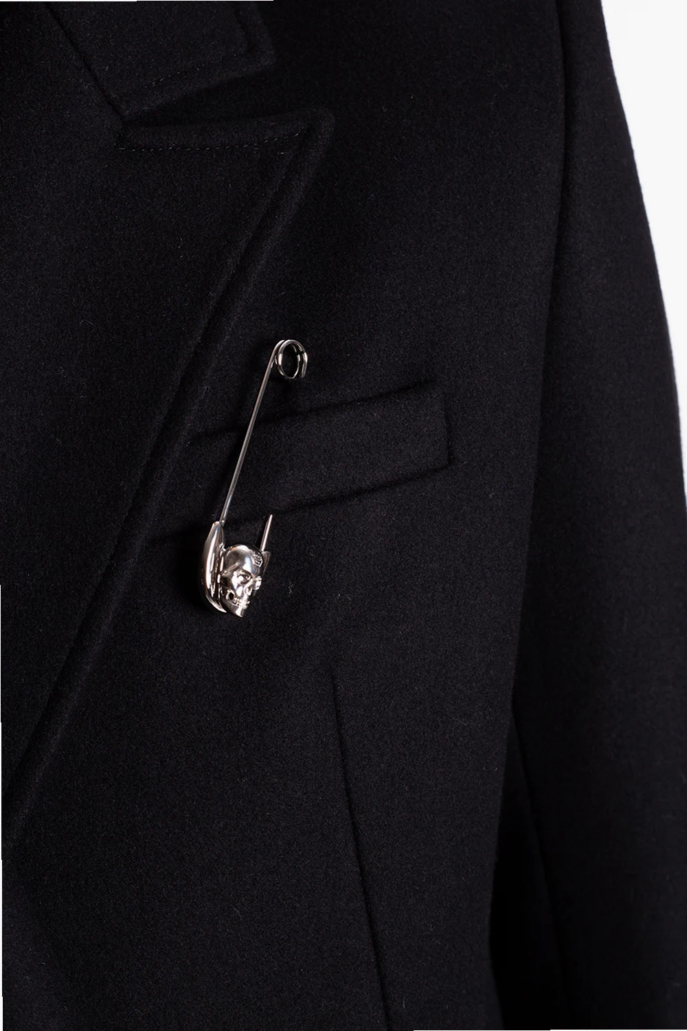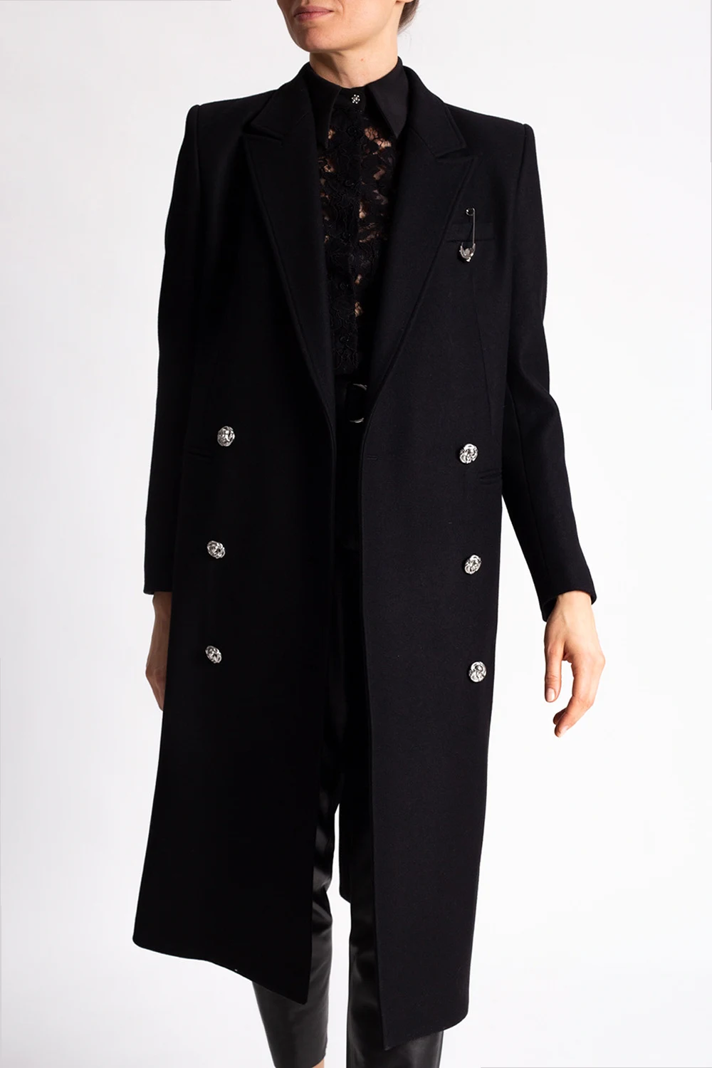 Black double-breasted coat with notch lapels from Philipp Plein. Fastened silver-tone skull buttons, this garment is complete two pockets, decorative safety pins, long sleeves and a single rear vent.