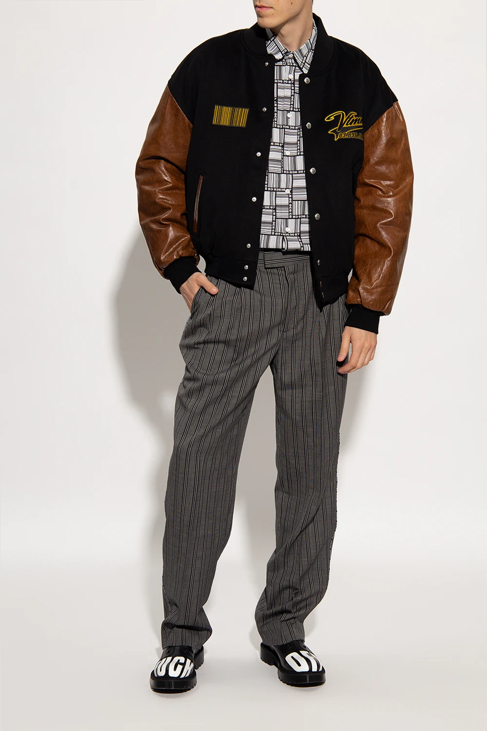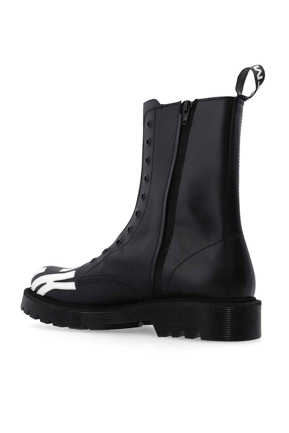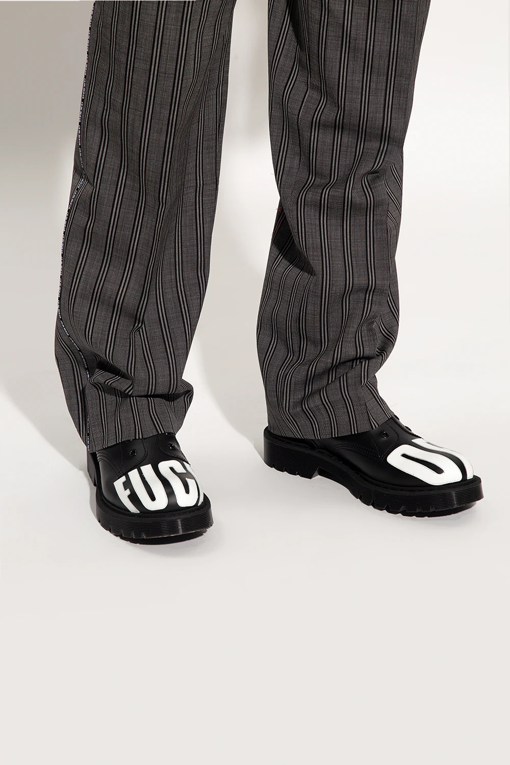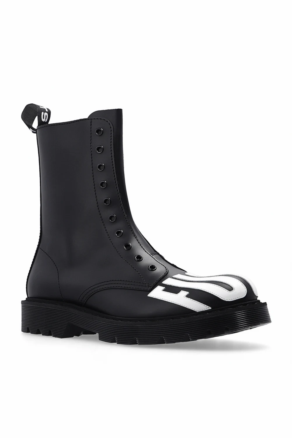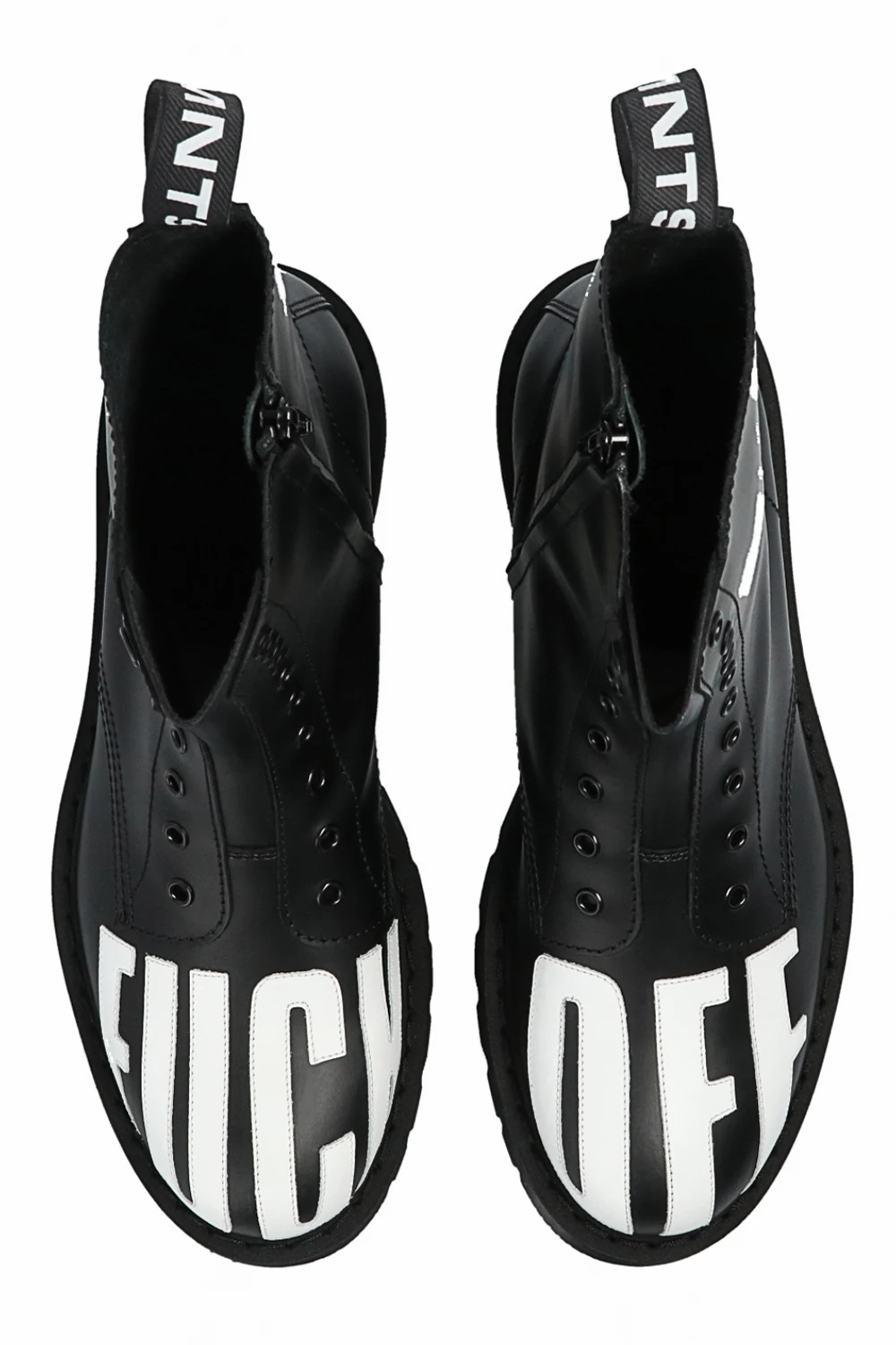 Black shoes from VTMNTS. Crafted from leather, this pair features white lettering and black rubber sole.