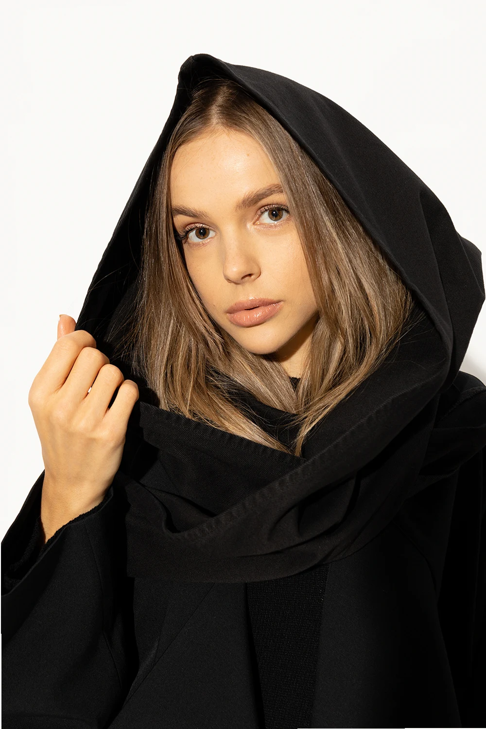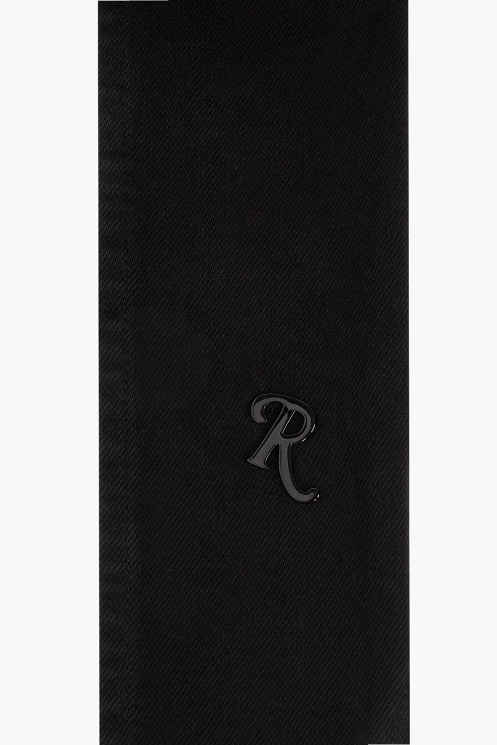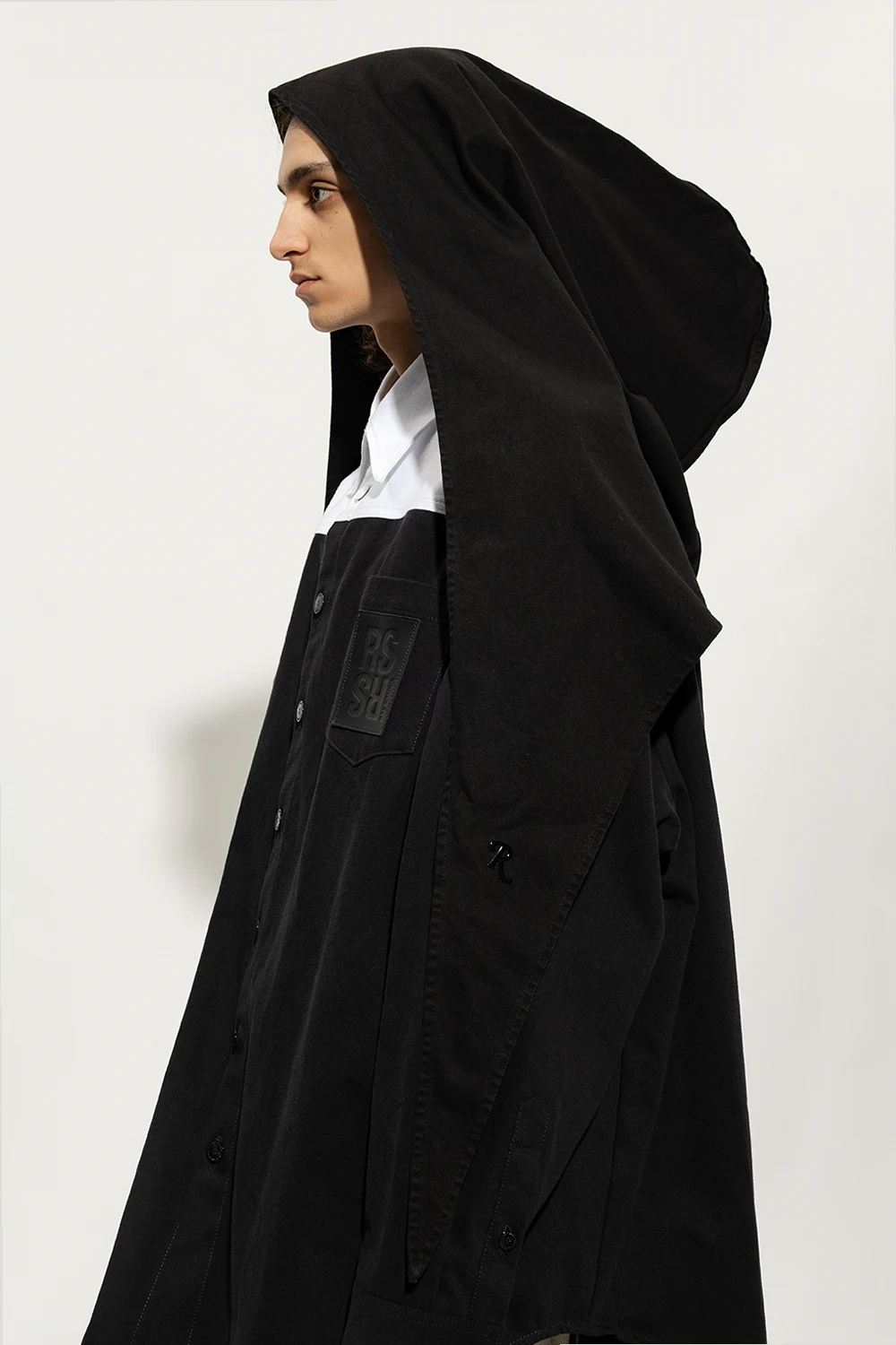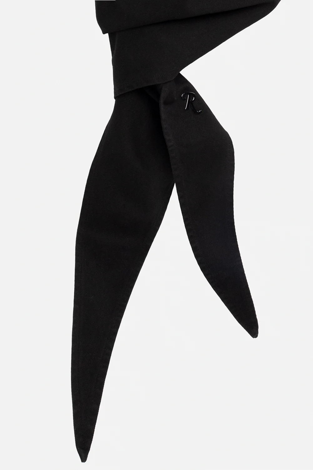 Black denim hood from Raf Simons. Fastened with drawstrings, this design is decorated with a metal logo appliqué.
