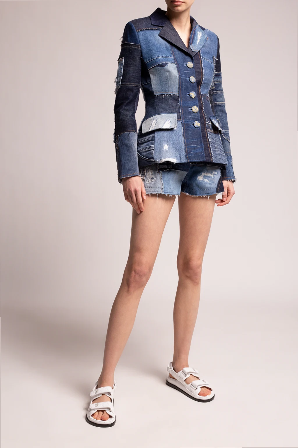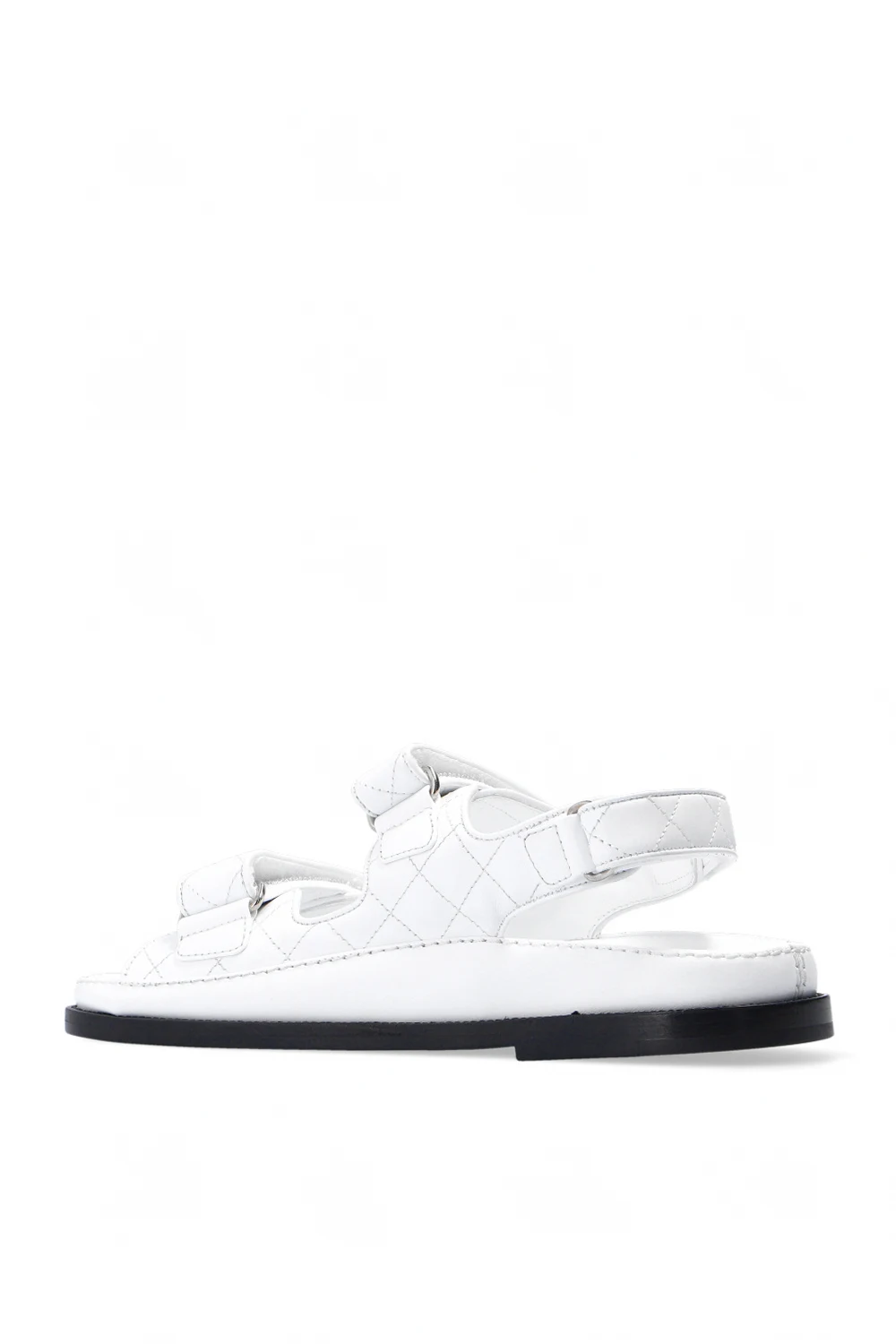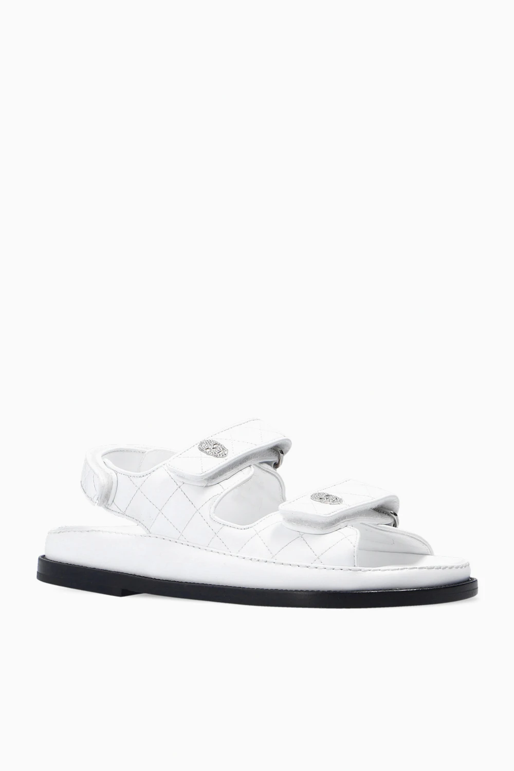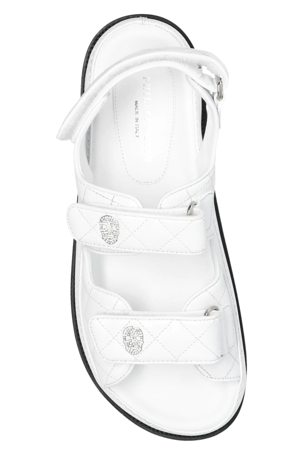 White quilted sandals from Philipp Plein. Made of leather, this design features adjustable velcro straps, logo appliqués and a black leather sole.