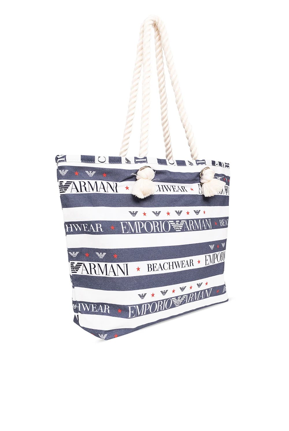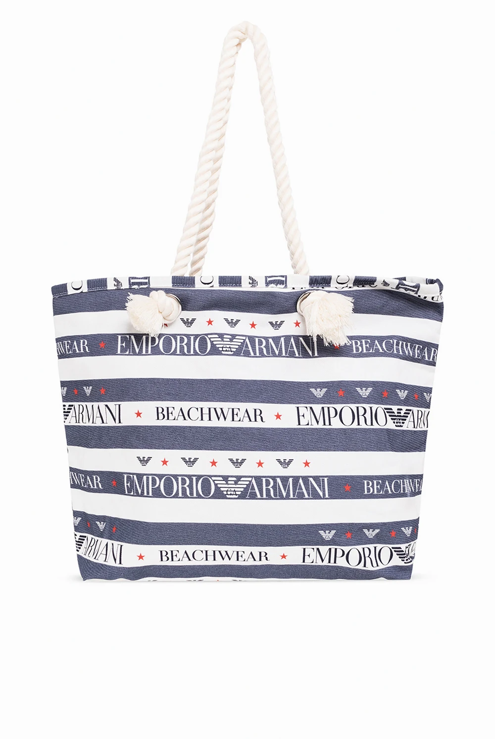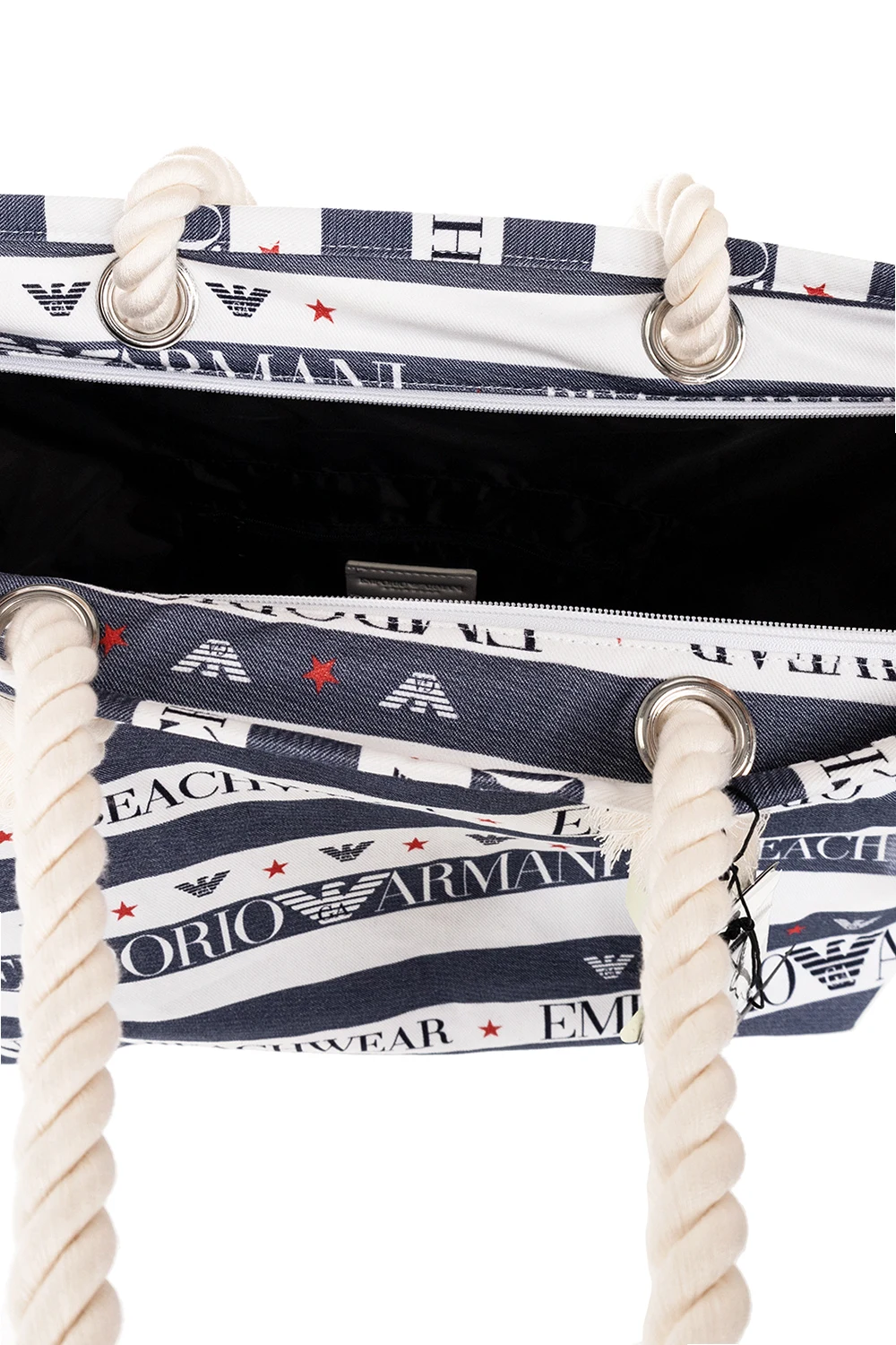 White and navy beach bag from Emporio Armani, the ‘Swimwear’ collection. Crafted from cotton, this design features a zip fastening, stripe pattern, red star, logo detail, two half-round handles, silver-tone metal hardware and one internal compartment with one zip pocket.