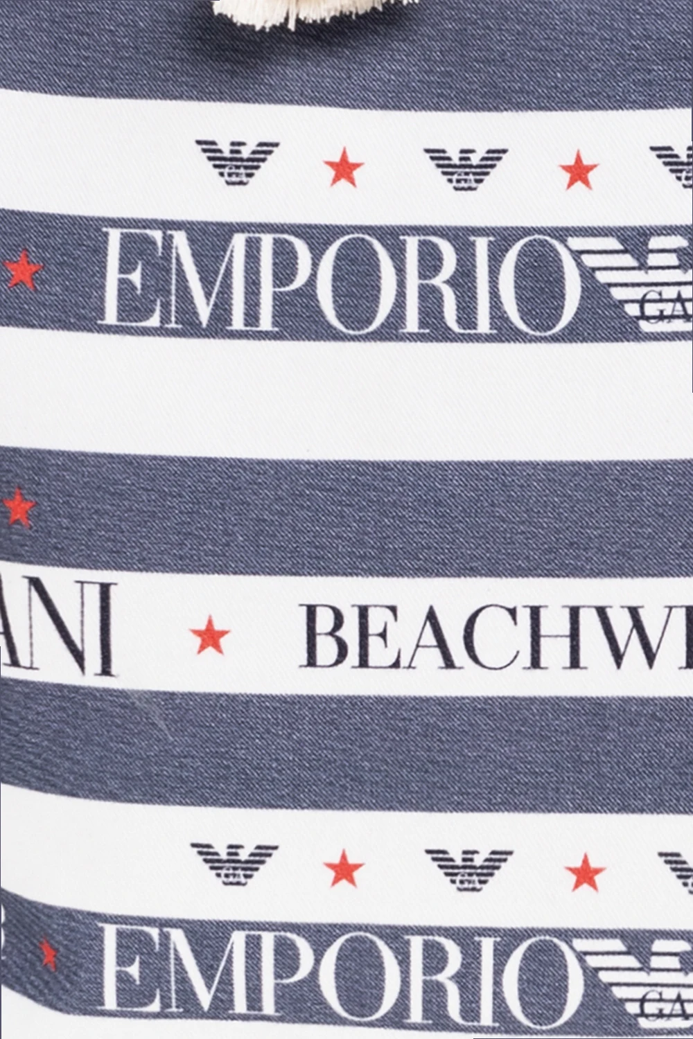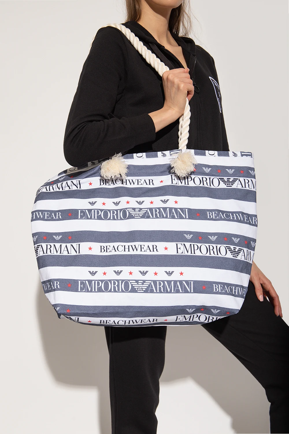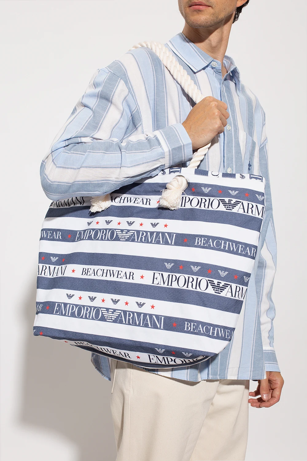 White and navy beach bag from Emporio Armani, the ‘Swimwear’ collection. Crafted from cotton, this design features a zip fastening, stripe pattern, red star, logo detail, two half-round handles, silver-tone metal hardware and one internal compartment with one zip pocket.