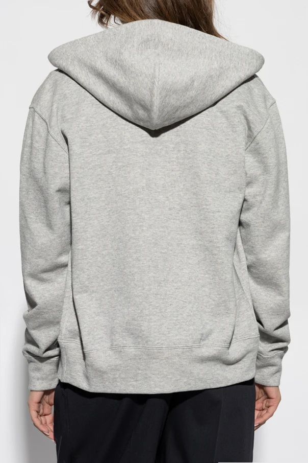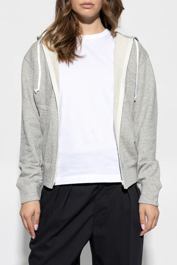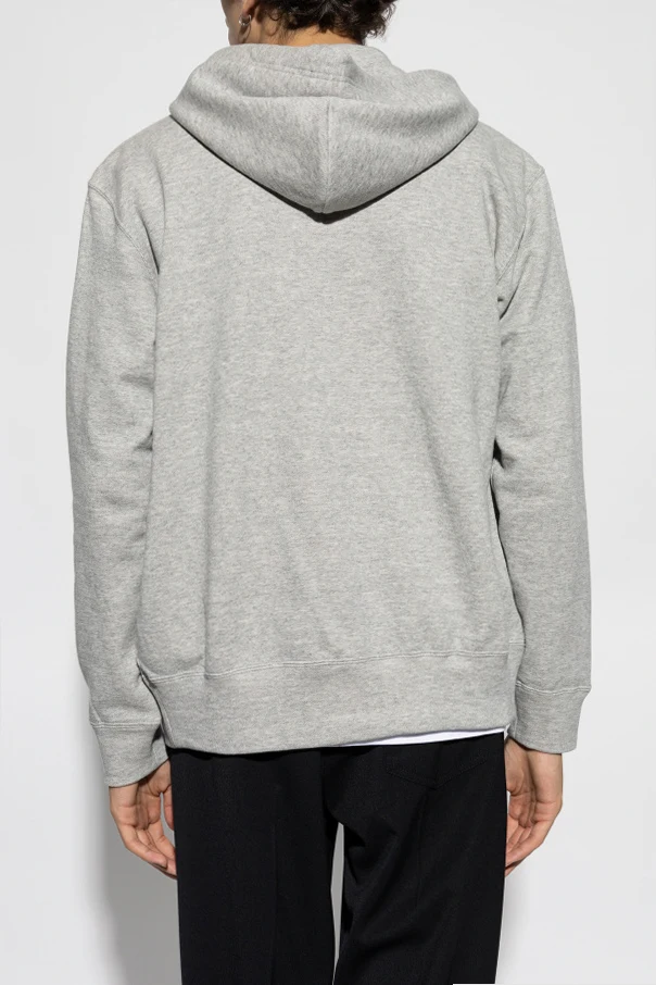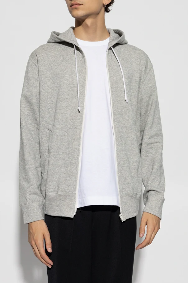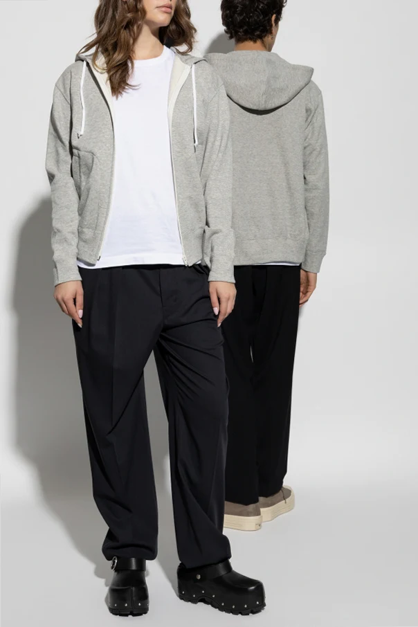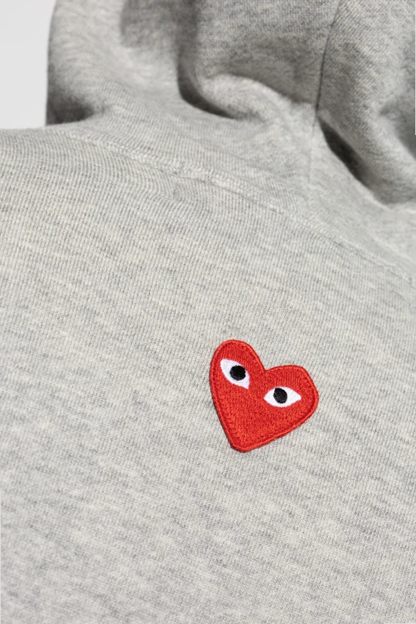 Introducing the Zip-Up Hoodie from the prestigious Comme des Garçons Play collection. This unisex garment epitomizes the perfect blend of comfort and style, crafted from premium gray fabric. Featuring a classic, straight cut with long sleeves, this hoodie exudes a minimalist elegance. It is adorned with a hood that can be adjusted using white drawstrings, and two convenient pockets at hip level, ensuring both functionality and aesthetic appeal. The hoodie is fastened with a white zipper that extends from the bottom edge to the top of the hood. On the chest, you'll find the iconic red heart with eyes logo, a hallmark of the renowned brand. Why Choose This Product? Crafted from soft, luxurious cotton for unparalleled comfort. Unisex design suitable for all genders. Iconic branding with the signature red heart logo. Versatile style that complements both casual and elegant outfits. Practical features including an adjustable hood and dual pockets.
