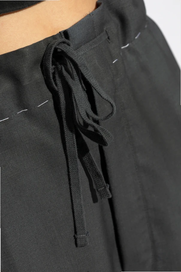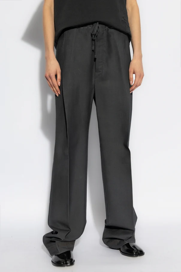 These pants feature an elastic waistband with a drawstring, blending modern comfort with timeless style. The meticulous stitching and subtle details highlight the unparalleled craftsmanship synonymous with the Maison Margiela brand. Completed with a hook and zip closure, and boasting four pockets—two slip and two buttoned, they offer both functionality and flair.