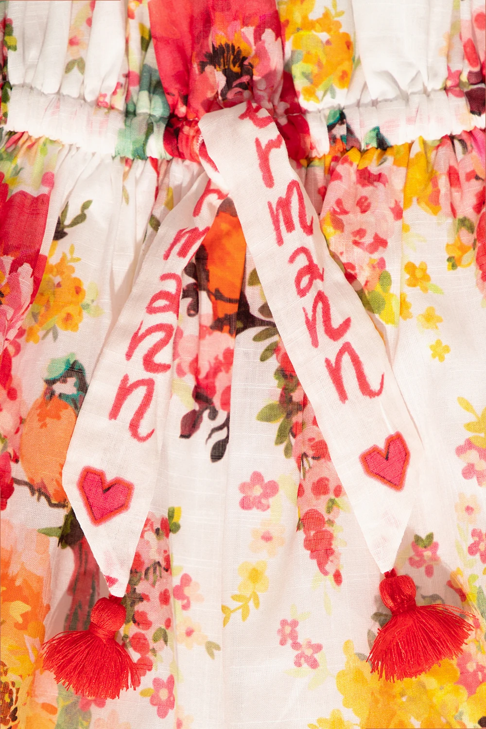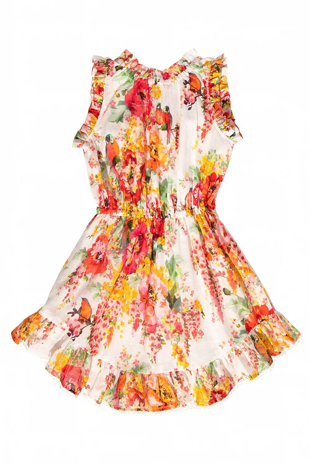 White sleeveless dress from Zimmermann Kids. Made of cotton, this design features a drawstring waist, round neck, multicolored floral print, decorative ruffle and lace trims.