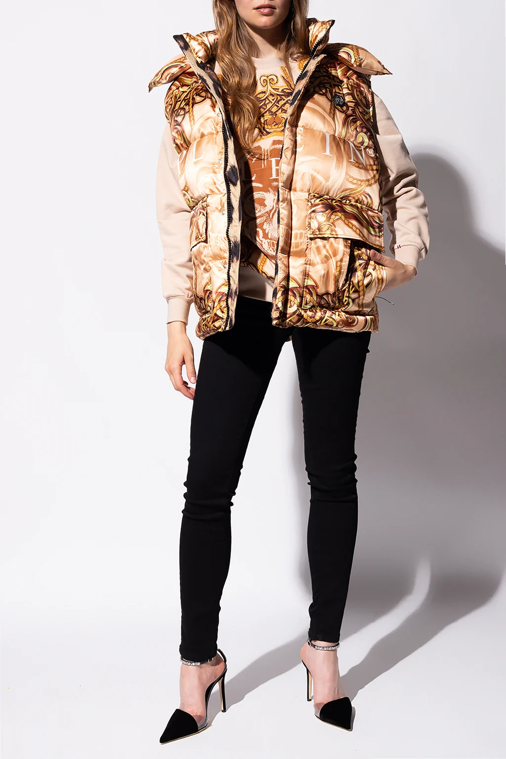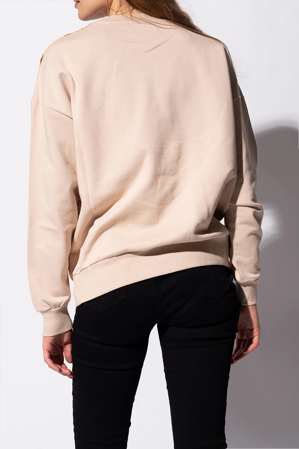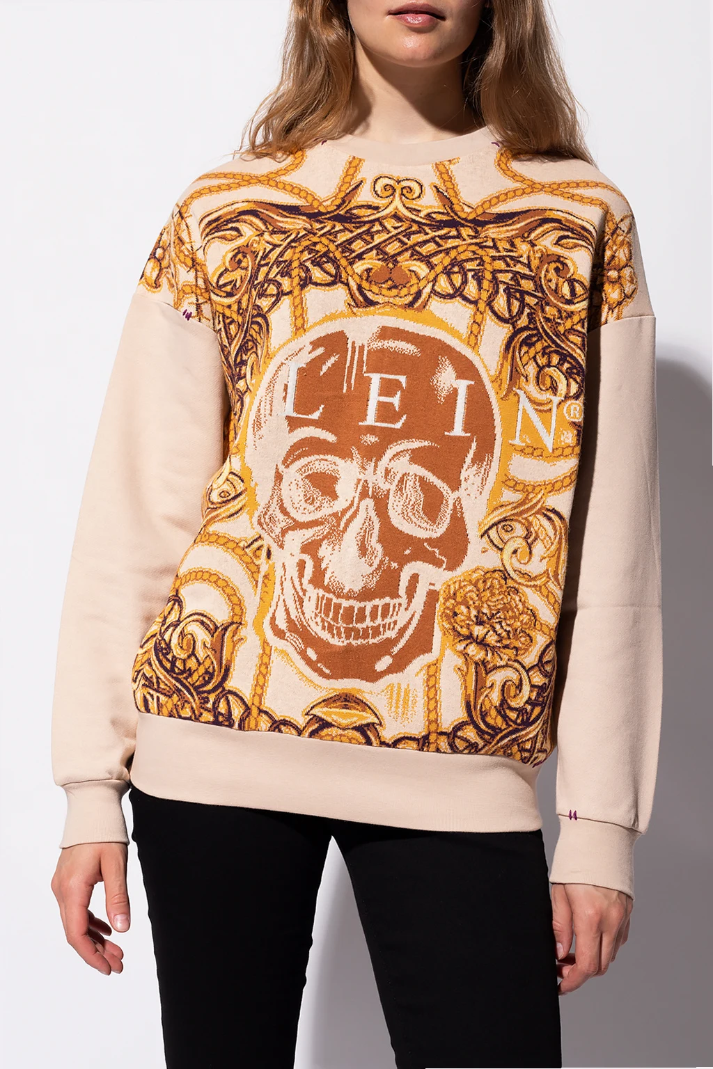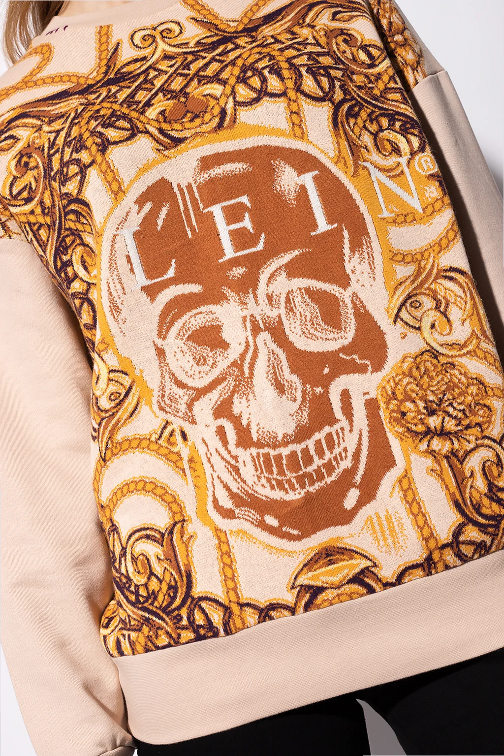Beige crewneck sweatshirt from Philipp Plein. Crafted from cotton jersey, this style showcases a jacquard pattern in brown and yellow and ribbed trims on the collar, bottom hem and cuffs.