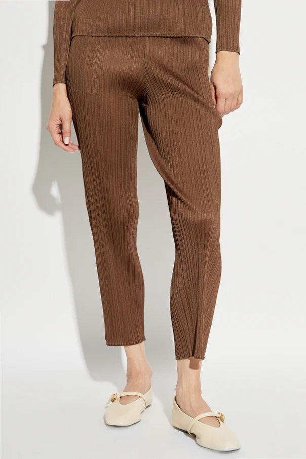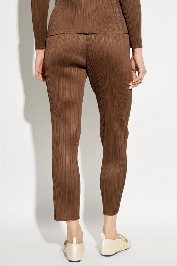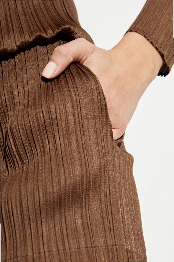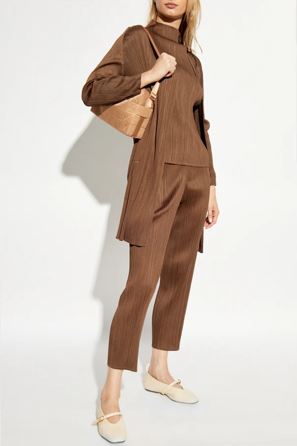 Immerse yourself in the effortless sophistication of these vivid green pleated trousers by Pleats Please Issey Miyake . Meticulously crafted from a lightweight, gently lustrous high-quality synthetic fabric, each pair showcases the brand’s signature all-over, deeply defined vertical pleats—imbuing the surface with striking depth and dynamic movement.
