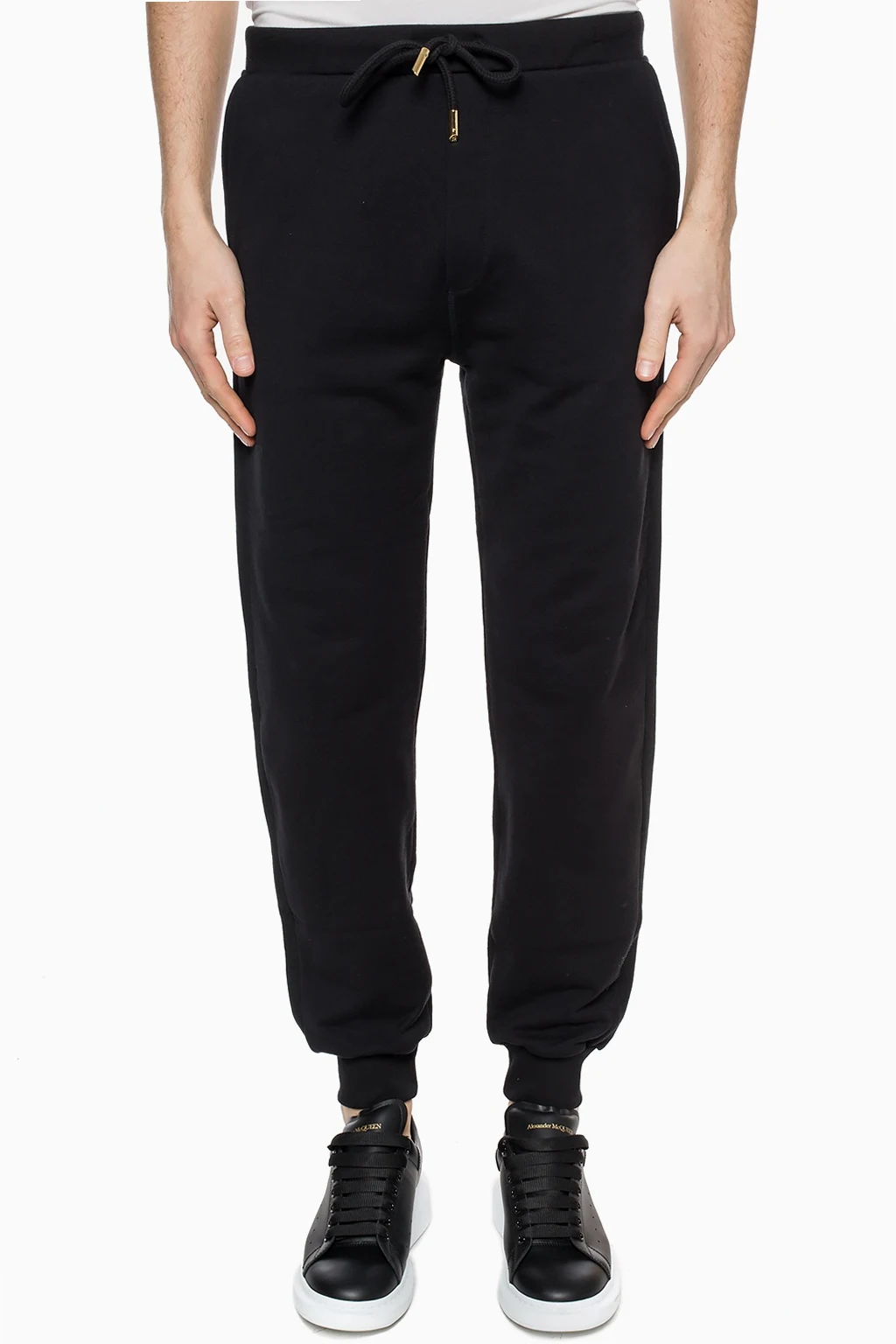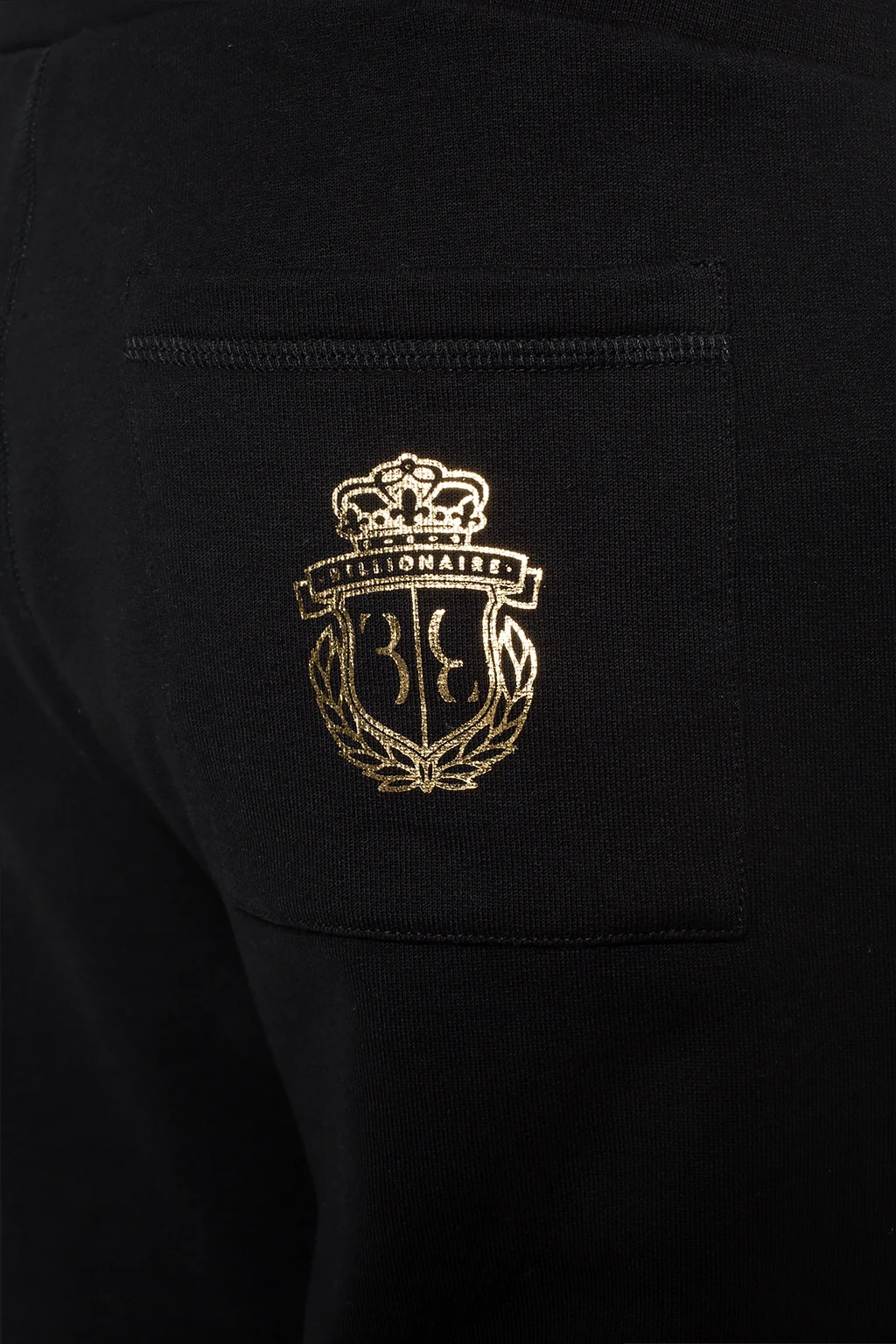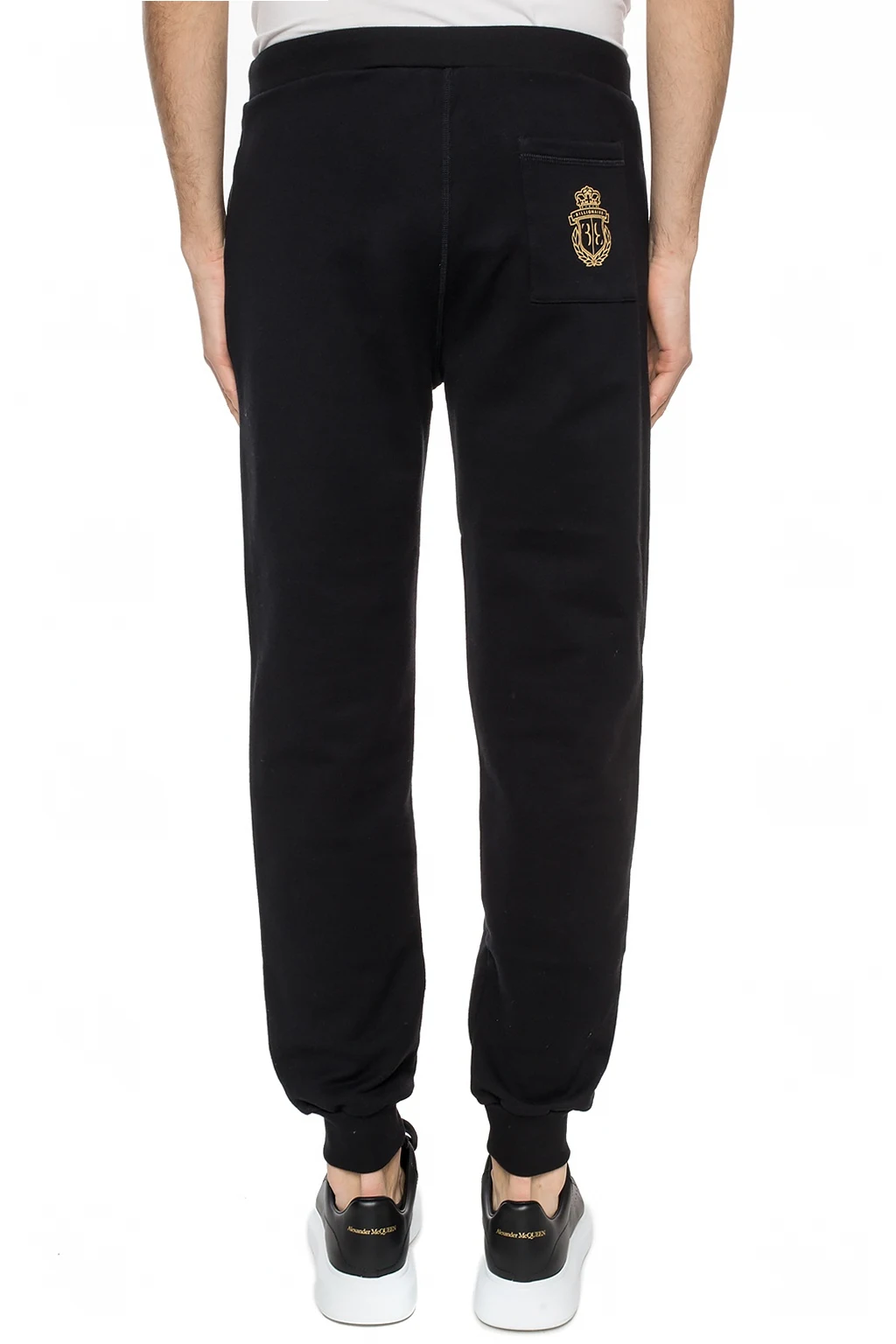 Black sweatpants from Billionaire. Made of cotton. Decorated with a gold-tone logo print. Three slip pockets – two on the front, one at the back. Drawstring waist. Wide, tapered legs with ribbed cuffs.