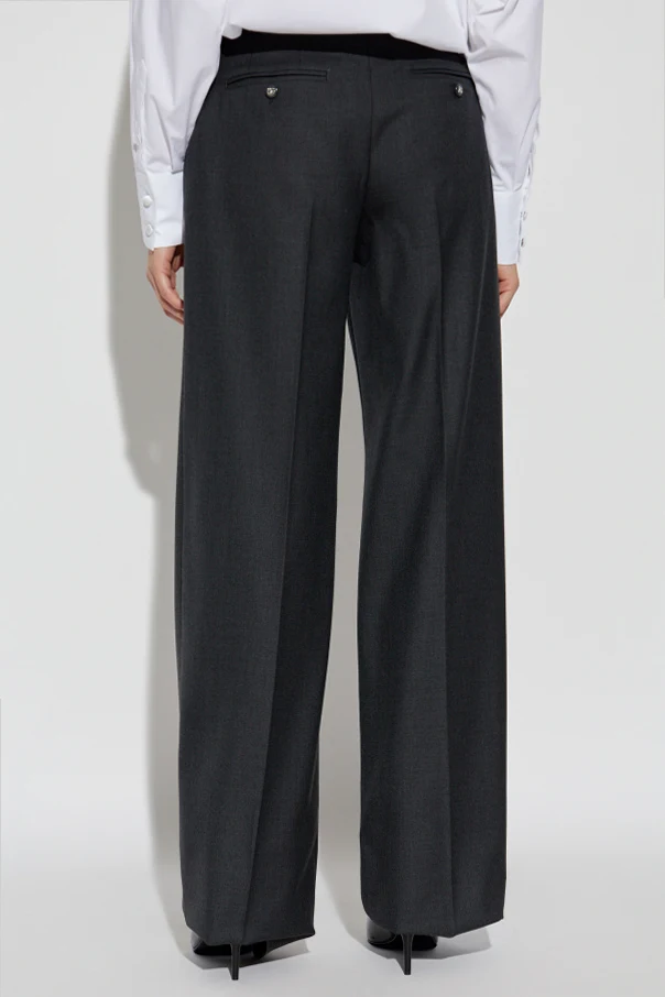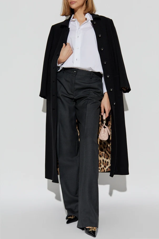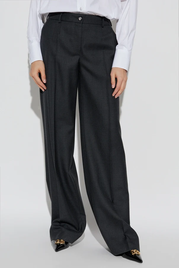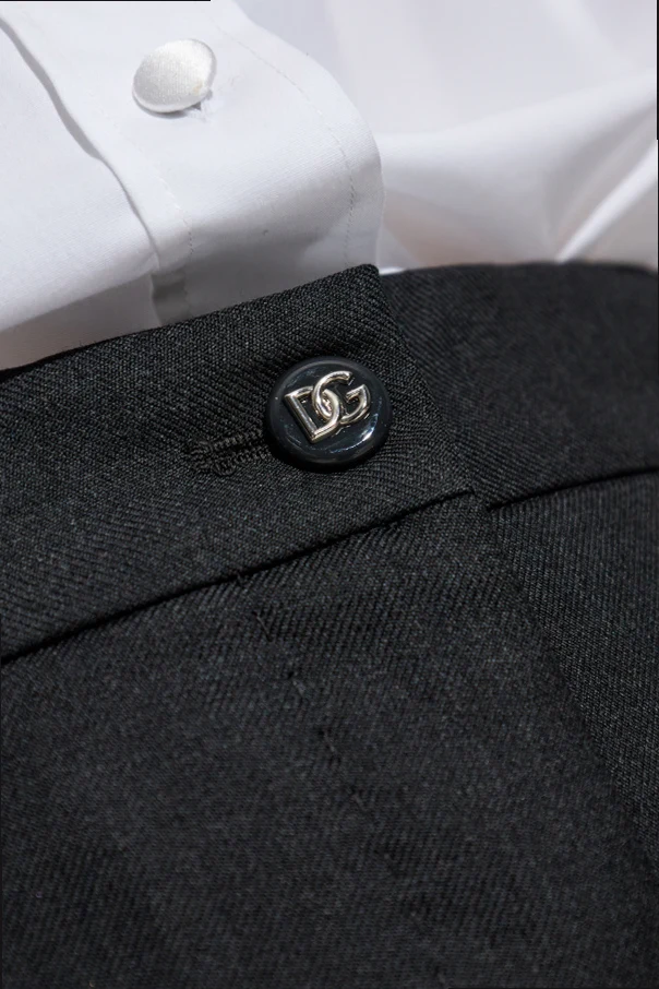 Introducing the Woolen Pleated Trousers by the illustrious Dolce & Gabbana , a masterpiece of sartorial elegance. These dark gray trousers epitomize sophistication, crafted from premium wool that ensures both luxury and comfort. The trousers feature a straight, wide-leg silhouette with a sharply defined pleat, exuding a formal allure. The mid-rise waist adds a touch of elegance while ensuring supreme comfort. Attention to detail is paramount, with a front closure comprising a button and zipper, adorned with the designer's logo, symbolizing prestige. Practicality meets style with the back pockets, fastened with buttons. Perfect for formal occasions, these trousers are versatile enough to complement a classic office ensemble, as demonstrated by their pairing with a white shirt and long coat. Why Choose This Product? Expertly crafted from high-quality wool for unmatched comfort. Distinguished design by renowned Italian brand Dolce & Gabbana. Formal yet versatile style suitable for a variety of elegant settings. Practical back pockets elevate functionality. Exclusive designer logo on the button, adding a touch of luxury.