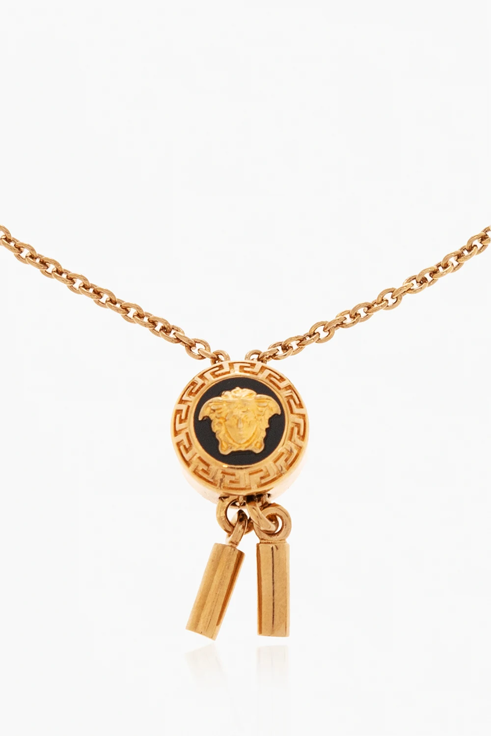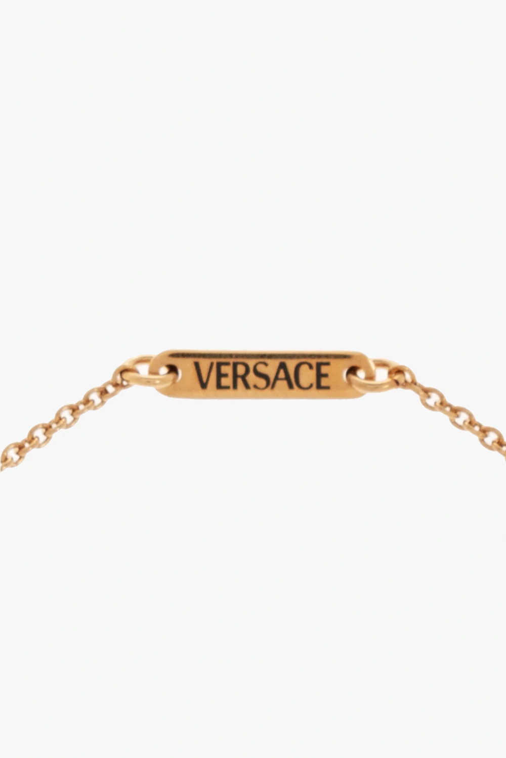 Gold-tone bracelet from Versace. Decorated with a logo-engraved charm, this item has a decorative closure with the iconic Greek pattern and Medusa head detail.