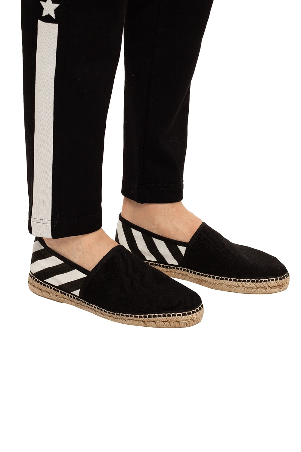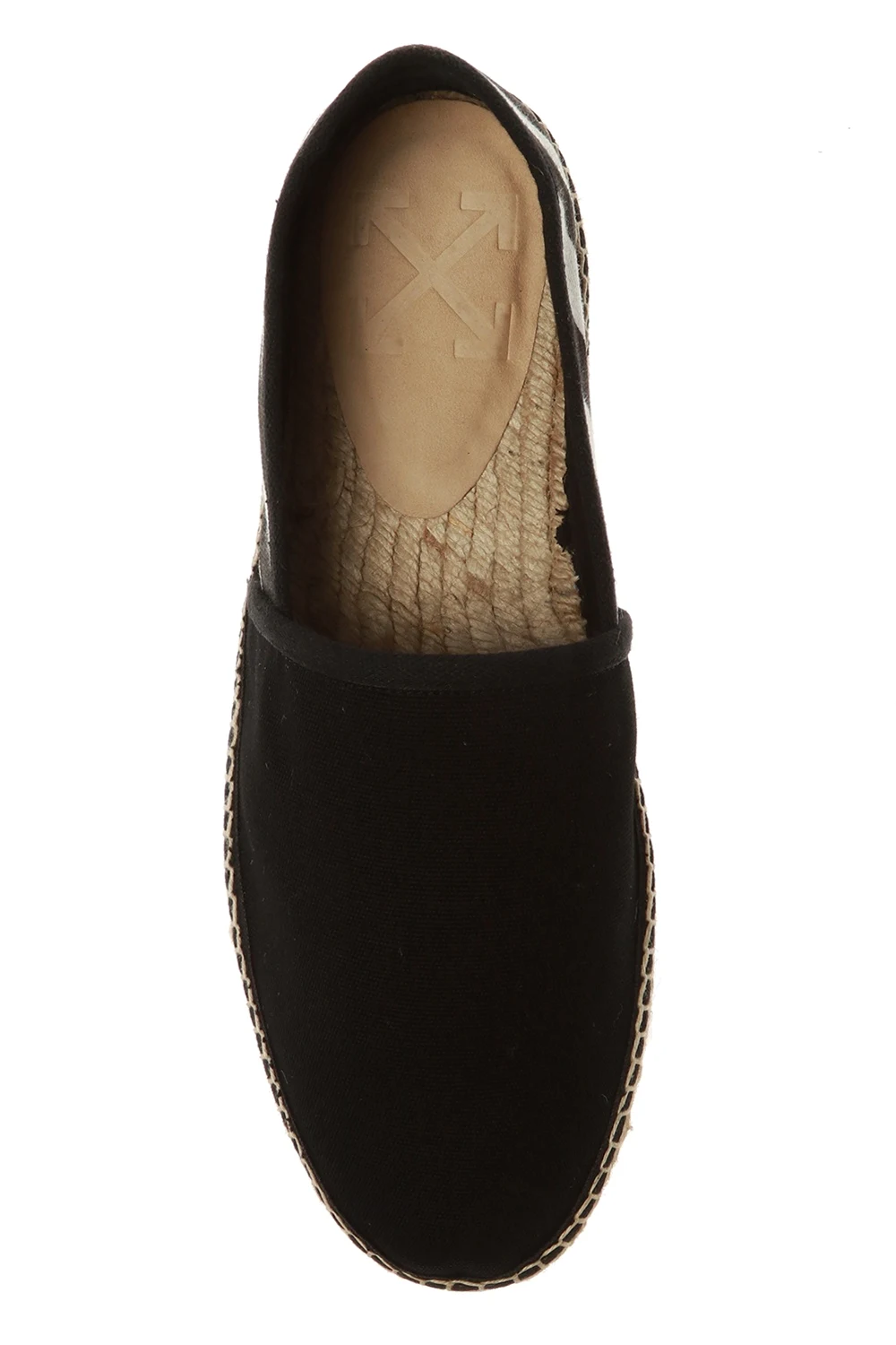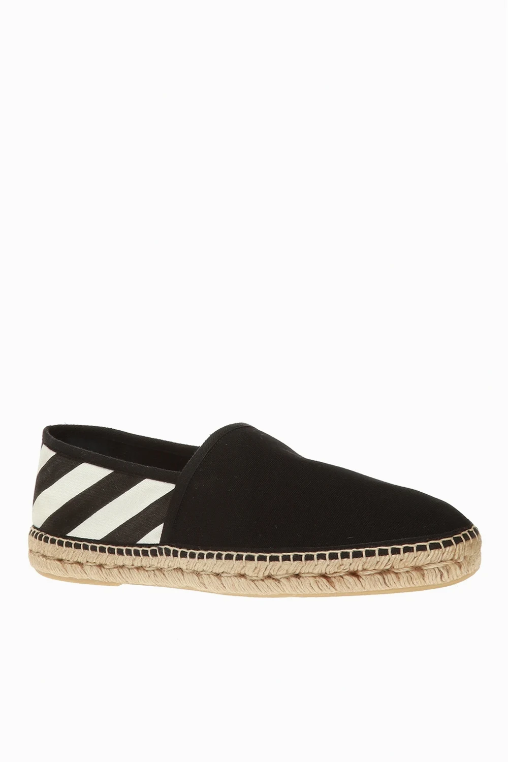 Black and white espadrilles from Off-White featuring printed brand's logo and beige rubber sole with braided overlay at the base.