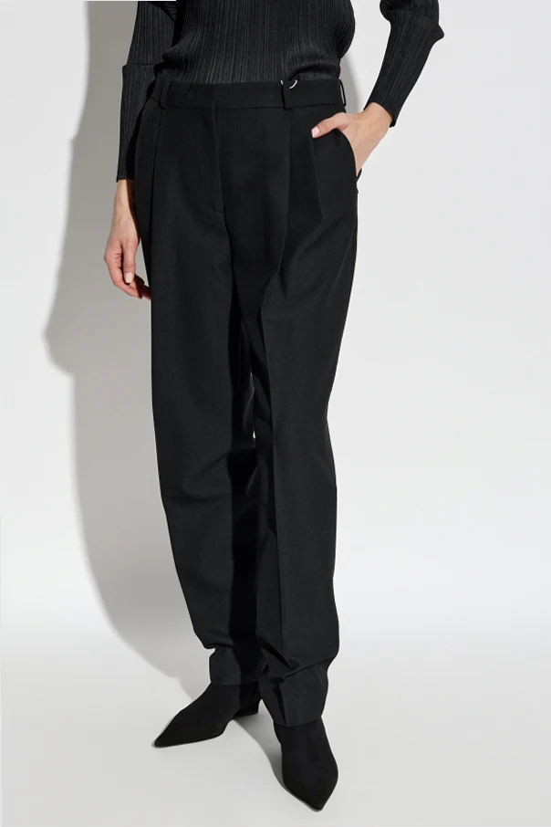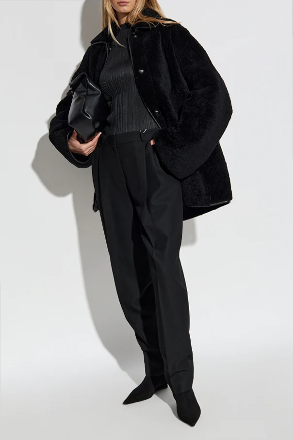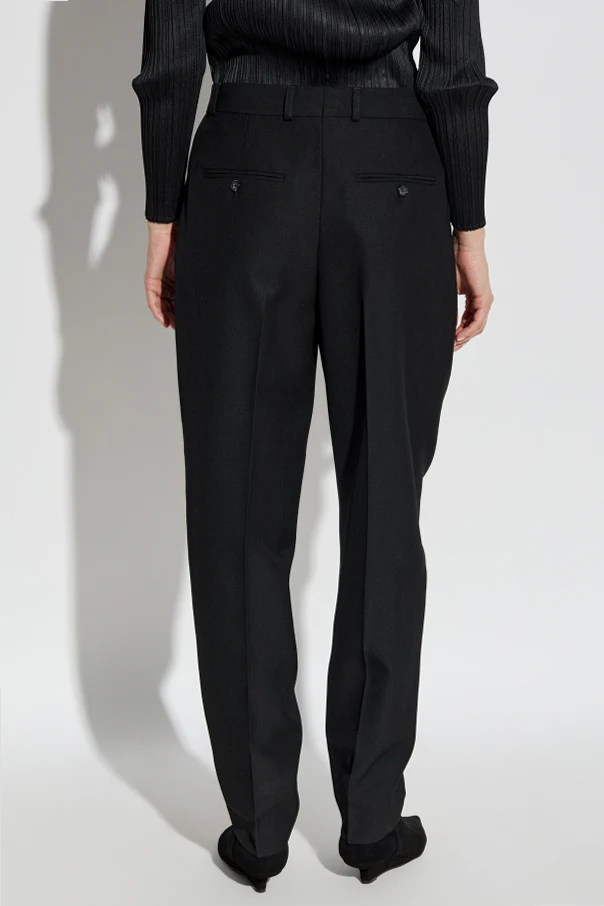 Introducing the Spodnie z kant , a timeless embodiment of sophistication and style brought to you by the esteemed designer, TOTEME . These elegant black trousers are a quintessential piece for any formal wardrobe, featuring a classic high-waist cut and straight-leg design, accentuated by a distinguished front crease. Crafted from a luxurious blend of recycled polyester and wool, the fabric drapes beautifully, offering both comfort and a refined silhouette. The trousers boast intricately placed pleats at the front, enhancing their elegant appearance, and are complemented by functional side pockets and button-secured back pockets for a touch of formality. Designed with versatility in mind, the trousers include belt loops, allowing for personalized styling with your choice of belt. Fastening with a discreet zipper and hook, these trousers ensure a seamless and polished look. Why Choose This Product? Expertly crafted from high-quality recycled materials. Four pockets for practicality and style. Perfect fusion of elegance and functionality. Designed by the iconic and progressive brand, TOTEME.