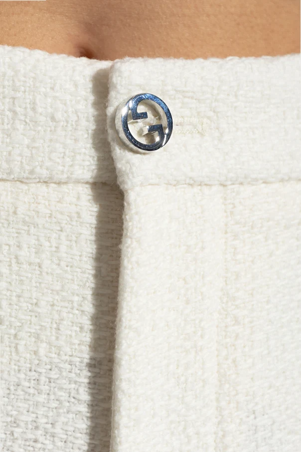 Indulge in the epitome of sartorial elegance with the Gucci Crease Pants . These exquisite pants, rendered in a sophisticated cream hue, boast a classic silhouette accentuated by a pronounced crease, epitomizing formal refinement. Crafted from a luxurious tweed-like fabric, these pants offer a tactile richness that bespeaks durability and opulence. Their ankle-grazing length and meticulous tailoring make them a versatile addition to any wardrobe, effortlessly transitioning from boardroom to evening soiree. An exquisite button closure adorned with the designer’s logo elevates the pants' exclusivity, while four discreet slip pockets offer functionality without compromising the sleek design. As part of the visionary collection under creative director , these pants exemplify the brand's commitment to innovative style and Italian craftsmanship. Why choose this product? Elegant classic fit with a luxurious tweed-like texture. Signature designer details for a touch of exclusivity. Functional with four slip pockets. Crafted under the renowned Gucci brand.