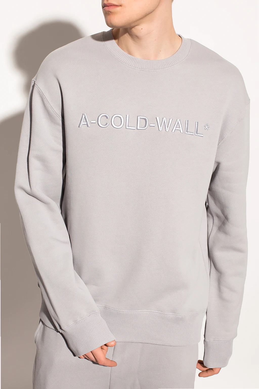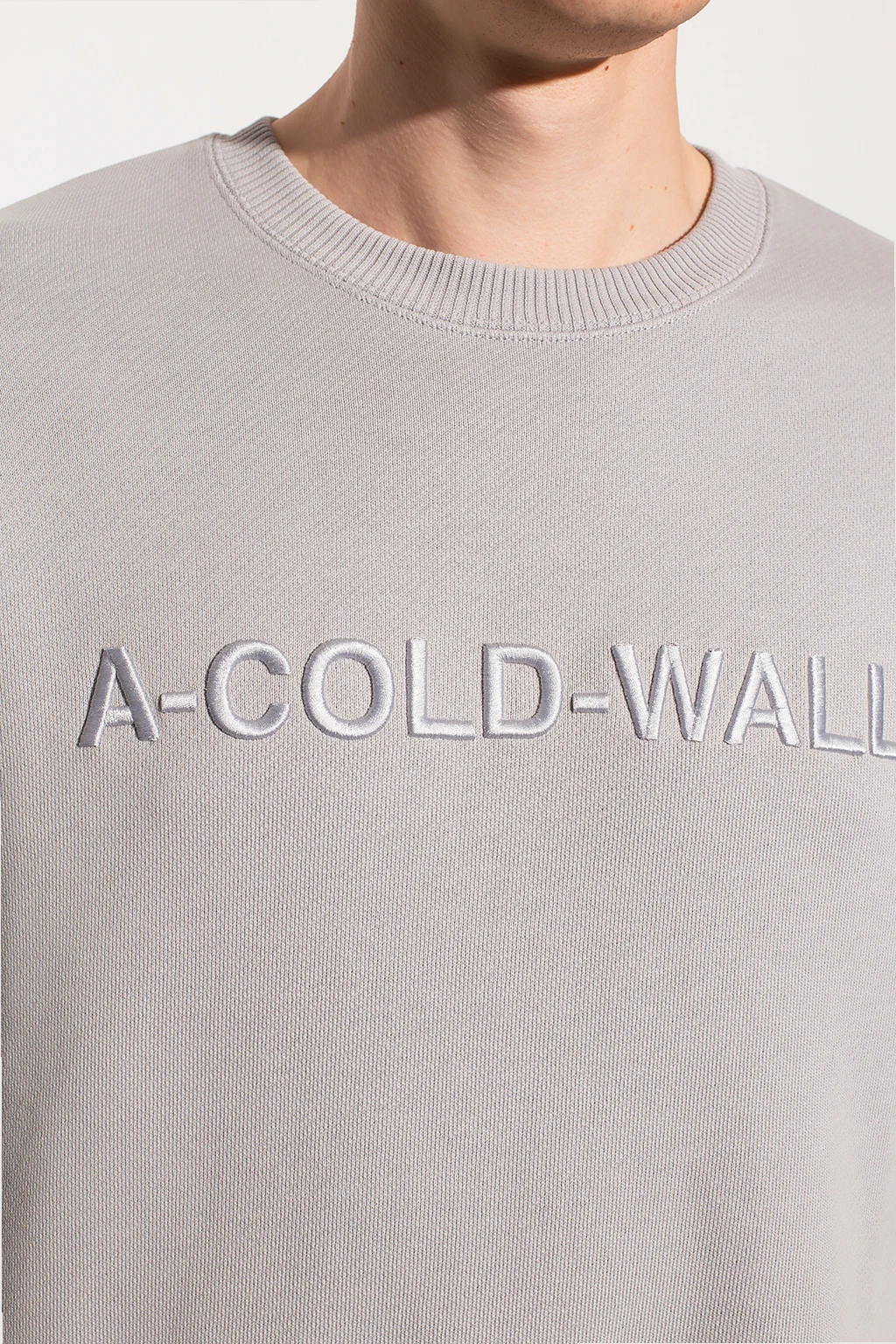 Grey crewneck sweatshirt from A Cold Wall. Crafted from cotton, this style showcases an embroidered logo on the front and ribbed trims on the bottom hem and cuffs.