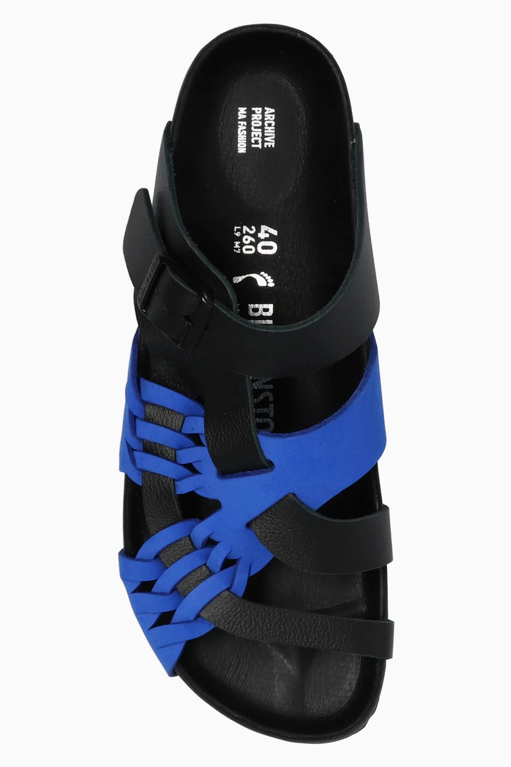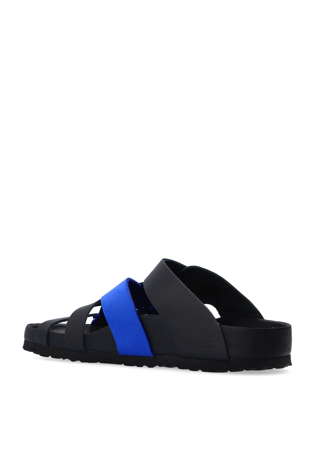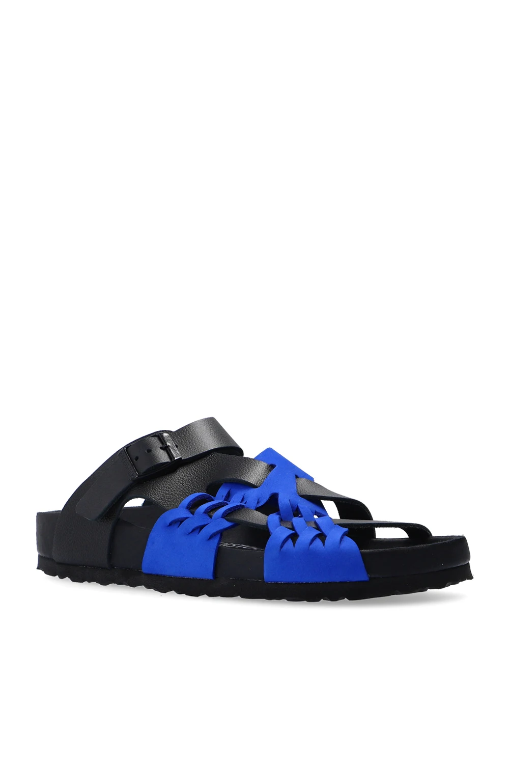 Black and navy blue ‘Tallahassee’ slides from Birkenstock x CSM. Crafted from leather, this pair sits on a black EVA foam sole and features woven details and a strap with a logo-embossed buckle.
