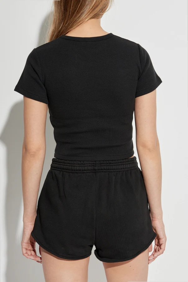 The black washed T-shirt, with its fitted short silhouette, boasts a classic round neckline and short sleeves, ensuring a timeless yet contemporary appeal. Its understated design is a testament to the superior quality synonymous with renowned designers.