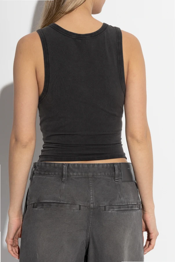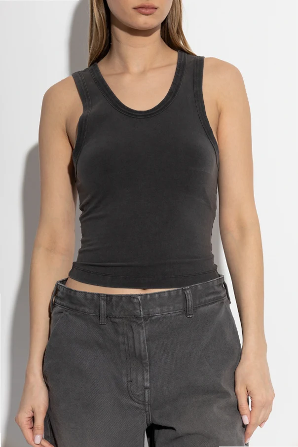 Introducing the exquisite black Cropped Top from the exclusive collection by ENTIRE STUDIOS . This top embodies minimalistic elegance with its fitted silhouette and tank top cut, designed to accentuate the body's natural contours. Crafted from a luxurious blend of organic cotton and elastane, the fabric is smooth and elastic, ensuring unparalleled comfort and ease of wear. The meticulous finishing along the edges adds an extra touch of sophistication, making it a standout piece in any wardrobe. The top's dominant black hue, with a washed finish, complements its modern aesthetic, offering versatility to seamlessly integrate with various outfits. Why choose this product? Exclusivity: Part of an exclusive collection. Comfort: Made from soft, elastic materials. Versatility: Easily pairs with other wardrobe pieces. Elegance: Sophisticated finished edges.