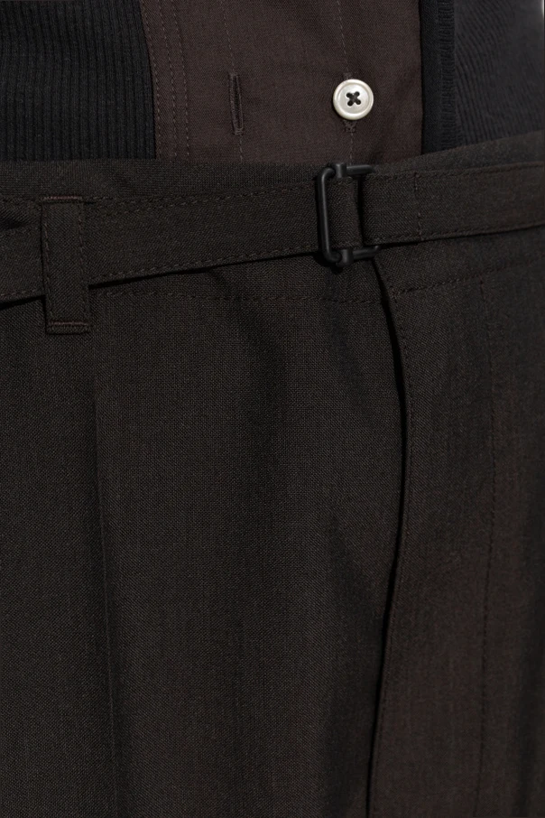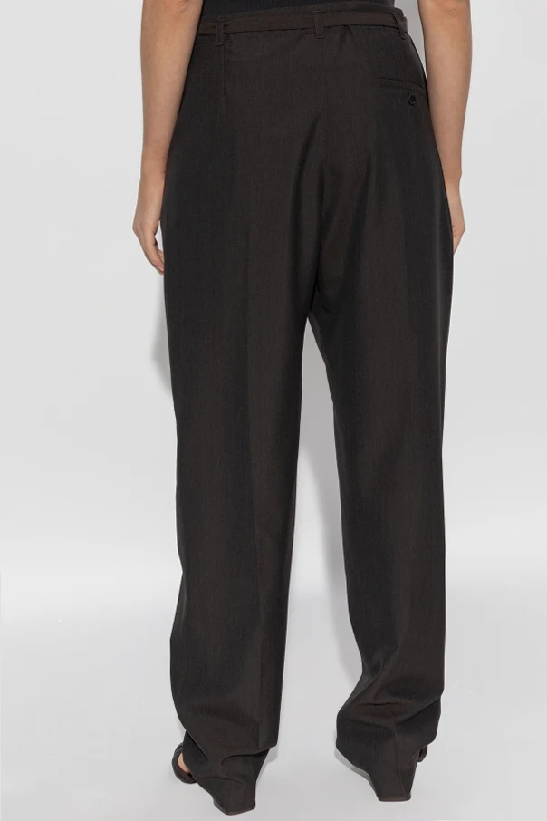 Introducing the Spodnie w Kant by the illustrious designer Lemaire , a paragon of sartorial elegance. These trousers, part of an exclusive collection, exude sophistication through their timeless design and exquisite craftsmanship. Constructed with an artful blend of polyester and wool , these trousers offer both durability and luxurious comfort. The rich brown hue enhances their formal appeal, making them an ideal choice for discerning occasions. The trousers feature a classic cut with straight legs and a subtle crease, epitomizing refined style. A belt with an adjustable buckle ensures a tailored fit, while the button and zip closure secures them with ease. Thoughtfully designed, they include side pockets and a buttoned back pocket , merging utility with elegance. Why Choose This Product? Exquisite blend of polyester and wool for comfort and durability. Adjustable belt with a buckle for a personalized fit. Thoughtful design with practical pockets for convenience. Part of an exclusive collection by the renowned designer Lemaire.