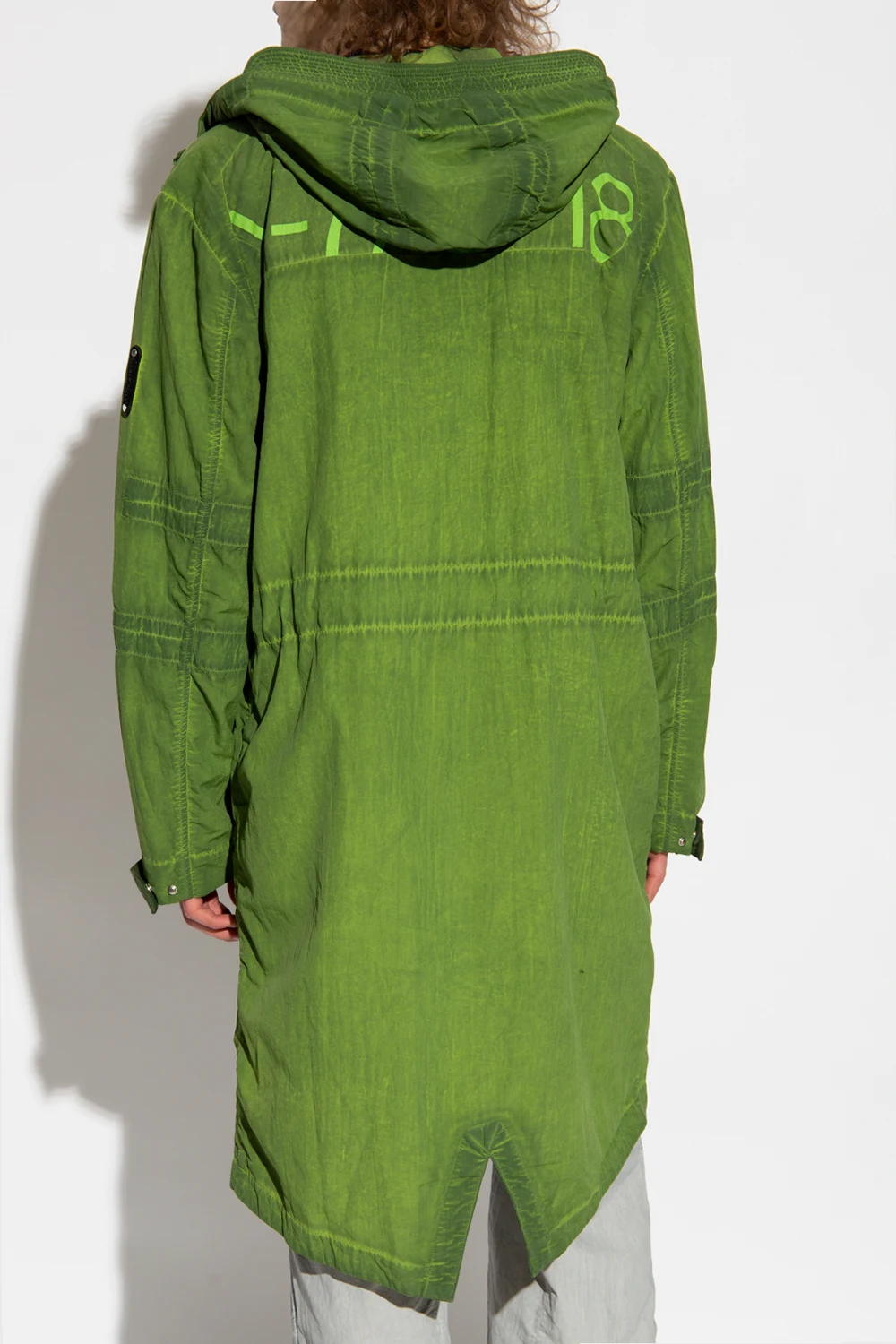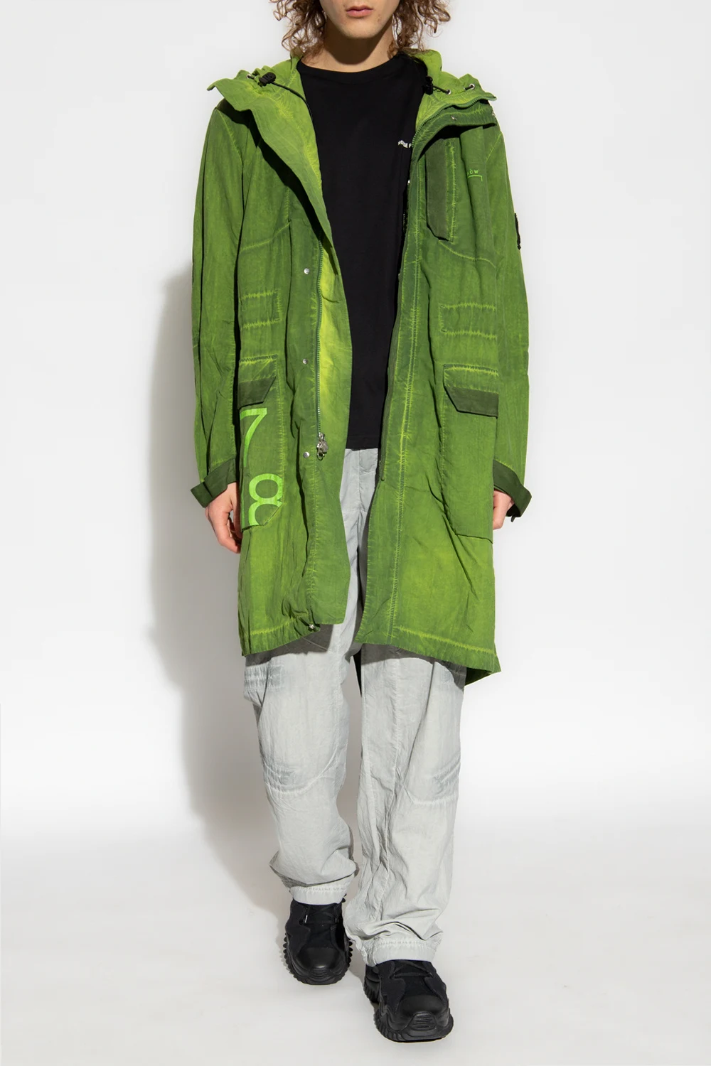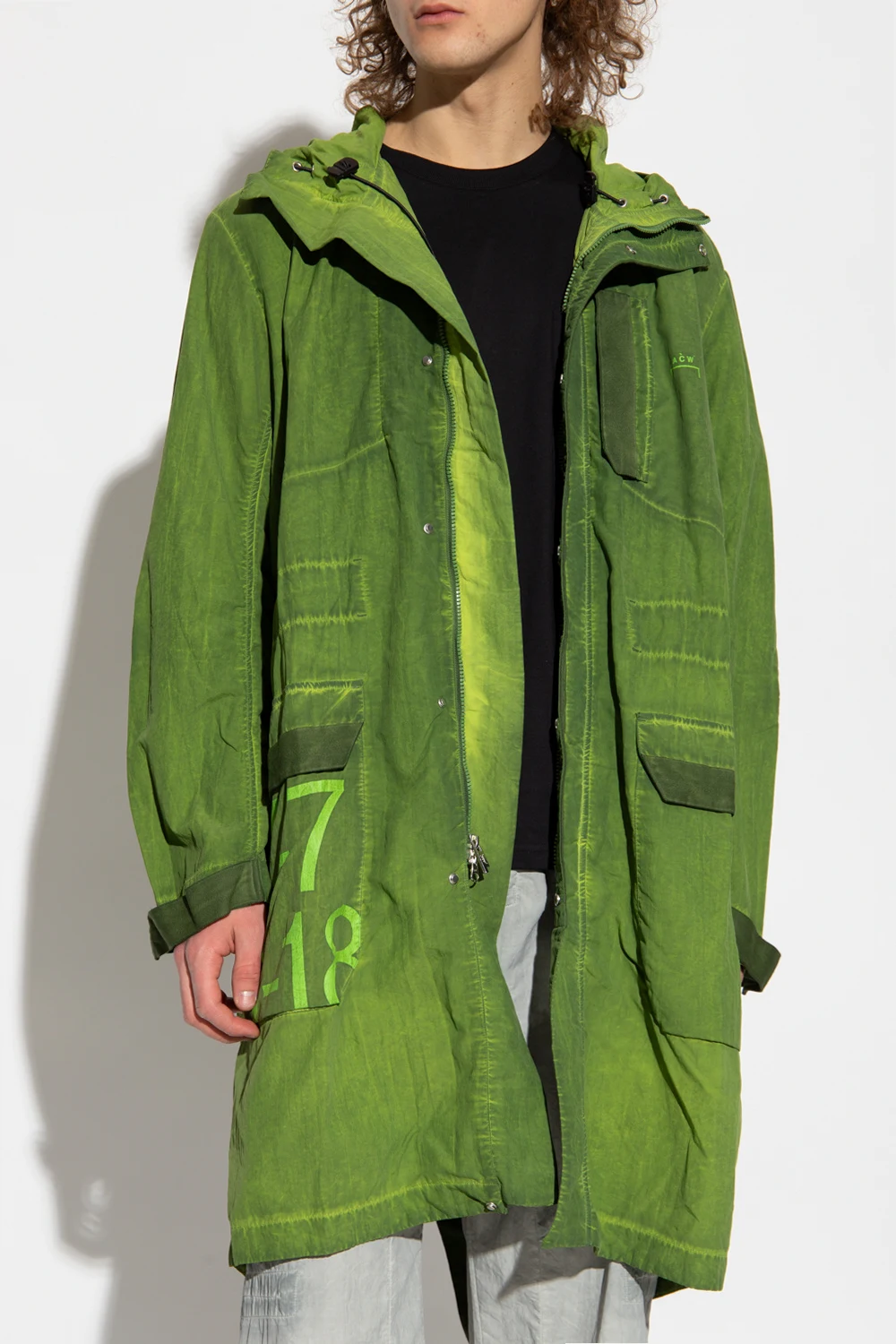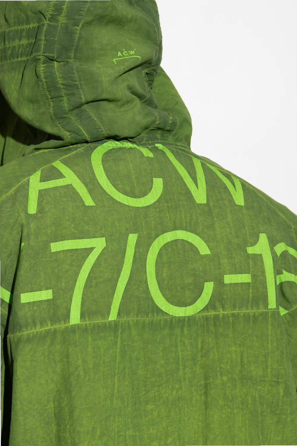 Green hooded jacket with a vintage effect from A-COLD-WALL*. Printed with the brand's logo, this style fastens with a two-way zipper and snaps and features a waist-cinching drawstring belt, three snap-fastened cuffs and long sleeves.