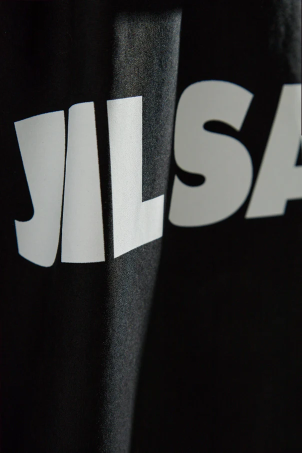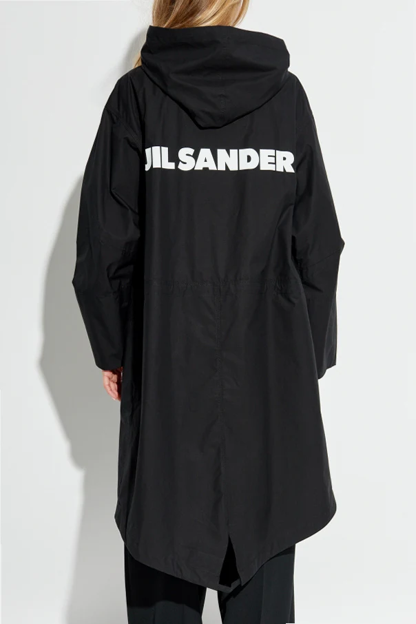 Adding an element of distinctive charm, the back is emblazoned with a bold "JIL SANDER" insignia in a striking contrast. This parka's asymmetrical hemline further enhances its unique character, embodying the brand's signature blend of sleek simplicity and avant-garde flair.