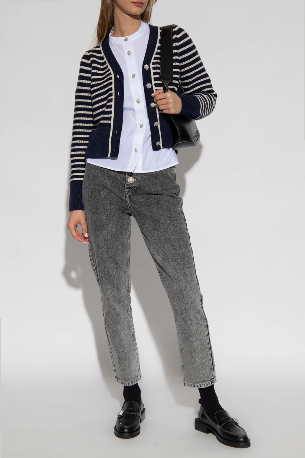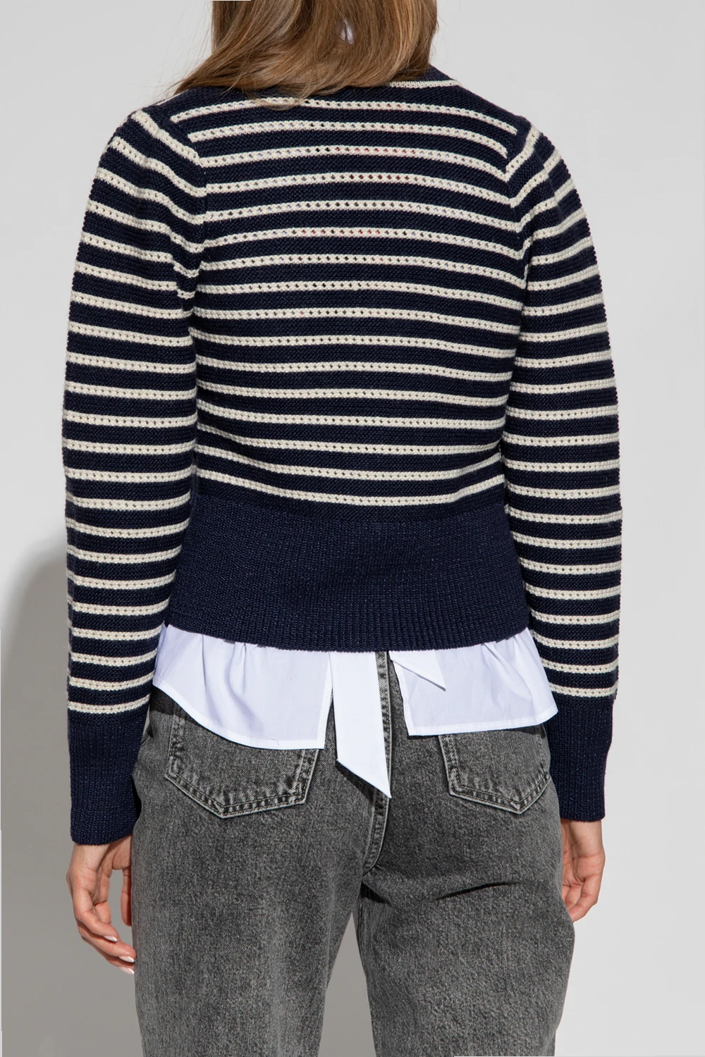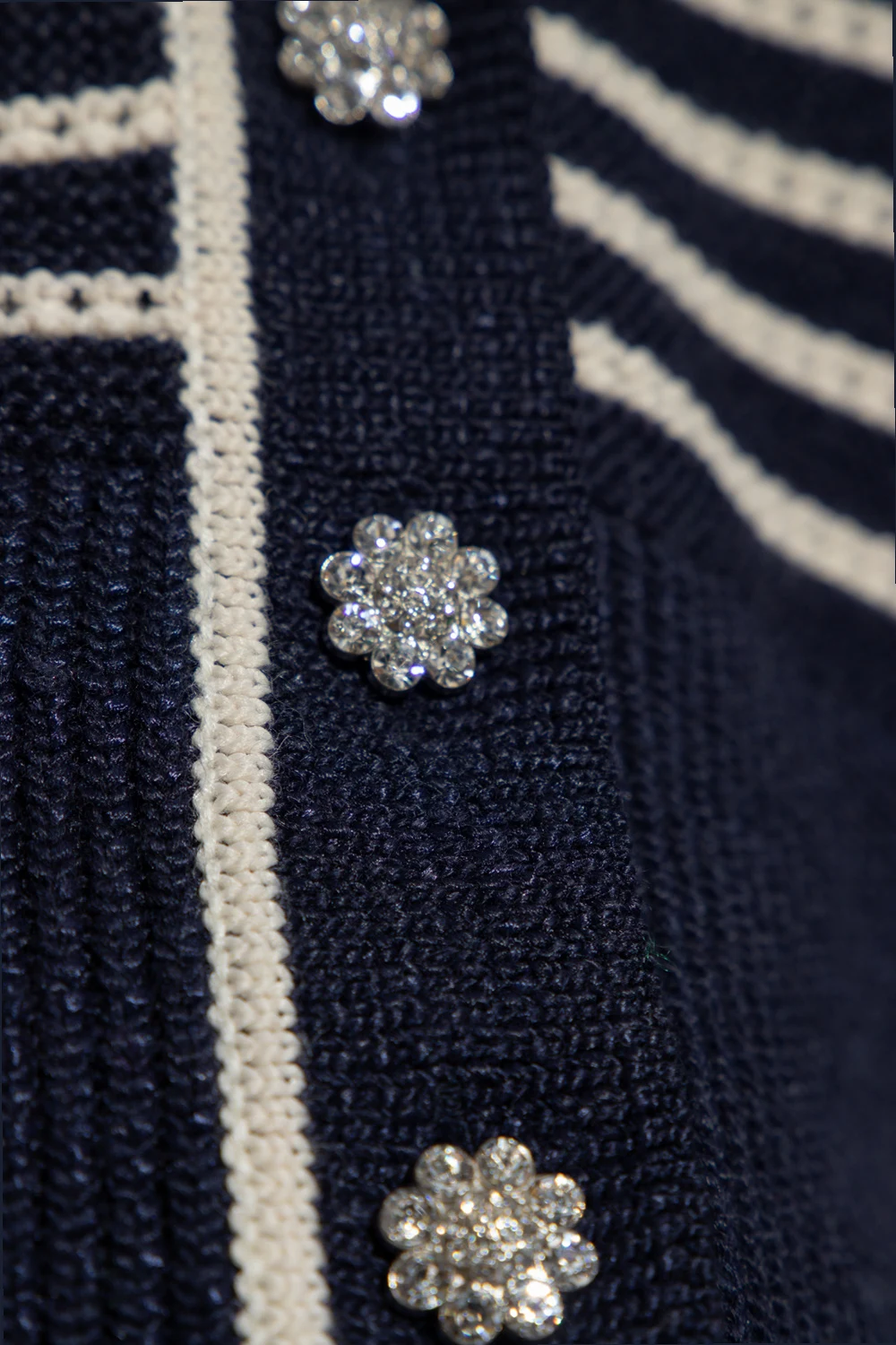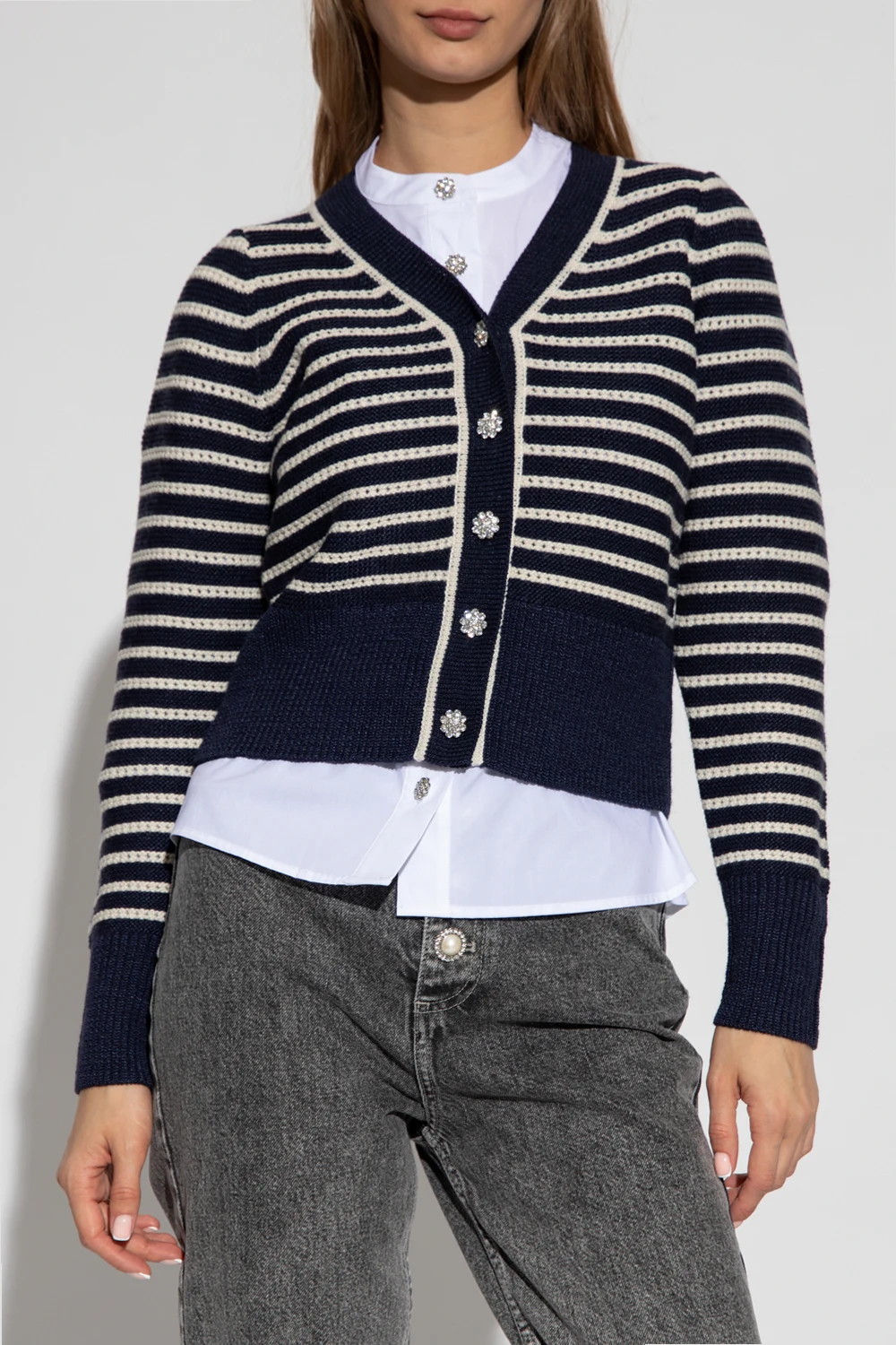 Navy blue and cream ‘Thuva’ from Custommade. Knitted from cotton, this style features a stripe pattern, a V-neckline, long sleeves and glossy buttons.