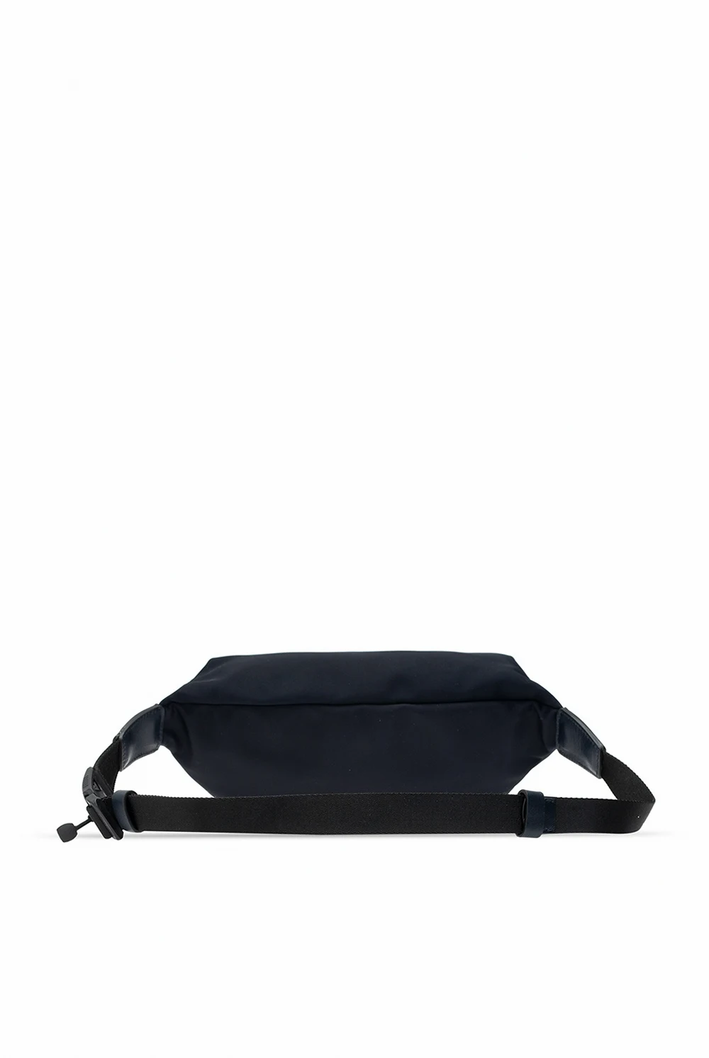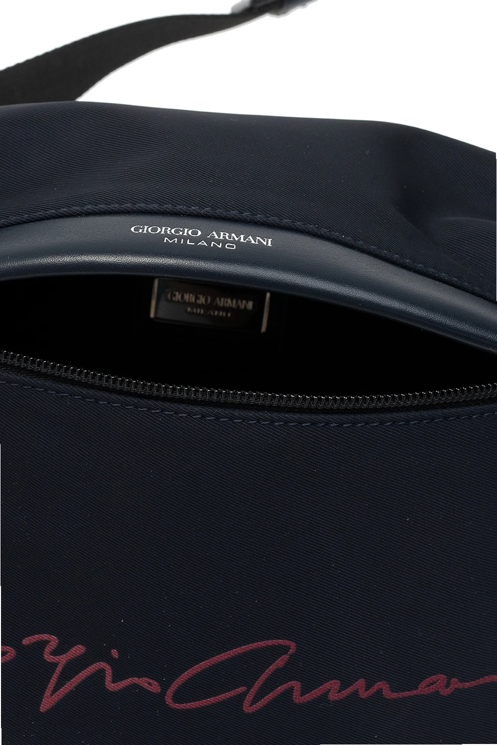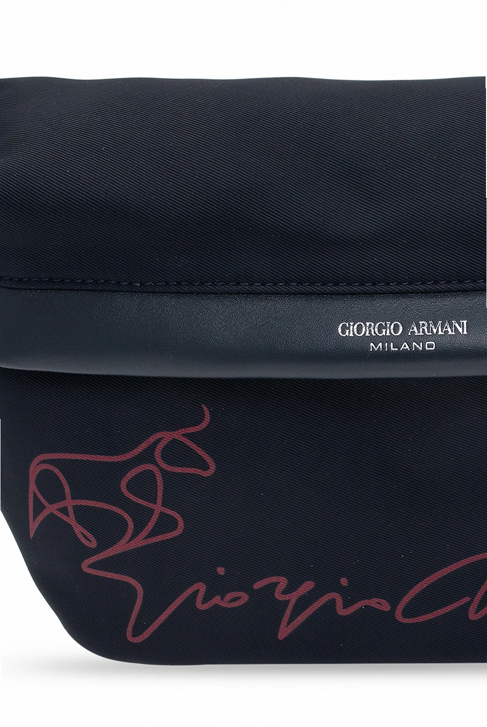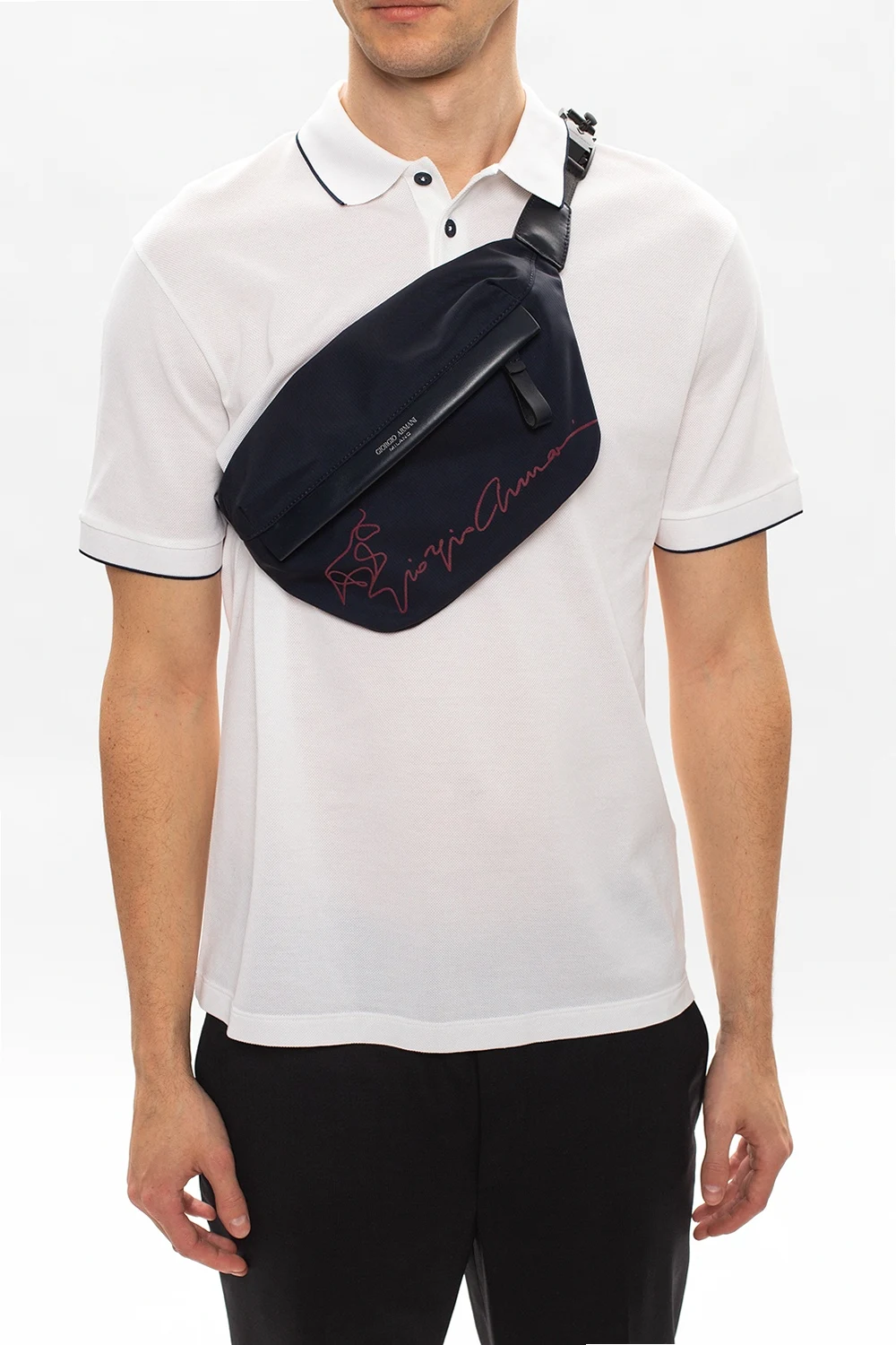 Black belt bag from Giorgio Armani. Trimmed with calf leather, this design features a zip fastening, printed logo pattern in silver-tone and red, adjustable belt and one internal compartment with one slip pocket.