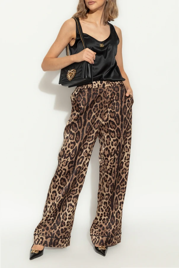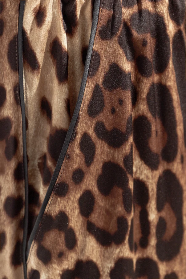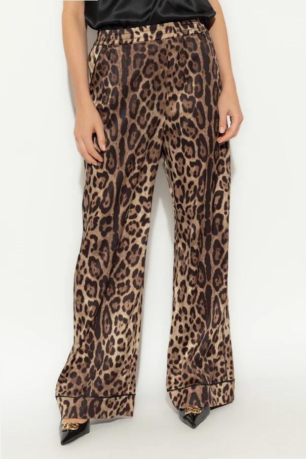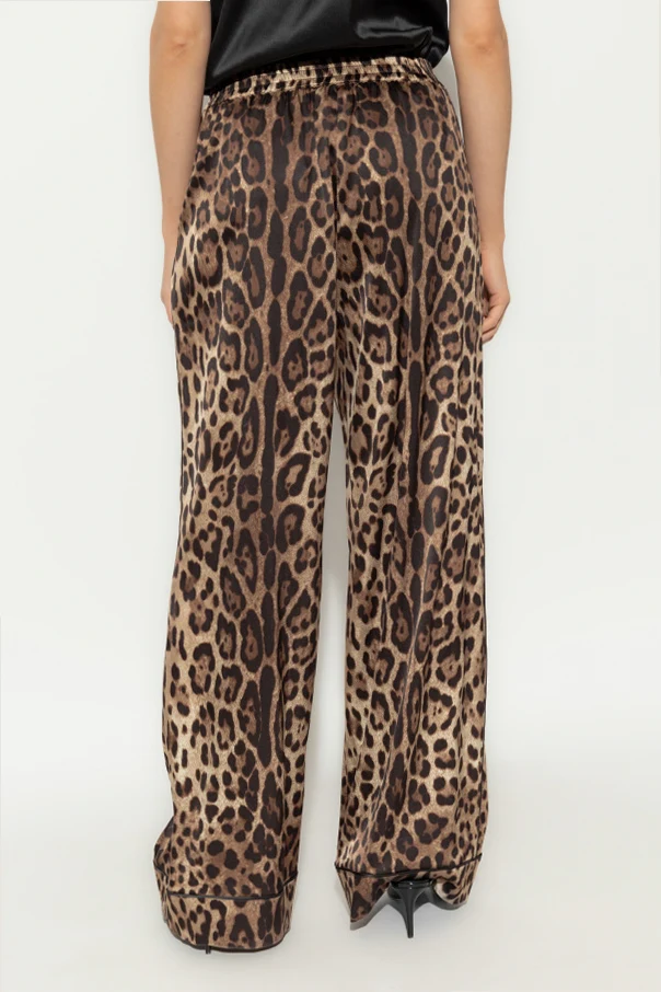 Introducing the Silk Animal Print Trousers by the esteemed Dolce & Gabbana , an epitome of refined elegance. These trousers, with their striking leopard-inspired pattern, boast a dominant brown hue accentuated by darker and lighter tones, creating a captivating visual appeal. Crafted from luxurious silk, these trousers offer a sumptuous sheen and a flowing structure that ensures unparalleled comfort. The wide-leg silhouette exudes a relaxed sophistication, while the elastic waistband provides a perfect fit for all-day wear. Delicate piping along the side seams adds a touch of subtle refinement, underscoring the meticulous attention to detail characteristic of Dolce & Gabbana . Why Choose This Product? Exquisite leopard print design for a bold fashion statement. Made from premium silk for a luxurious feel and look. Wide-leg cut offers a chic, relaxed fit. Elastic waistband ensures comfort and versatility. Meticulously crafted by the iconic Dolce & Gabbana .